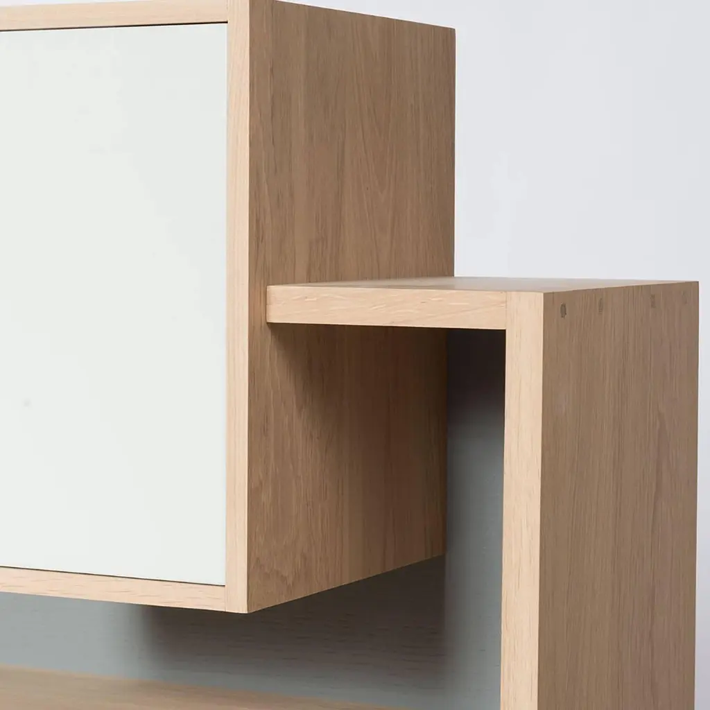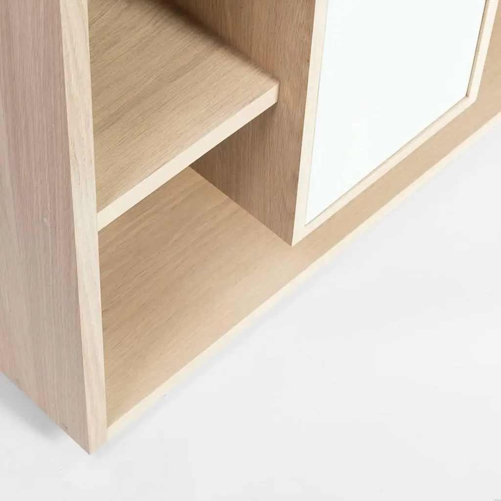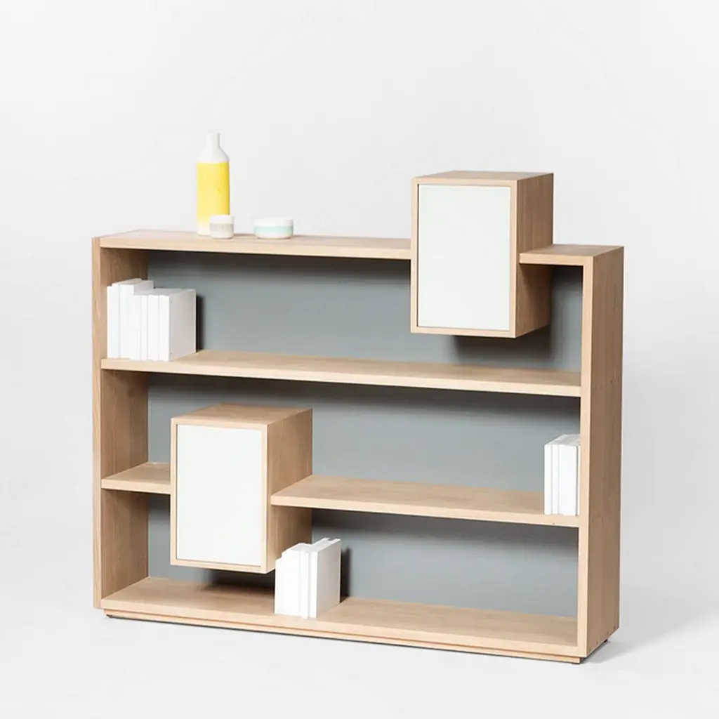 Shelve functional 100% solid French raw oak, from sustainableForests, France. With grey back and two white doors. Back and Doors colors can be selected in different colors, on request. From Anjou in France.Available in raw oak, price: 2150€Available in varnished oak, price: 2400,00€.