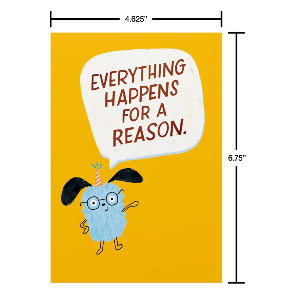 Add a smile to their special day with this cheeky birthday card. The front features the message 'Everything happens for a reason,' which playfully continues inside, providing a humorous twist on aging. This gems of wisdom card is sure to bring a giggle or two, making it a memorable part of their birthday. Perfect for close friends or family with a good sense of humor. Envelope included for easy sending.