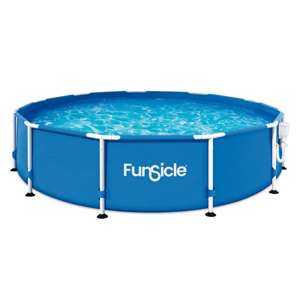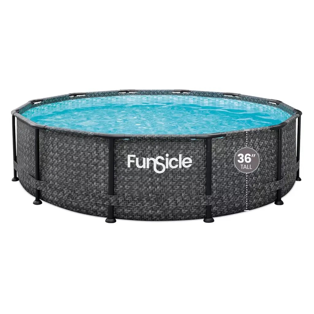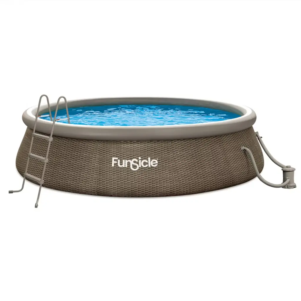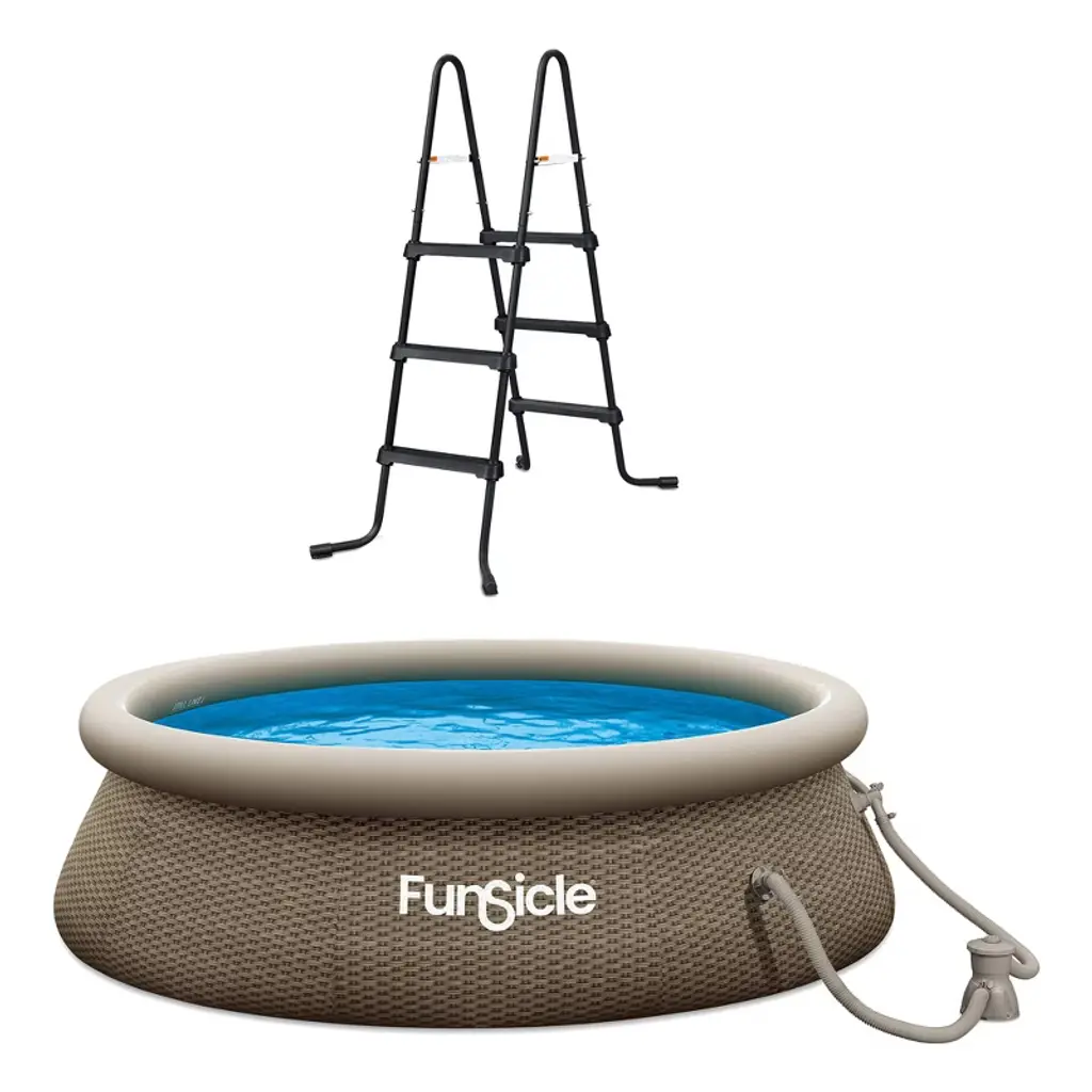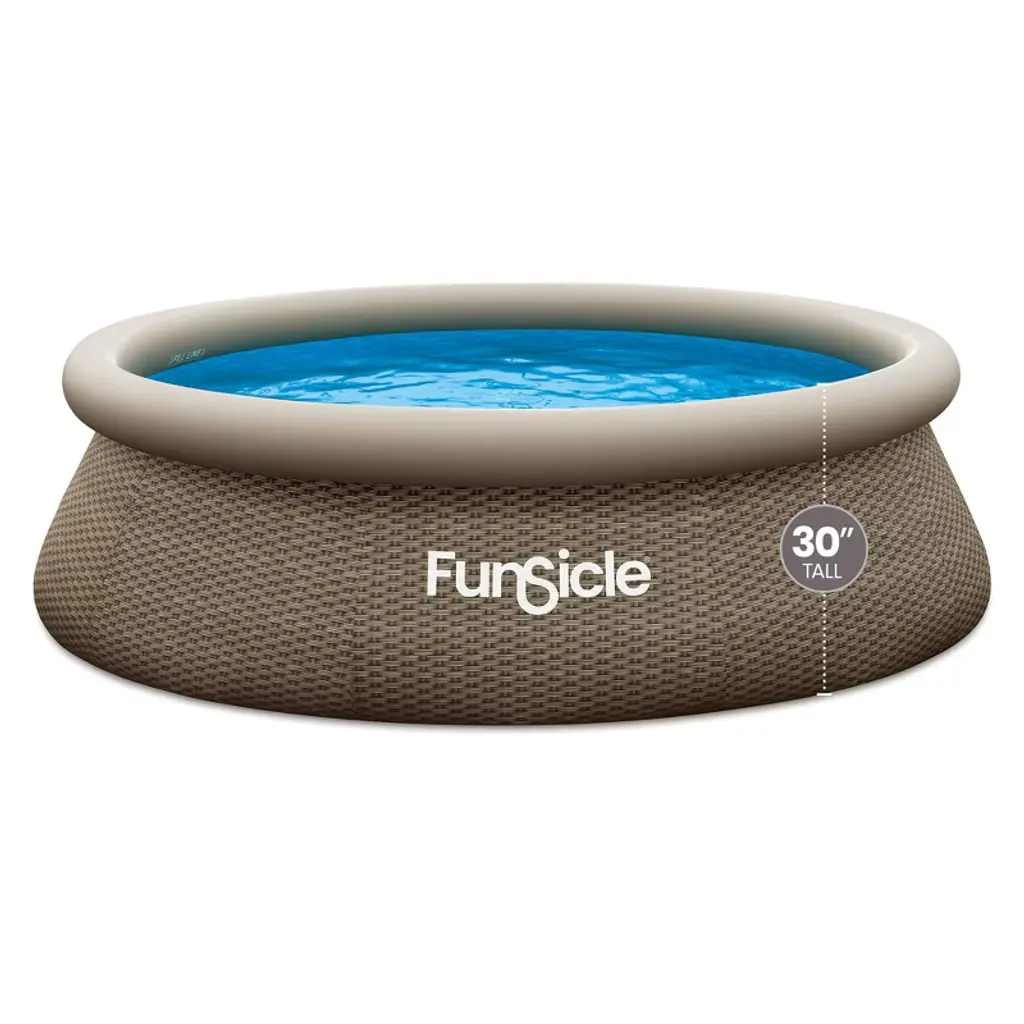 The 10-foot QuickSet Designer Inflatable Above-Ground Swimming Pool from Funsicle combines style and functionality. This creative pool design offers you a remarkable swimming experience by skillfully fusing style and functionality. With this inflatable above-ground pool, your outside space will be the perfect place to cool off, spend time with loved ones, or host an unforgettable pool party. This pool is simple to set up, guarantees less waiting time, and maximizes enjoyment. With a circumference of 10 feet and a height of 30 inches, this top ring-style swimming pool can comfortably accommodate 4 to 5 persons. It's a flexible option for families and friends of all ages to get together and have a splashing good time because it's appropriate for ages 6 and up. The package includes a Type I filter cartridge, an RX330 pool filter pump to circulate and filter the water and the repair patch that comes with it makes sure that small accidents won't take away from your enjoyment. The pool is a safer option for your family because of its creative design, which makes it simple to mount to the wall and lowers the possibility of tripping hazards. Built from strong, ultra-durable materials, this round family outdoor pool has a stylish black triple basket weave print liner. Because of its sturdy construction, the pool will last for many years as an addition to your outside area, withstanding all of your playful and energetic outbursts. Bid farewell to the headache of routine pool upkeep and hello to continuous enjoyment with the Funsicle 10-foot QuickSet Designer Inflatable Above-Ground Swimming Pool.