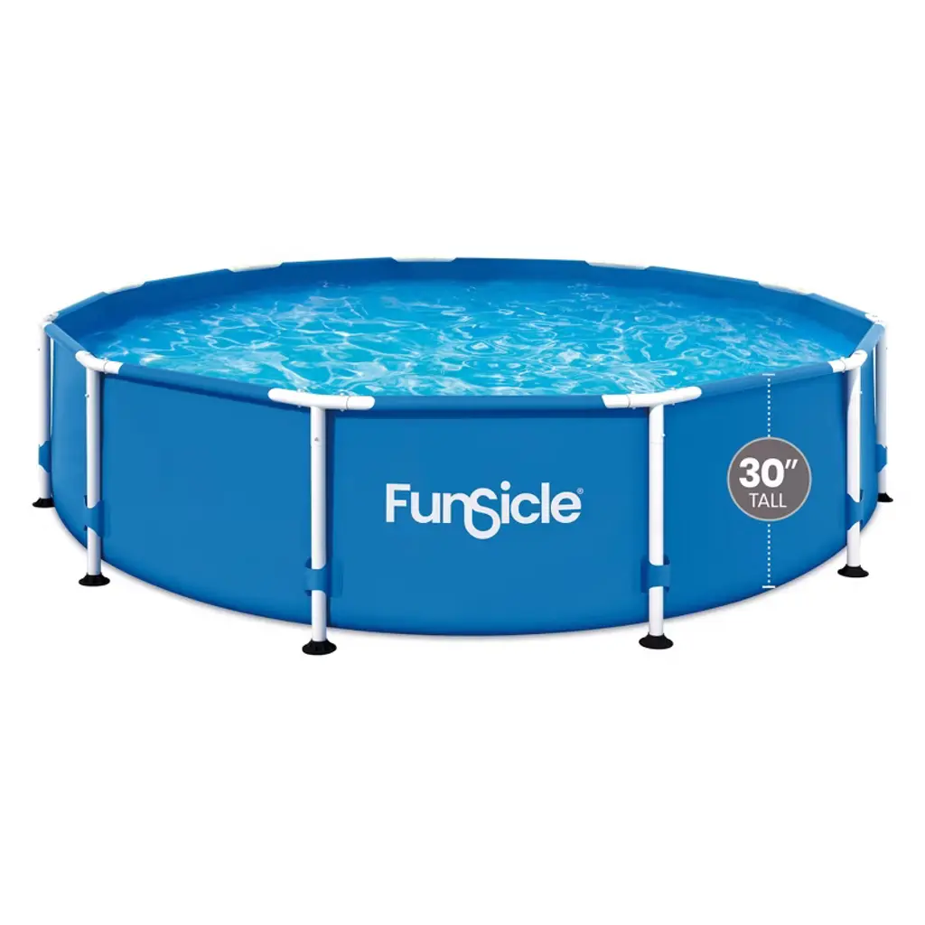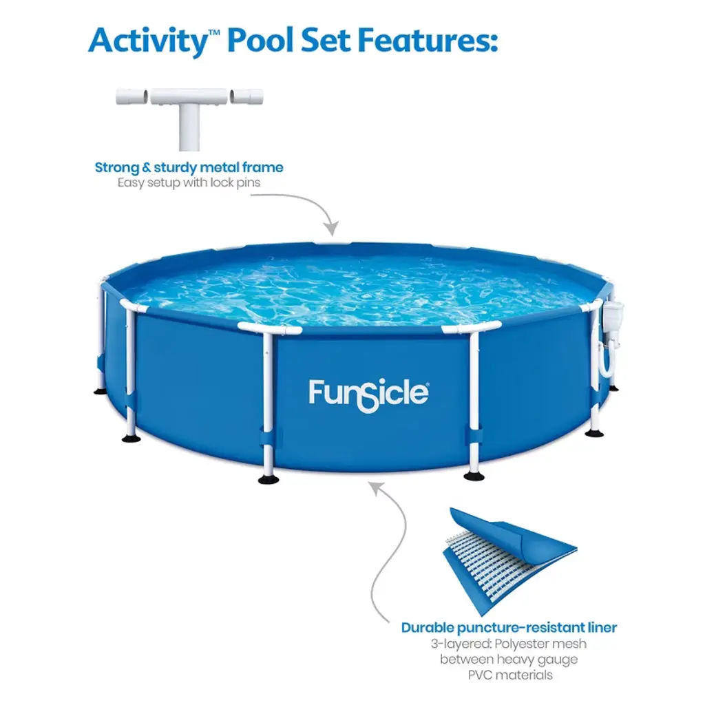 The Funsicle Outdoor Activity Round Swimming Pool includes all the essentials for exciting outdoor play and swimming. You will appreciate its quick setup, enabling you to easily build, fill and chill. Simply assemble the above ground pool frame by securing the poles together with the provided lock pins. The sturdy metal structure and material that resists punctures ensure a long-lasting pool to enjoy. For clean and sparkling water, this pool for the backyard comes with a powerful filtration system that includes a built-in 2-in-1 skimmer. The filter pump conveniently attaches to the pool's side wall, keeping swimmers safe from tripping. With space for multiple people, the family pool offers space for everything from relaxing to swimming to splashing the day away. Best for young families, party hosts, and outdoor enthusiasts who appreciate being active in a high-value pool, the Funsicle Activity Pool is just what you need this season. Disclaimer: Please review your HOA rules and restrictions before purchasing this product. Not all housing agencies permit private above-ground pools.