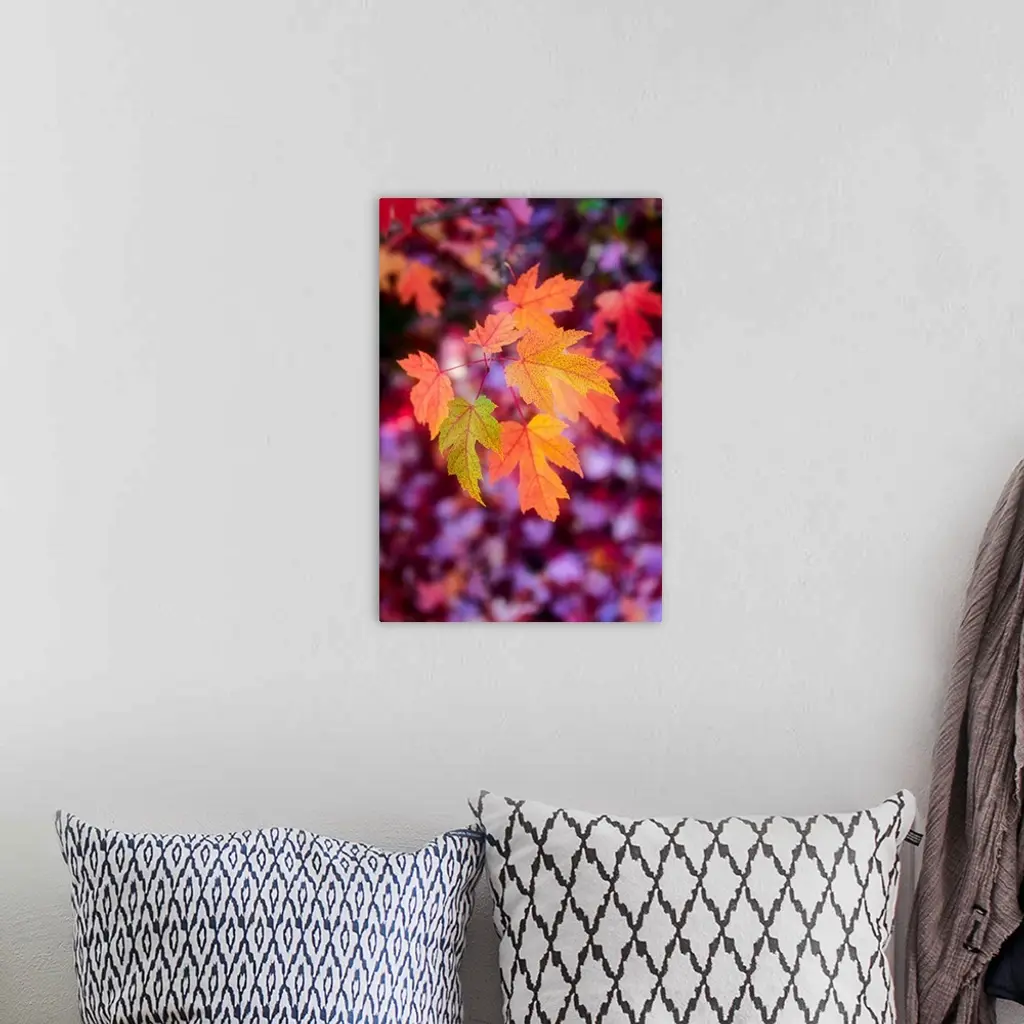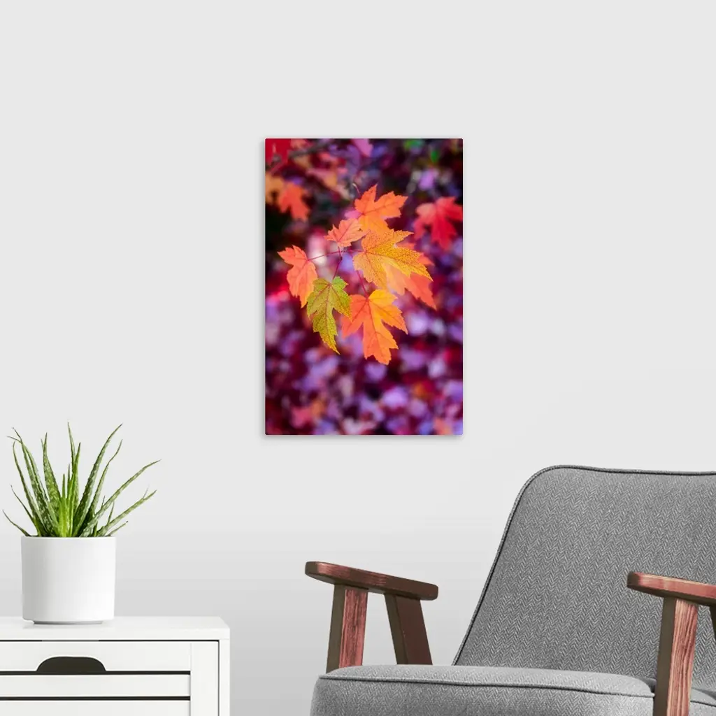 A cluster of orange leaves with one green leaf on a branch.