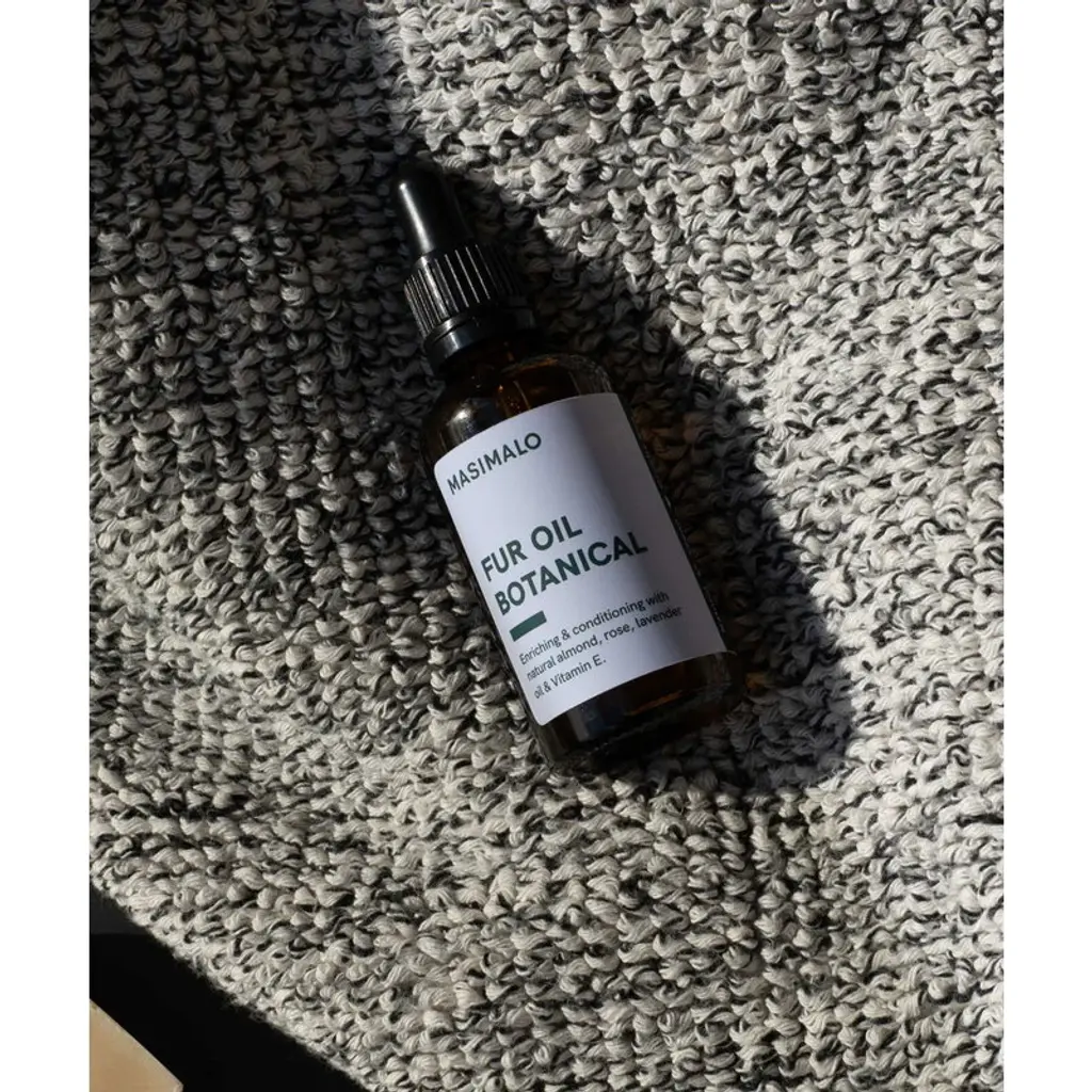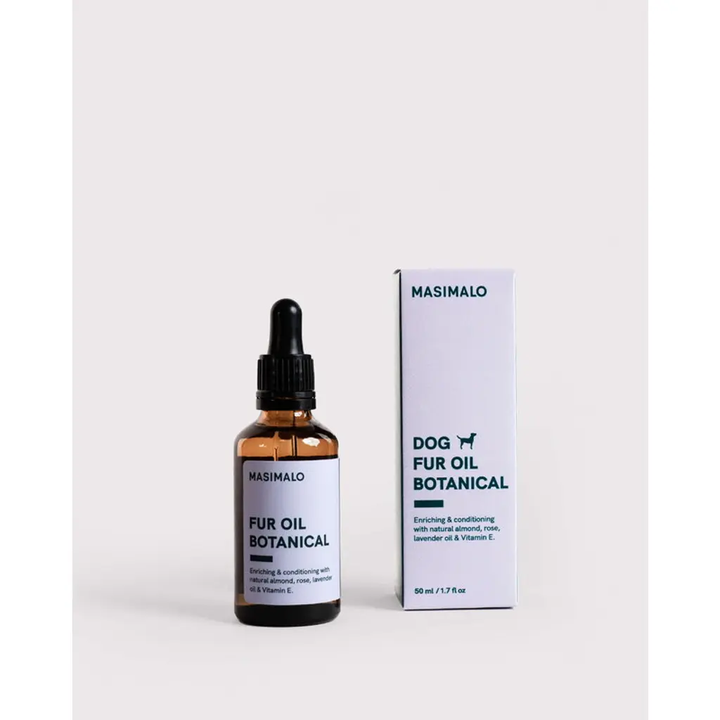 Masimalo's fur oil is perfect for nourishing, repairing and maintaining your dog’s coat. Made of natural oils, it hydrates both the fur and the skin underneath while boosting circulation for a healthier, shinier coat. Handmade and 100% vegan, the fur oil is free from parabens and sulfates, offering a gentle and eco-friendly grooming solution for your furry friend. Ingredients: Blended natural botanical oils and essences (all safe for pets) including Grapeseed, vitis vinifera, sweet almond, prunus dulcis, rose, lavender, vitamin E.