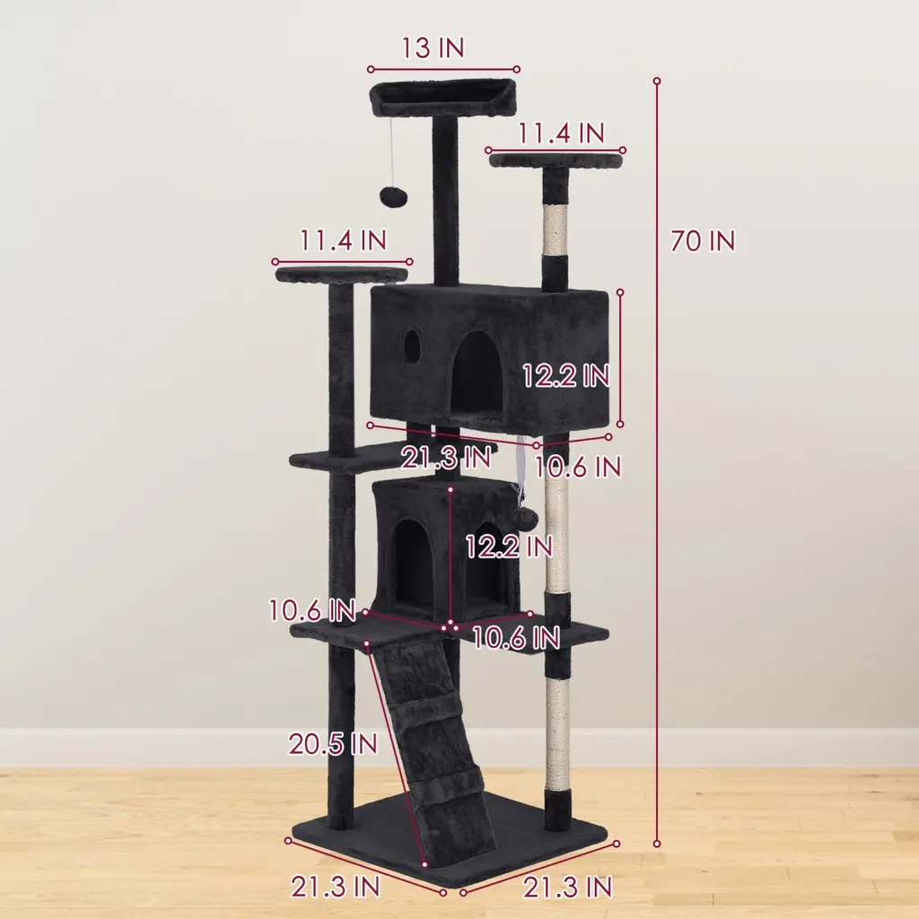 Spoil your feline companion with this luxurious cat tree tower. With three platforms for climbing and perching, two cozy cat condos for napping and hiding, and a built-in scratch post covered in durable sisal rope, this cat tree offers endless entertainment and comfort. The plush faux fur fabric adds a touch of elegance to any space while providing a cozy retreat for your cat to relax and play. Features: Includes one (1) multi-level cat play house tower Available in multiple color options Two (2) size options: 54-inch tall or 70-inch tall MULTI-LAYER STRUCTURE: Various perch platforms and condos to offer space to stretch or curl up BUILT-IN SCRATCH POST: Three (3) scratching levels with natural sisal rope SECURE WALL ANCHOR: Includes anti-tip wall anchor kit to prevent tipping Three (3) perches at different elevations Two (2) cat condos, small and large, for a cozy quiet area Faux fur exterior over high-quality particle board construction is plush and comfortable Two (2) hanging toy balls to keep your cat or kitten entertained Includes one (1) ladder style ramp at base for easy climbing Great for kittens, adult and senior cats Assembly required, tools included Dimensions: 54-inch option: 54 inches high x 19.3 inches wide x 19.3 inches deep 70-inch option: 70 inches high x 21.3 inches wide x 21.3 inches deep Whether you are a deal seeker, trendsetter or just window shopping, Furniture of America® is there for your every need. You'll find that we offer every style, from rustic farmhouse and urban industrial to French antique, mid-century modern, and glamorous chic; we welcome you to explore our ample style possibilities to find the perfect pairing for your personality. Furniture of America® is proud to be the family friend that always has your back. Product Care: Place cat tree on the floor against a wall corner Secure tower to wall with included wall anchor strap for safety Do not allow children or young adults to climb or play with the product Avoid humid environments This product will ship to you in one (1) box.