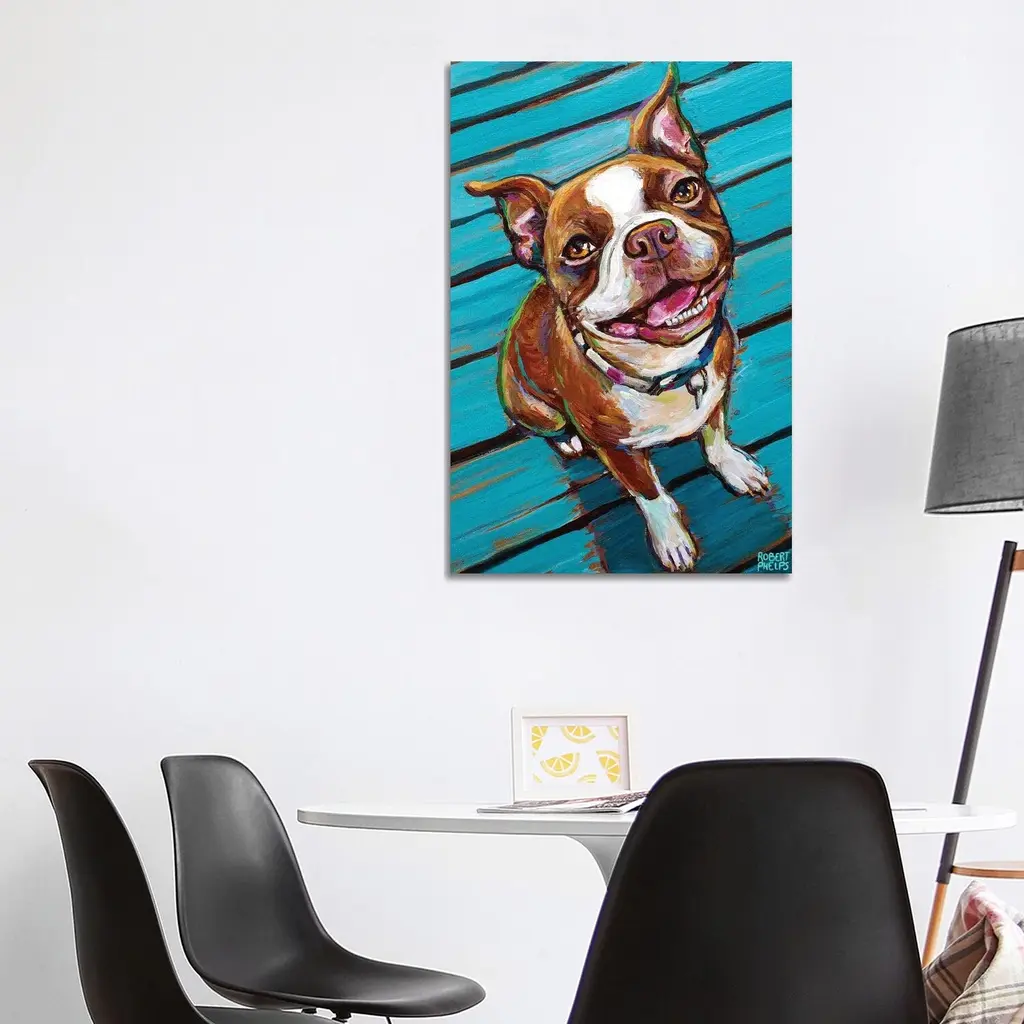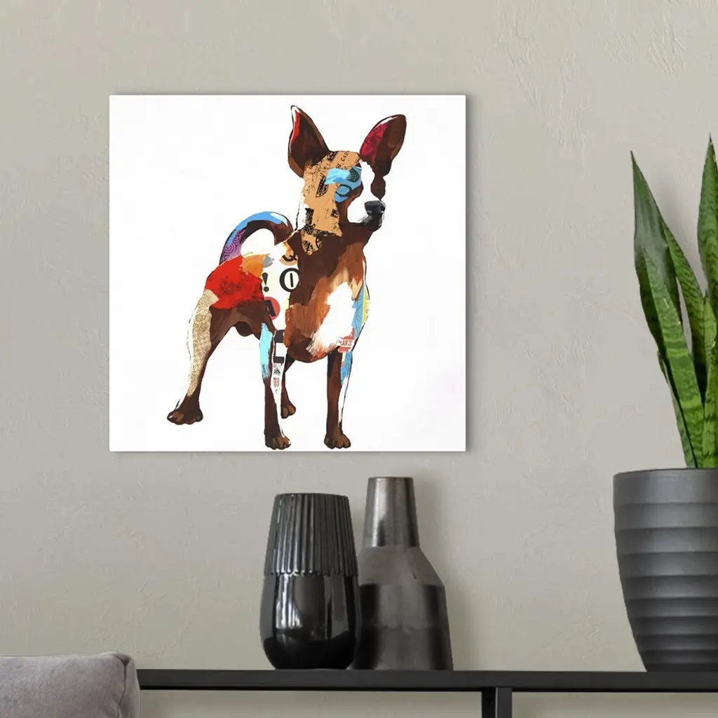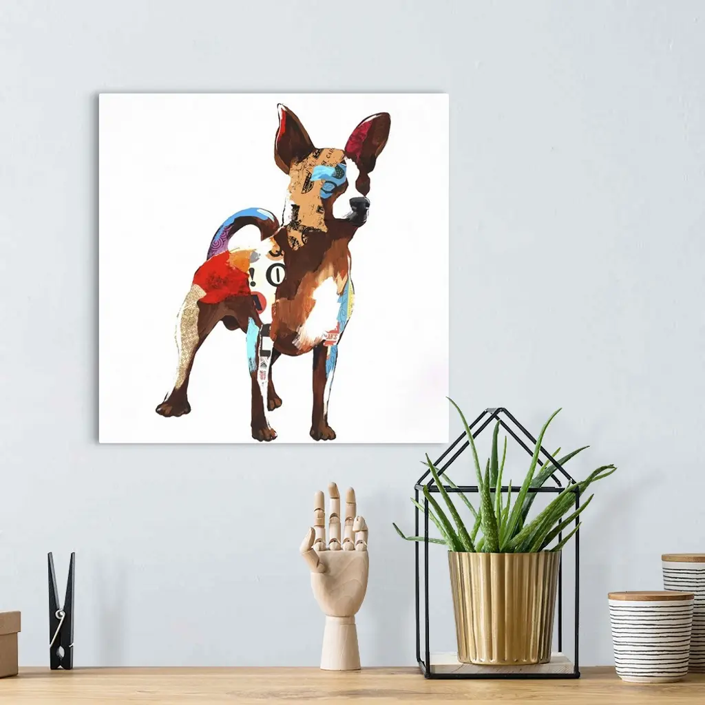Square art created with mixed media of a colorful chihuahua on a white background.