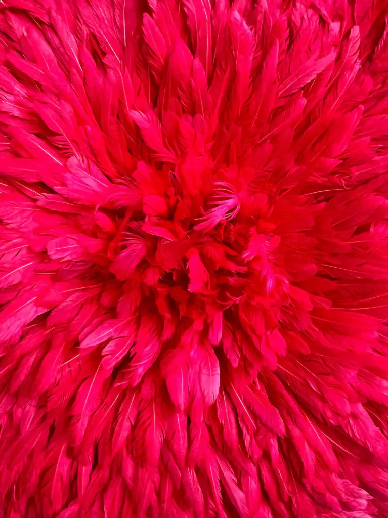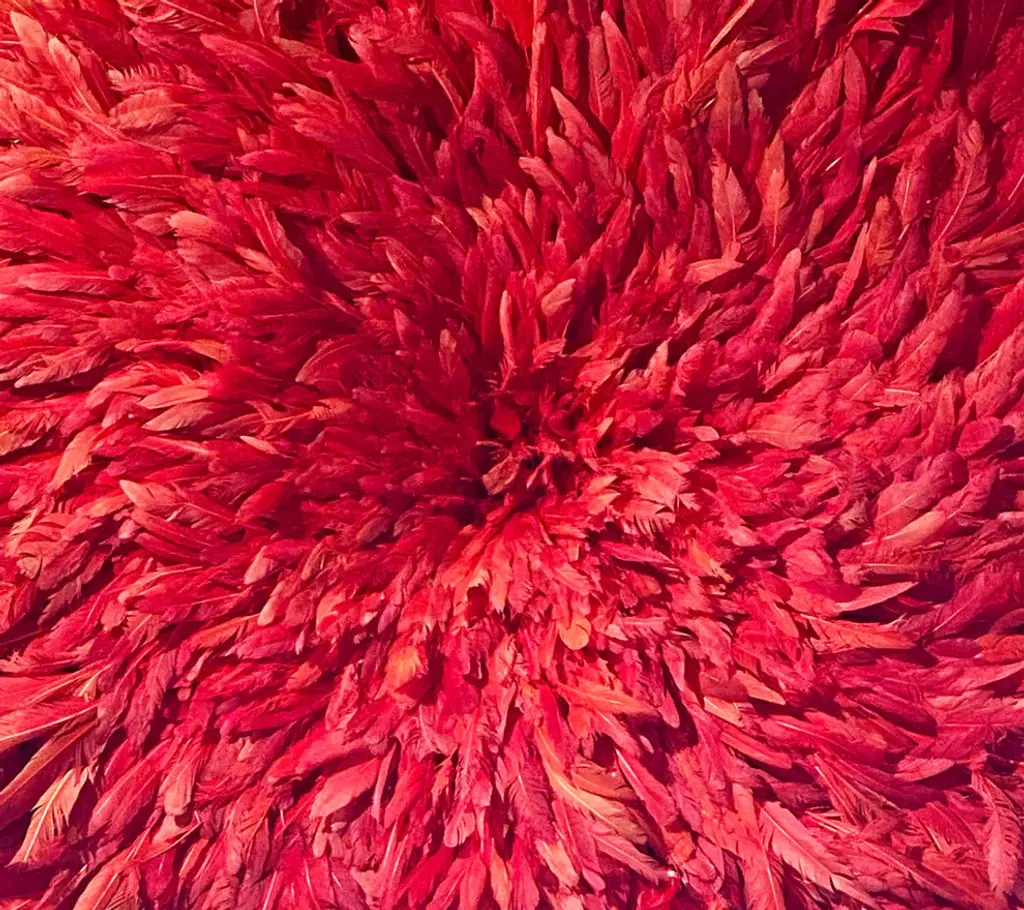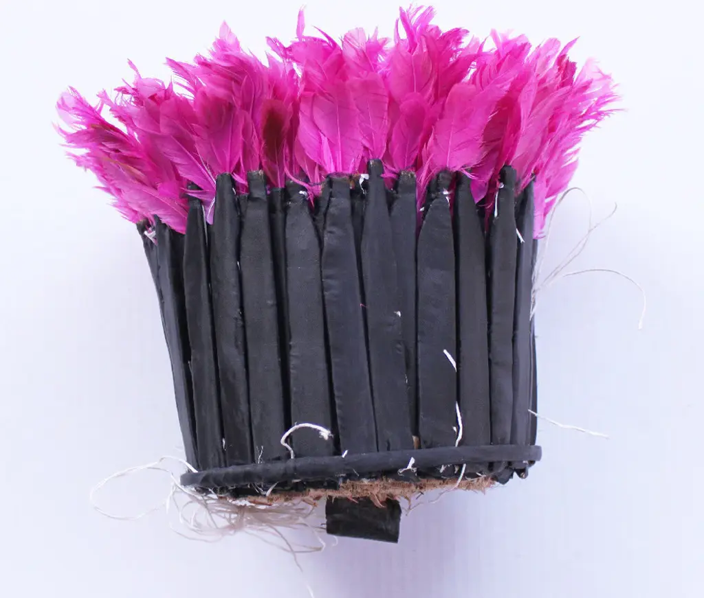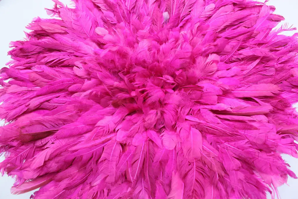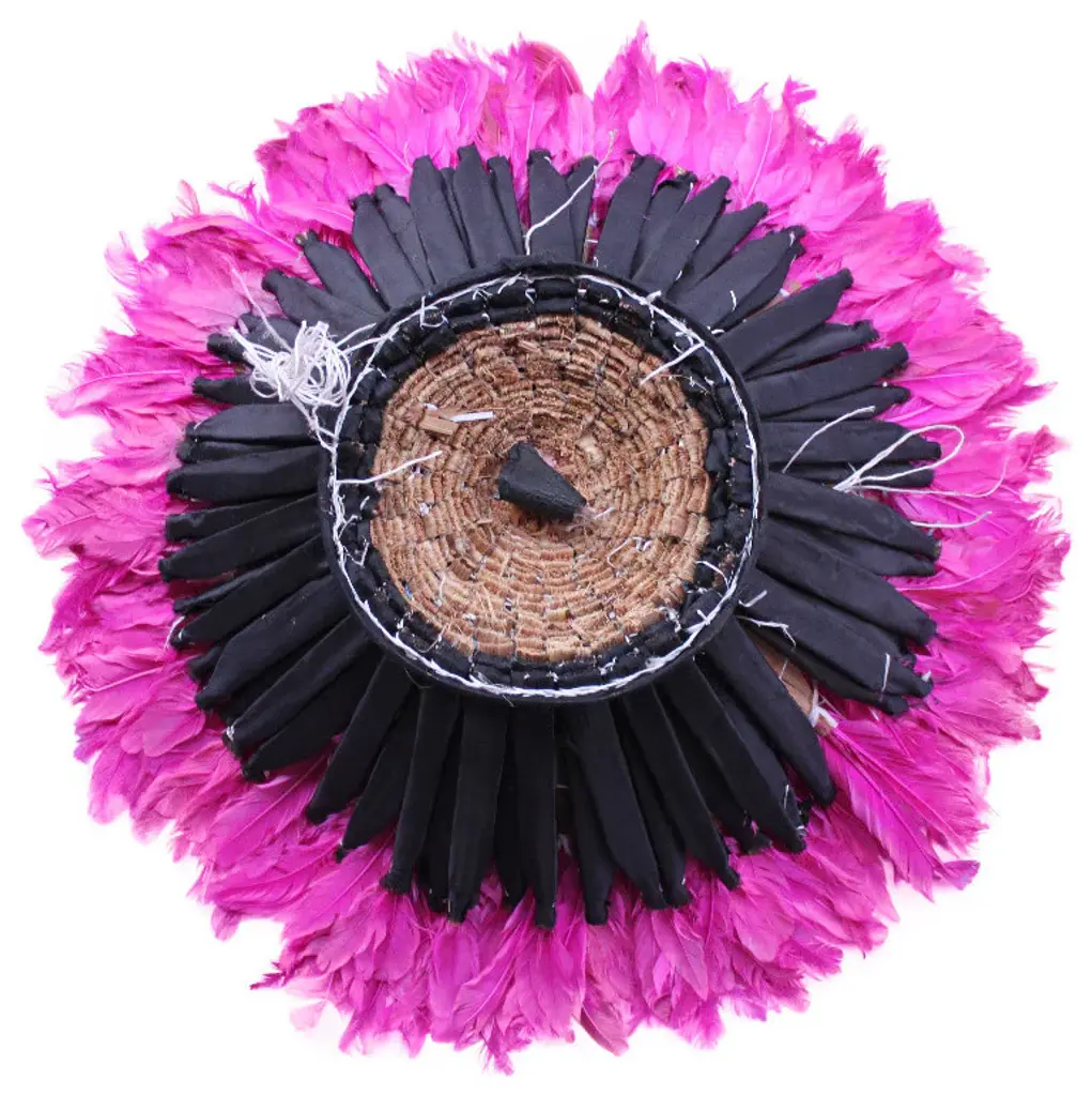 Origin: CameroonDimension: 20.5-21 inches/ 53 cm diameter.Profile dimension from wall surface (when open and suspend): approx. 3 inches (8 cm).Color may differ slightly from photos due to different monitor settings. Also, the color may vary from one product to another due to the dye on feathers.Materials: Raffia wood, Hens feathers, fabric, plastic string, dyes for color.Imported. All Juju Hats have been fumigated before importation.Maintenance: Juju Hats need some love too. To maintain a beautiful Juju a little maintenance is necessary. Spray the feathers every 3 to 4 months with an anti-moth to prevent from any damages caused by insects. To remove the dust on the Juju, use a hair blow dryer on low temperature. Keep blow dryer at least 12 inches (or 30 cm) away from the feathers. If needed rearrange the feathers with your fingers.This artful Juju Hat, the Tyn Hat is handcrafted in Cameroon. For centuries, Bamiléké tribes have been making those hats that symbolize prosperity and freedom. Once, Juju Hats were worn by medicine men and royalties during tribal ceremonies. Nowadays, their customs are less restricted during Bamiléké traditional rituals and their beauty has reached homes beyond Cameroon"™s borders. Those headdresses are very impressive hung on walls. Juju hats are made from natural or dyed feathers and woven raffia. Artisans take 2 to 3 days to complete one hat.