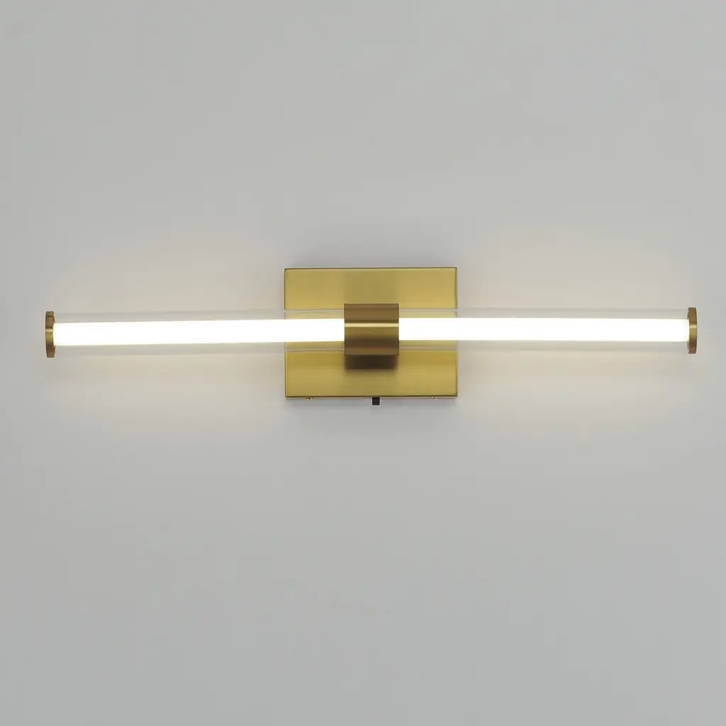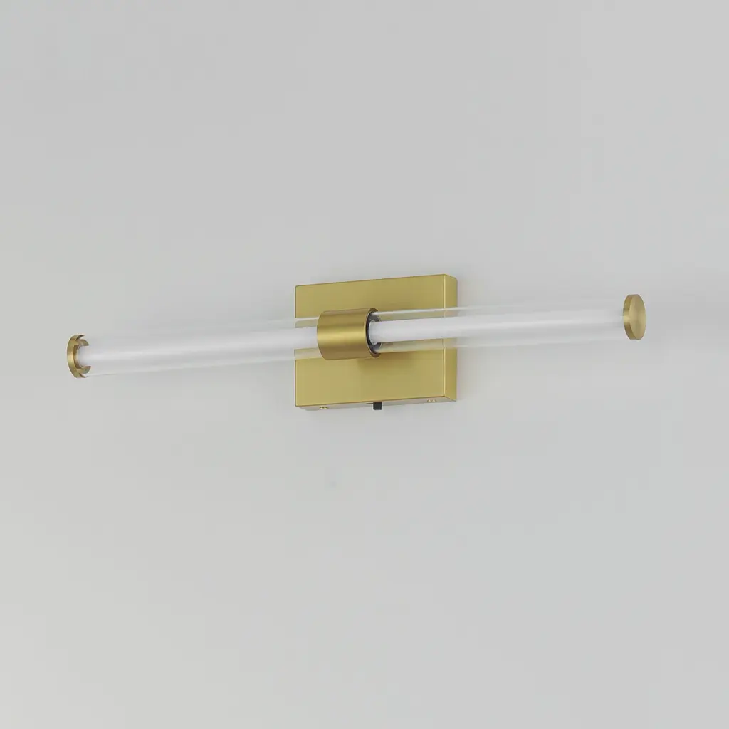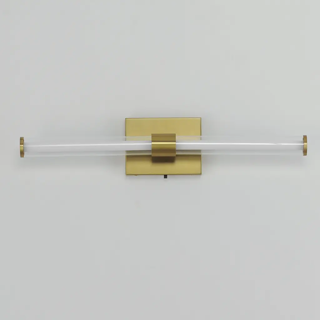 Within the void of clear glass, a white cylindrical tube of LED light extends in two directions. The evenly distributed light source can be adjusted to 5 selectable color temperatures, from warm 2700k to a cool 5000K and neutral white light sources in between. Available in three finish options: matte Black, Natural Aged Brass, and Polished Chrome, these sconces are great for use in bathrooms and along corridors with extensions less than 4 inches for ADA compliance.