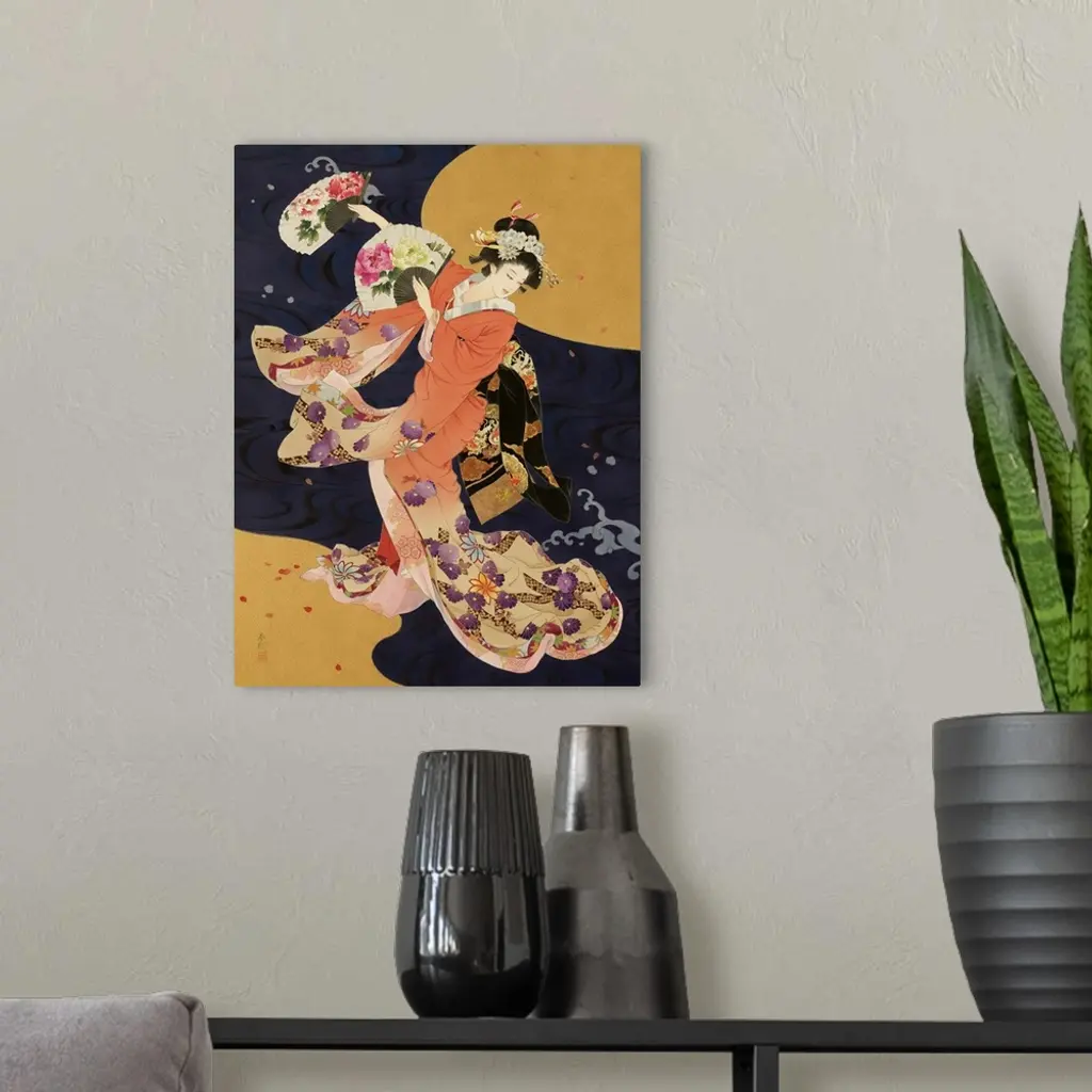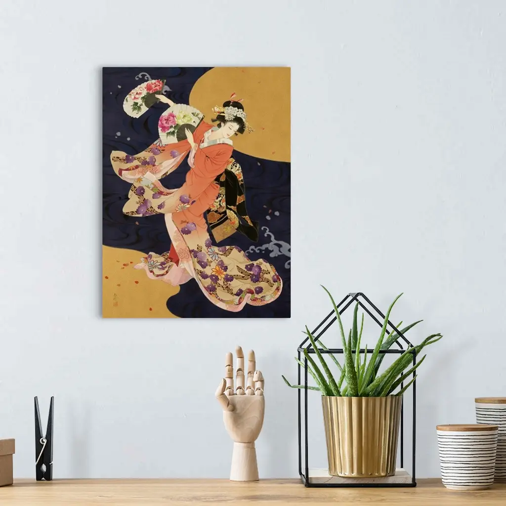 Contemporary colorful Asian art of a Geisha in beautiful ornate clothing.