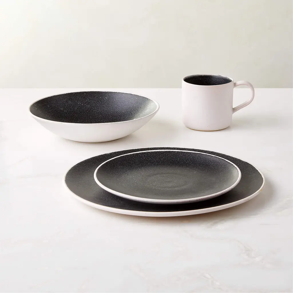 Black and white reactive glazes get graphic in stoneware that calls to mind galaxies and starscapes. Handmade dinnerware set is trimmed, scraped and sponged, then fired and finished by hand with a rich glaze—one that varies beautifully from piece to piece. Set includes a dinner plate, salad plate, pasta bowl and mug. CB2 exclusive.