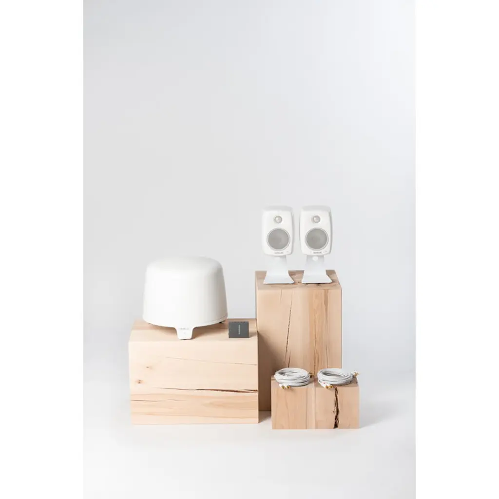 The Genelec G One & F One TV bundle is designed specifically for enjoying TV entertainment and achieving optimal sound quality in small home theaters. The set includes the following components: 2 x G One active speaker: Delivers astonishingly dynamic sound for its compact size, with a built-in amplifier that eliminates the need for external amplification. Awarded the Japanese Audio Excellence and VGP Lifestyle Award 2015. F One active subwoofer: Provides deep and dynamic bass response down to 35 Hz, enhancing the low frequencies of Genelec's G series active speakers. Thanks to its many inputs and remote control options, it can also be used as a hub to control your home audio system. Additionally, it can learn commands from external IR remotes. The integrated bass control directs all frequencies under 85 Hz to the subwoofer, enabling the main speakers to focus on the rest of the spectrum. 2 x G One table stand: Prevents sound reflections from the surface and eliminates comb filtering distortions. The metal stand allows the speaker to be positioned at an optimal height on a desk or TV stand, while the tilt function enables precise angling for the best listening experience. Marmitek ARC13 HDMI-RCA converter: A compact and easy-to-use adapter that lets you connect active speakers directly to your TV's HDMI port with crisp and clear sound quality. Includes a headphone jack. 2 x RCA-RCA audio cable: The high-quality Supra Sublink RCA cable offers excellent shielding and minimal noise. Length: 118.11 x 0 in (3 x m. m). The Genelec speakers have been designed to provide the listeners with even the most subtle nuances without removing or adding anything to the original sound. The rounded lines and refined design by Harri Koskinen give the Genelec speakers a lovely, Scandinavian vibe. The Genelec speakers are manufactured in Iisalmi, Finland. Key technologies: G One speakers: Directivity Control Waveguide (DCW) Reflex port design Optimized amplifiers Protection circuitry Iso-Pod base Minimum Diffraction Enclosure (MDE) Room response compensation Active crossovers Intelligent Signal Sensing (ISS) Versatile mountings F One subwoofer: Bass management Optimized amplifiers Protection circuitry Room response compensation Active crossovers Intelligent Signal Sensing (ISS)