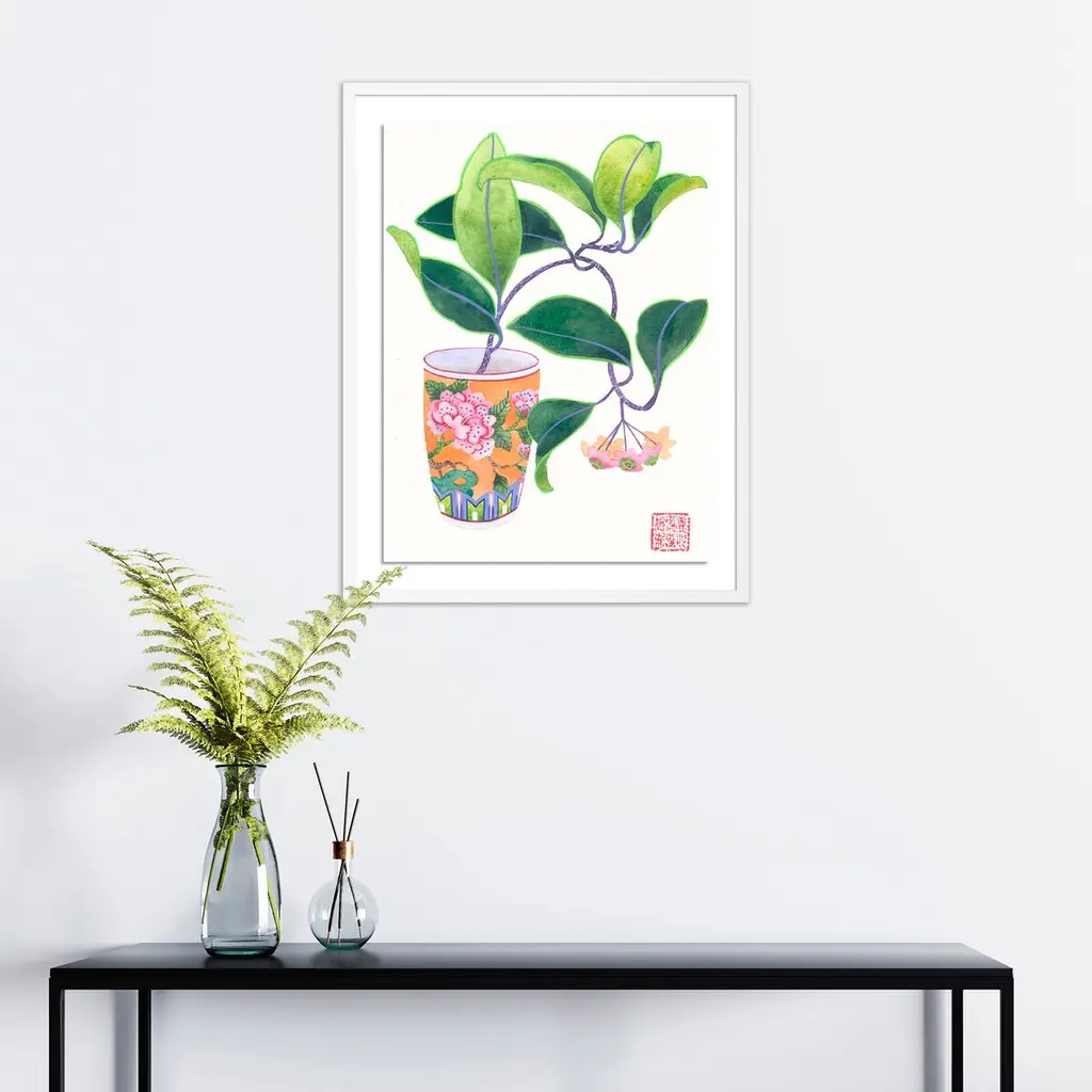 This work from Gabby Malpas brings any wall to life with its vibrant florals and detailed porcelain vessels. Printed on high-quality paper with deckled edges, floated over a mat, and displayed in a simple wood frame, this piece arrives ready to hang. Gabby Malpas creates joyful, intricate watercolor works. Locally grown flowers and fruits picked nearby are rendered with tender warmth, often borrowing from the delicate aesthetics of Chinese ceramics and Southeast Asian batik fabrics. She works on high-quality art paper which she sometimes stitches together to add texture. Gabby trained as a ceramicist in New Zealand and has lived for many years in the UK. She now resides in Sydney, Australia.
