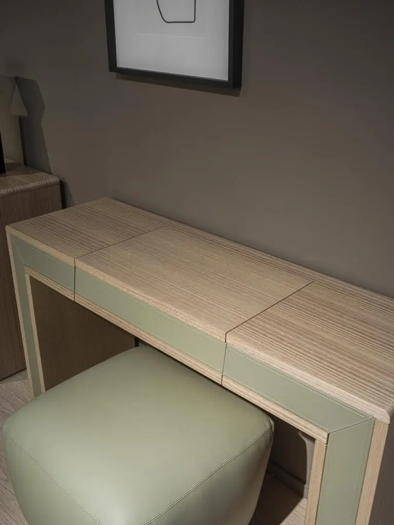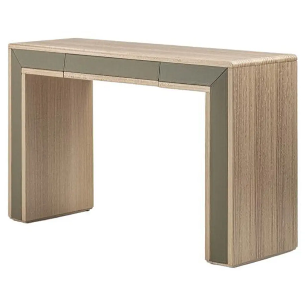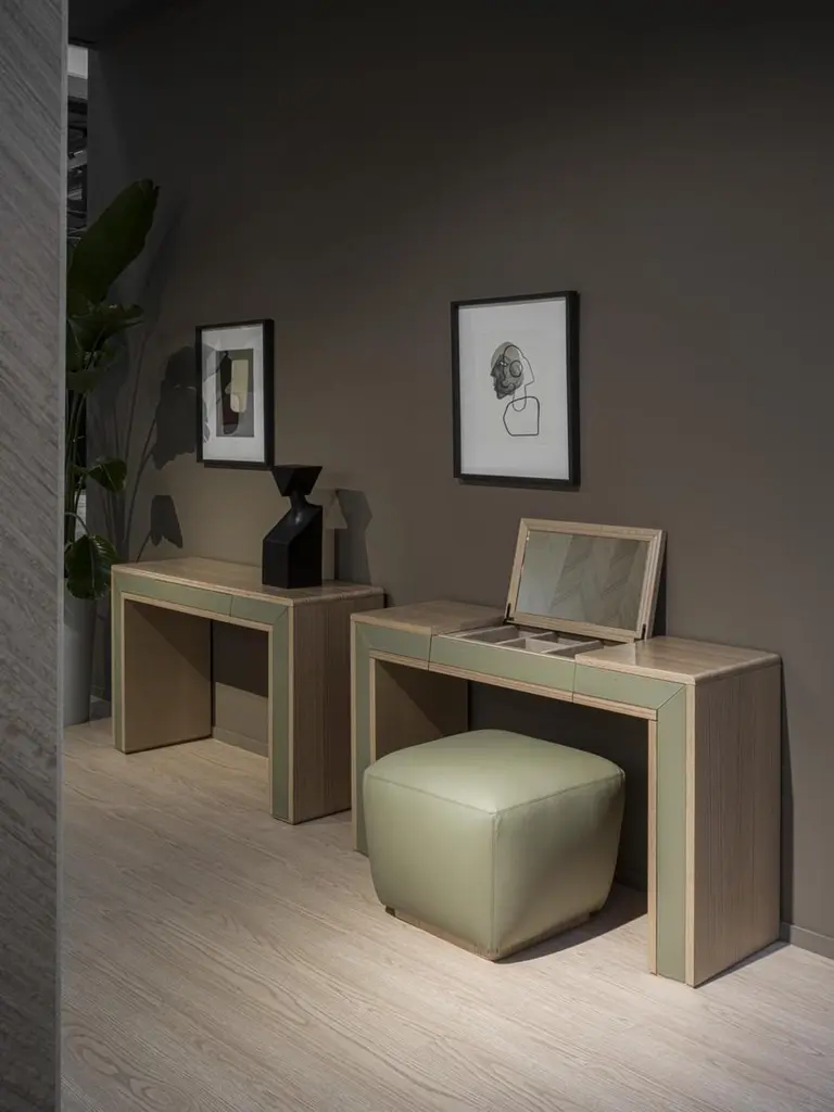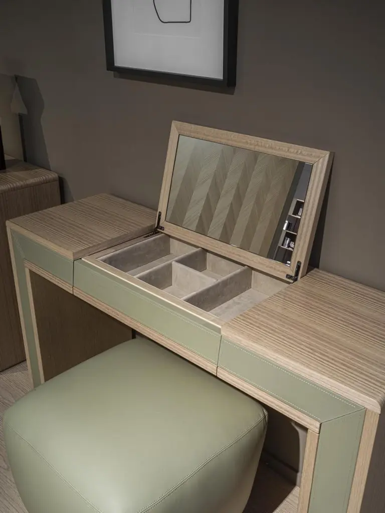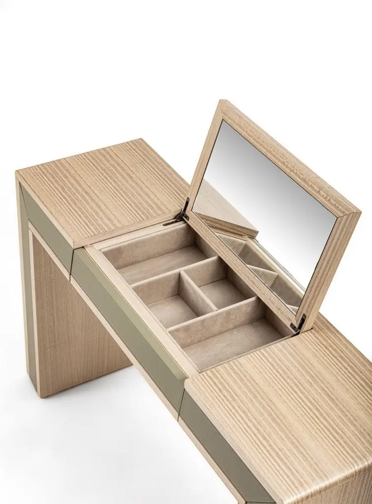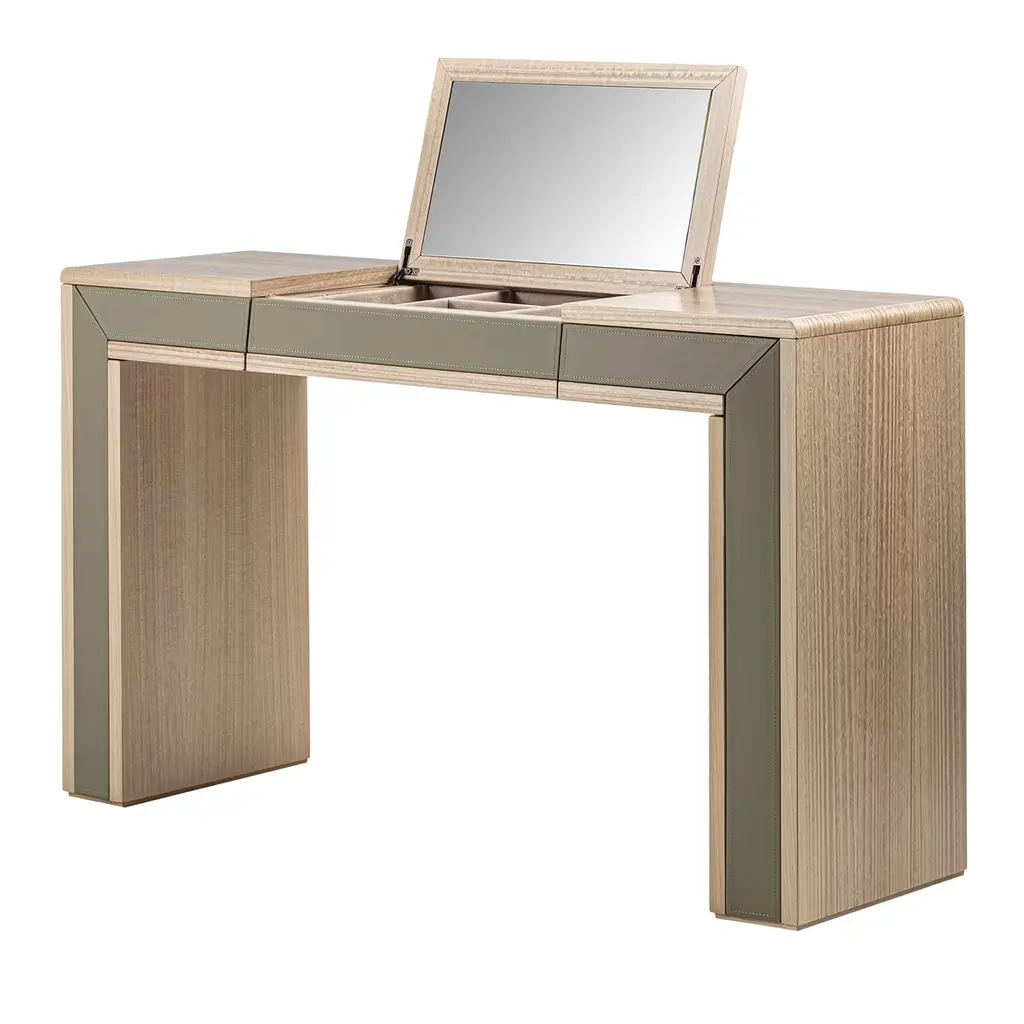 Toilet with a light and linear design, characterized by the combination of natural wood and leather tones. Presented in Eucalyptus rope F129, equipped with an opening mirror, two side drawers and microfiber-covered compartments. Also realizable in other wood finishes. Leather available in different colors.