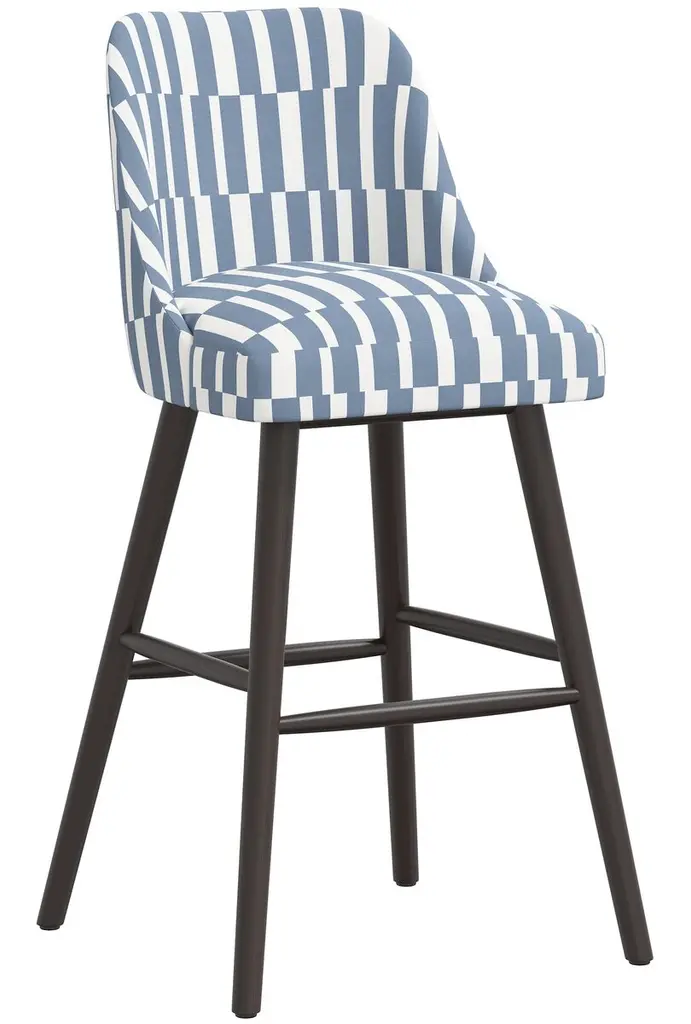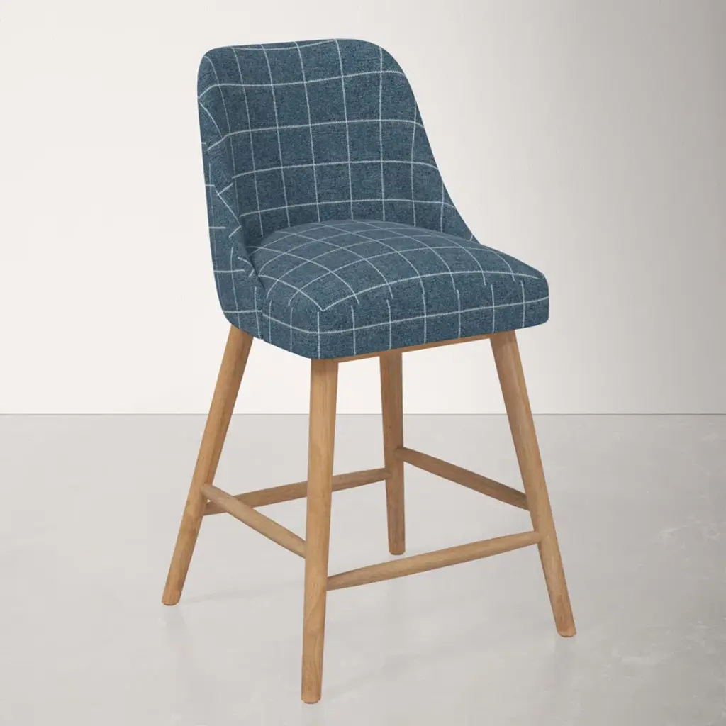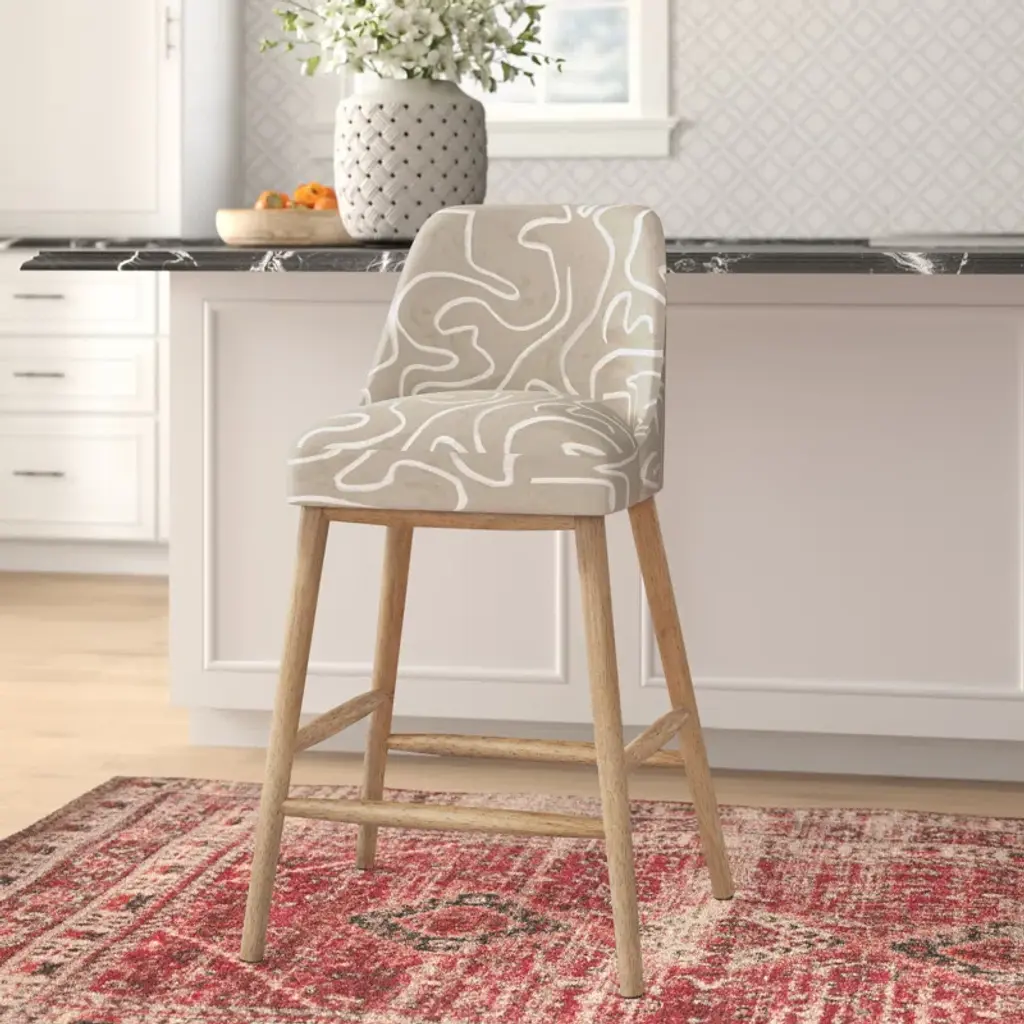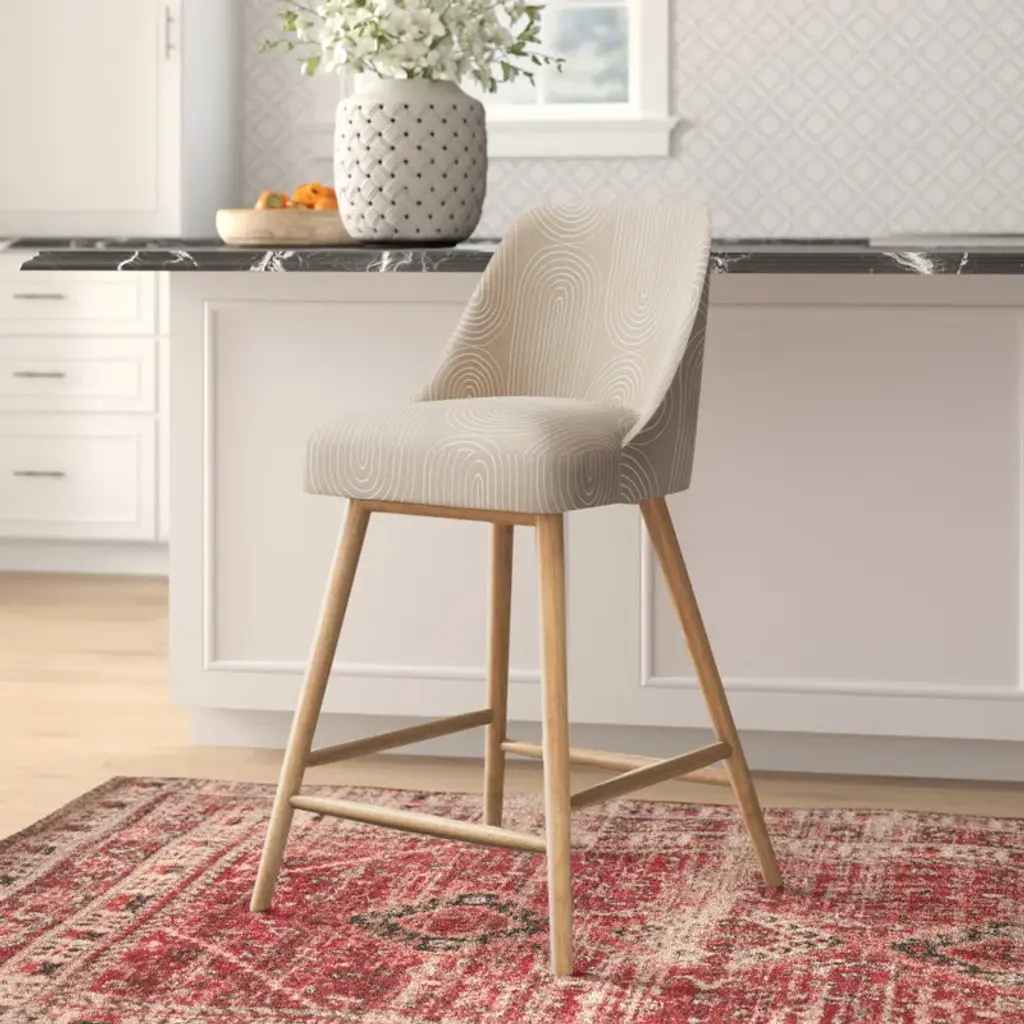 This armless stool combines tapered, flared legs and neutral upholstery for a minimalist, mid-century modern look we love. It's made in the USA from solid rubberwood. The seat and back are upholstered in polyester blend fabric with the textured look of tweed. Cozy and approachable, this stool is ideal for enjoying morning coffee at your kitchen island or pulling up to your home bar as you enjoy an afternoon cocktail. Plus, the feet have plastic glides to help reduce scuffs and scratches on your floors.
