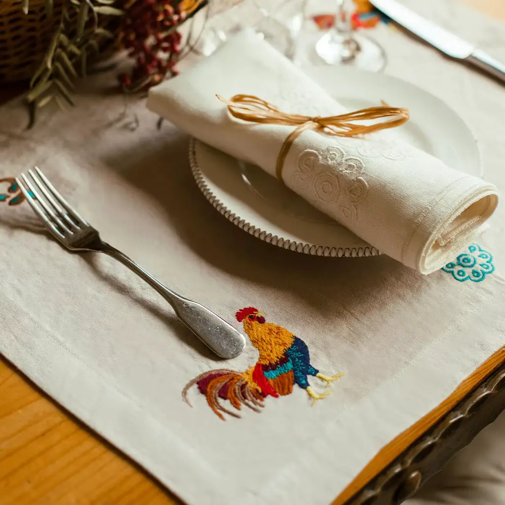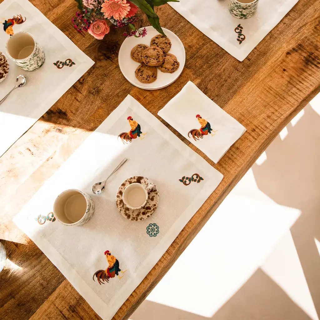 A superb addition to rustic-chic tables due to its motif evocative of rural atmospheres, this set of two table mats in Masters of Linen-certified ivory linen results from the patient work of master embroiderers. The roosters - symbols of wealth and fertility - and the rest of the motif are in fine Mako cotton, which enlivens the delicate solid-ivory backdrop. More colors are available in the Artemest catalog.