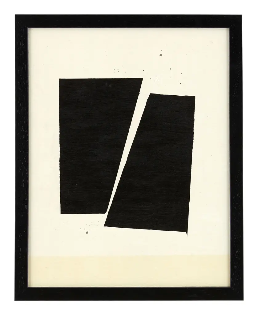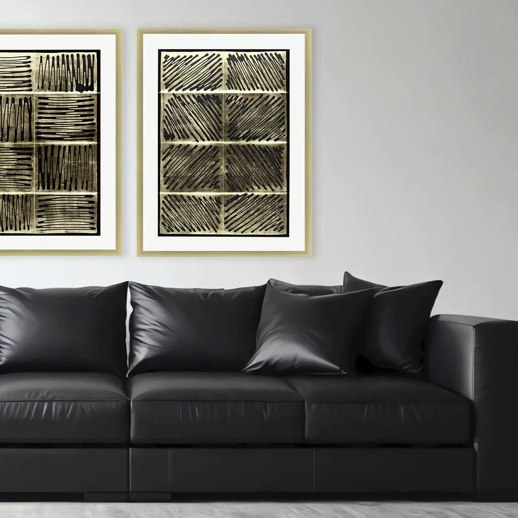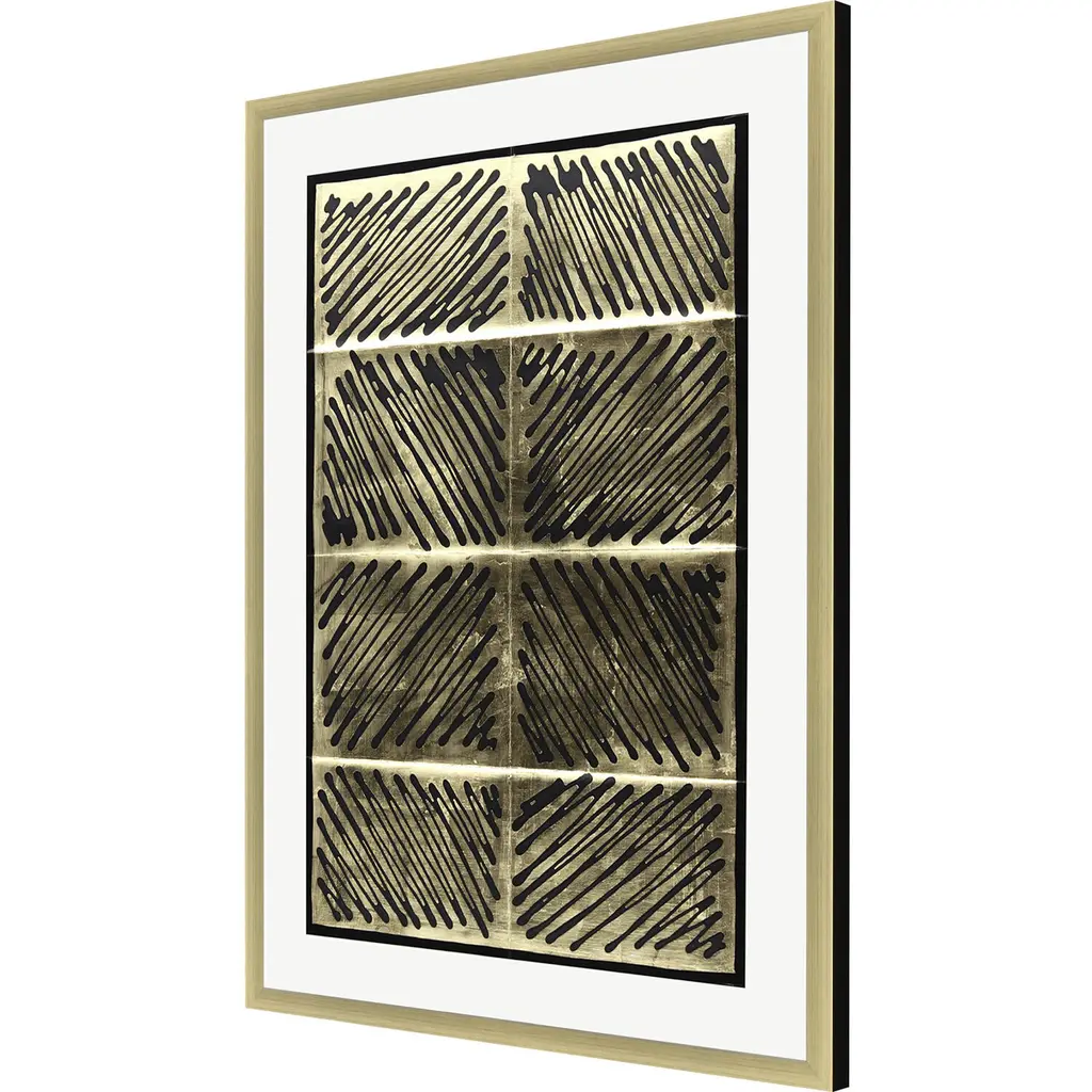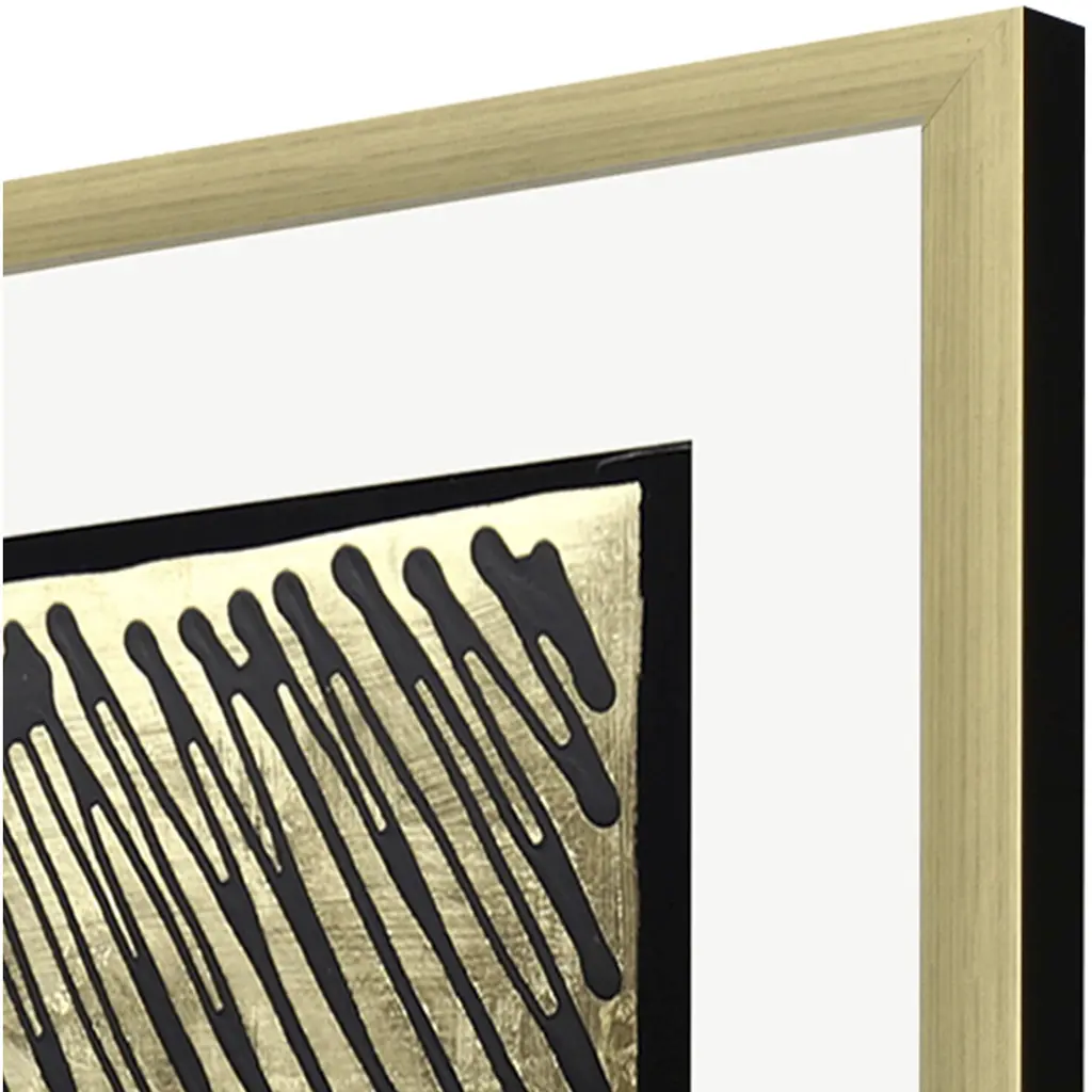 A hand painted abstract is embellished with gold leaf. Framed in a modern antique silver wood with champagne wash. Vertical or horizontal hanging.