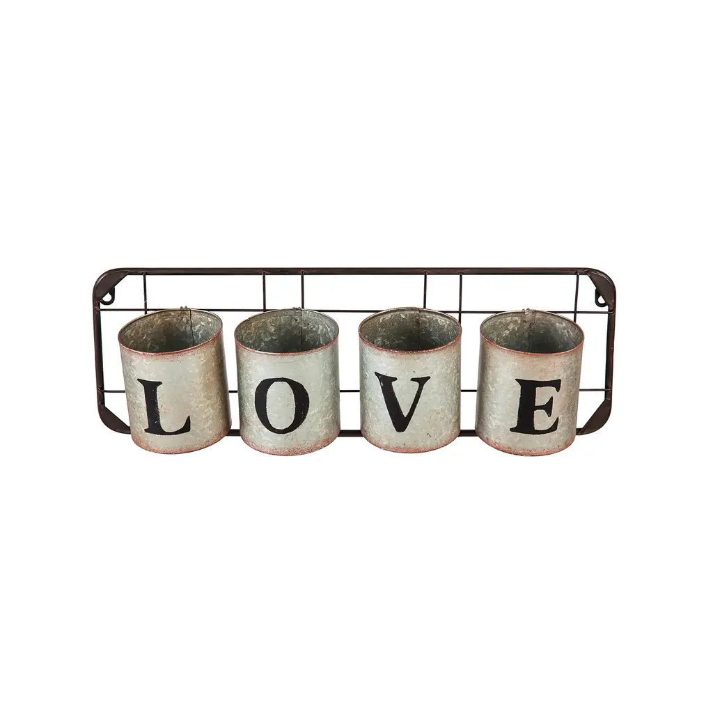 Give your plants a loving touch with these Galvanized Metal Wall Pockets. This rustic design includes four galvanized metal pockets that read "LOVE" for a heart-warming appeal. The wall décor piece is perfect for sprucing up any decorative space and elevating plant displays. The functional and stylish décor is ideal for showcasing small flowers and plants or holding other knick-knacks for extra storage and organization. Keyhole anchors on the back allow for easy wall hanging. This delightful decoration is perfect for kitchens, living rooms, hallways, and more.