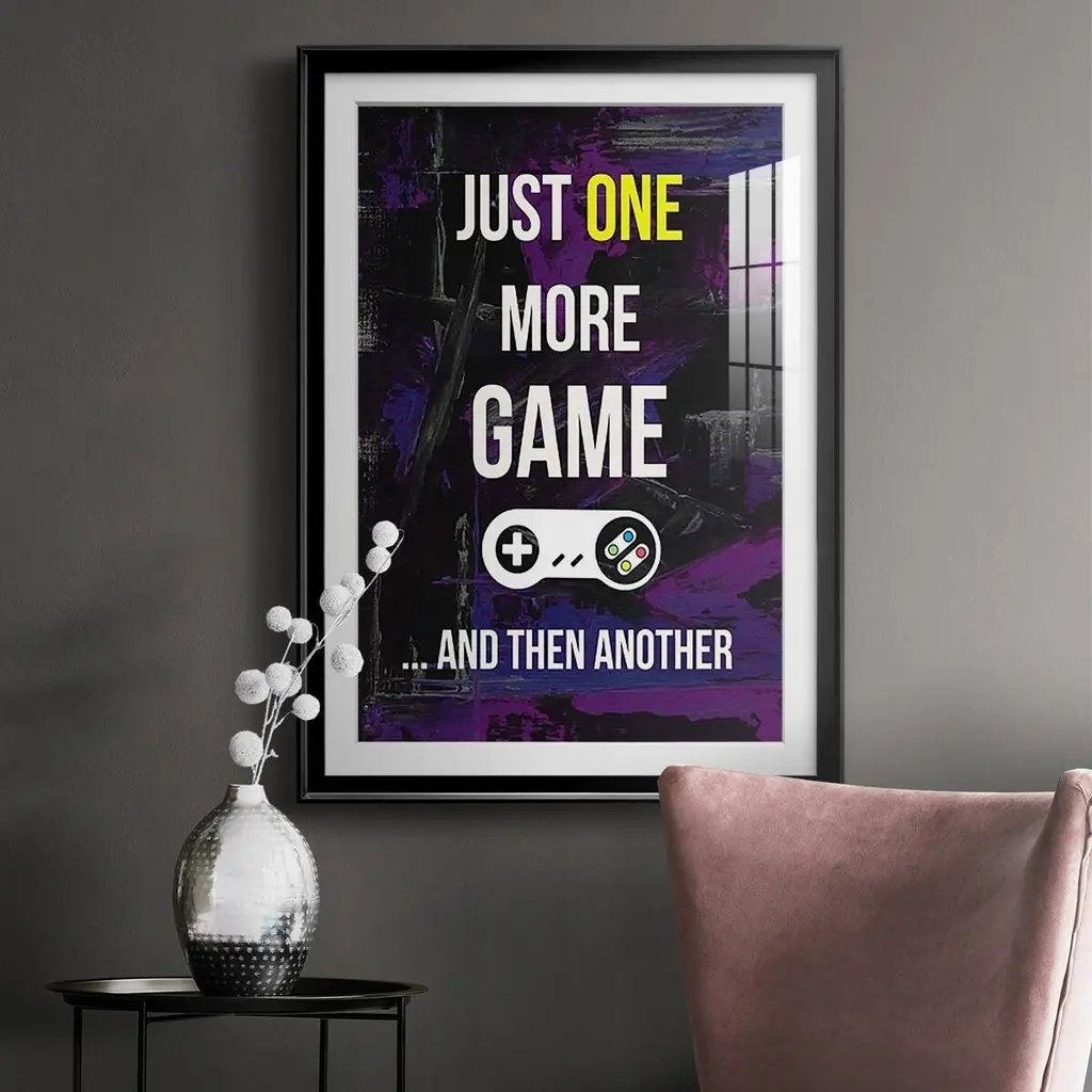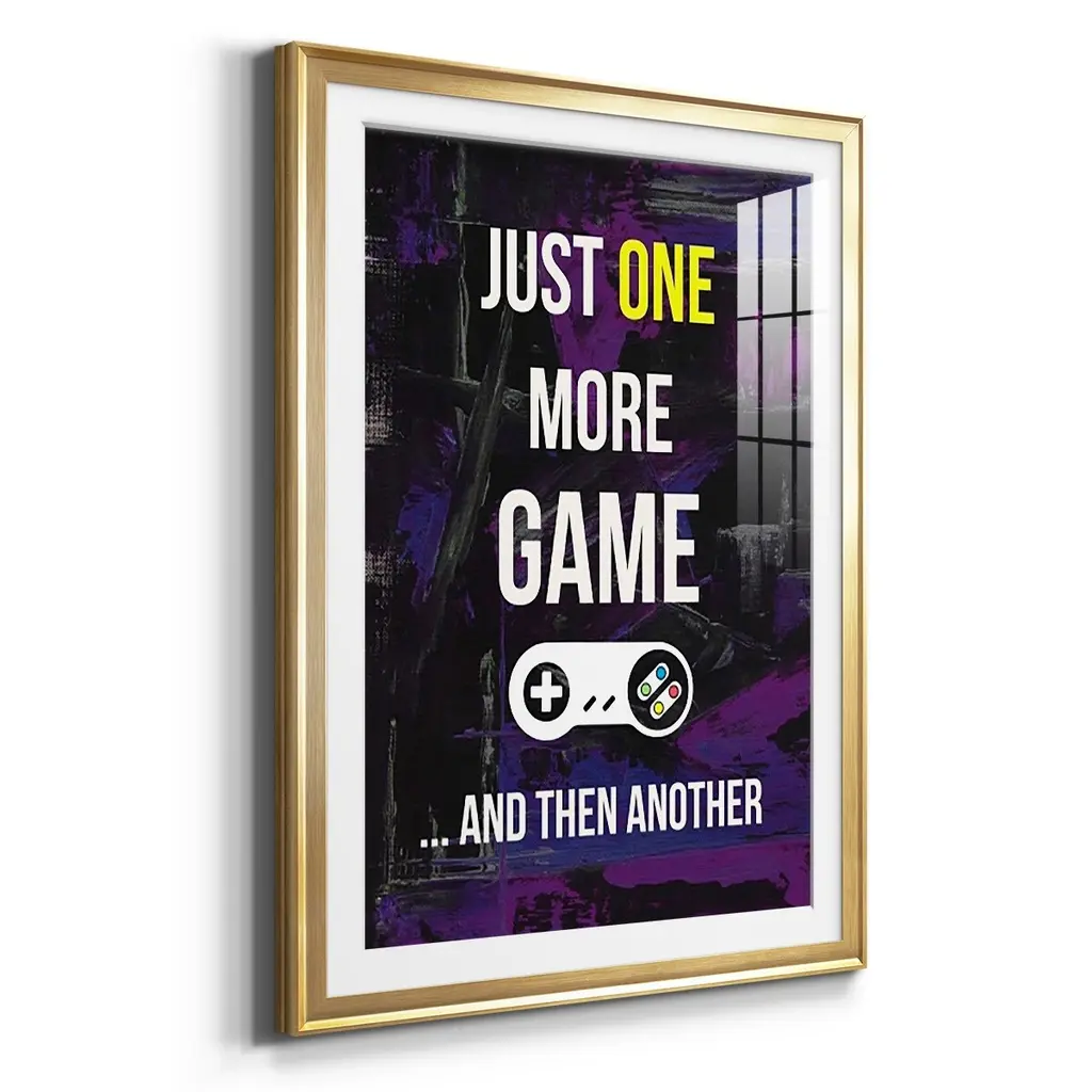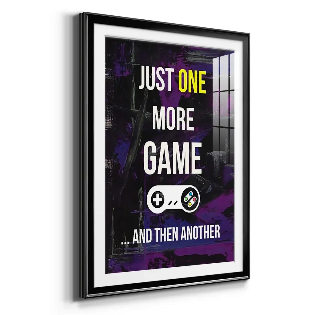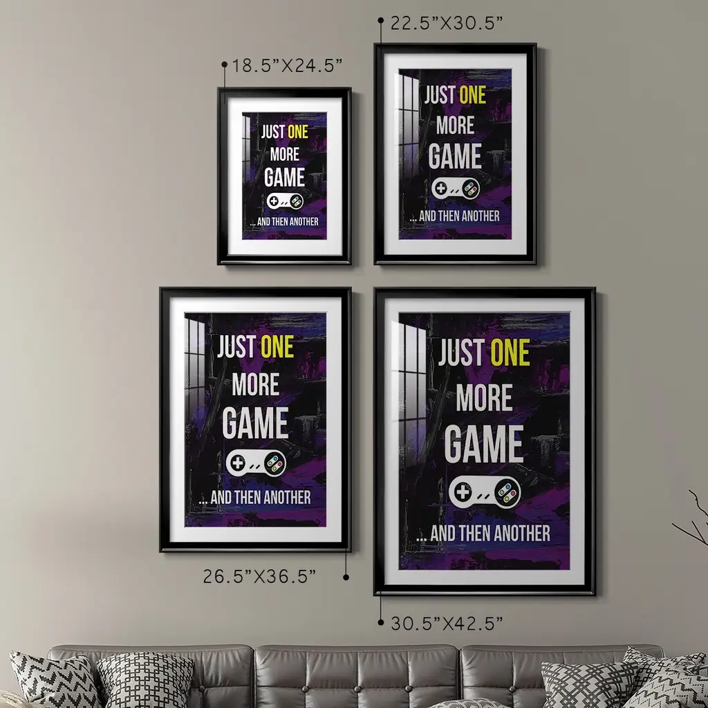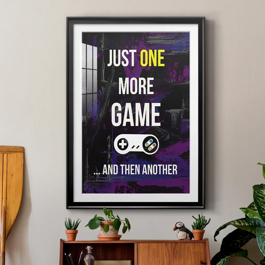 Gamer at Play II Premium Framed Print - Ready to Hang A Premium Framed Print created to last. Framed in distressed wood and available in an array of sizes and colors Featuring a beveled a solid wood stretcher bar, each piece comes ready to hand 4 SIZES AVAILABLE 30.5''X42.5'' - Overall Size 26.5'X36.5'' - Overall Size 22.5''x30.5'' - Overall Size 18.5''x24.5'' - Overall Size Each piece is made to order. Each piece comes with hanging hardware. Made in the USA Ready to Hang Giclee Paper Print Acrylic Glass Beveled Matt Board