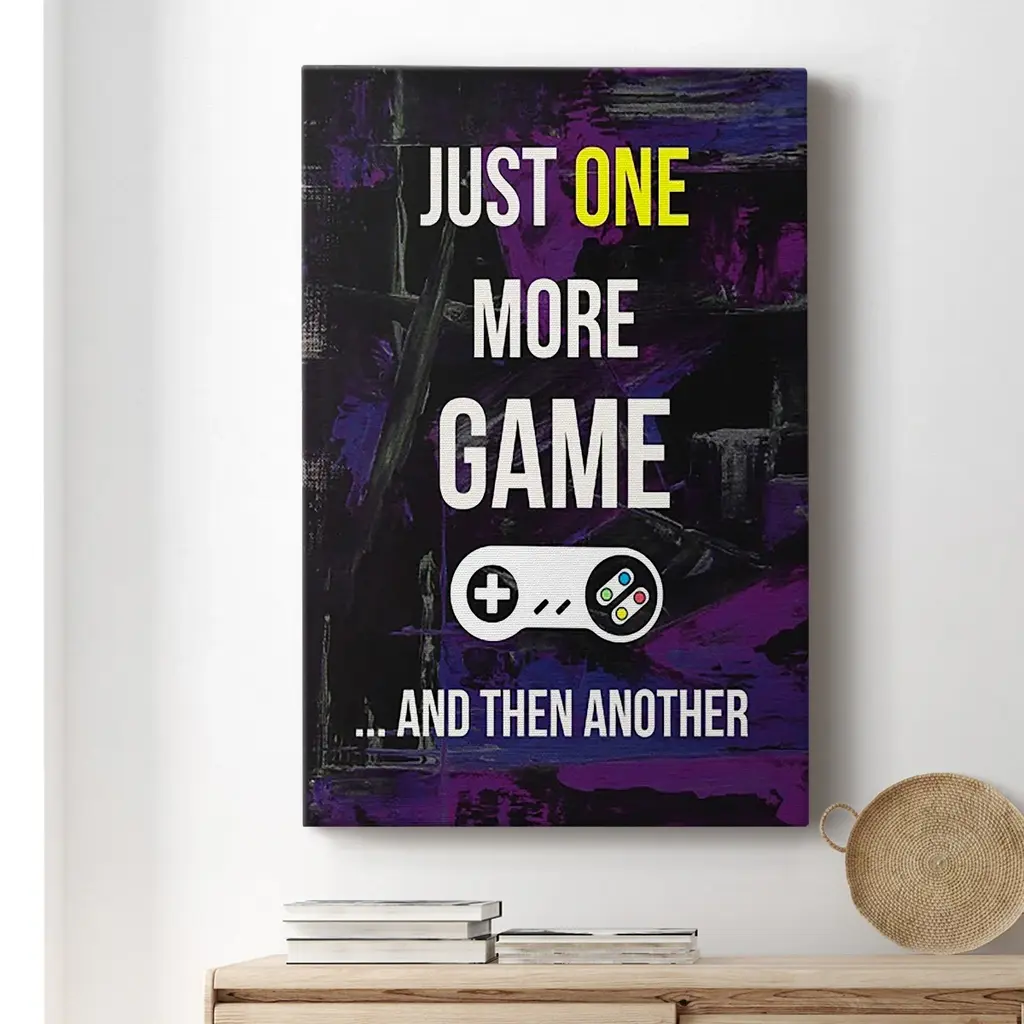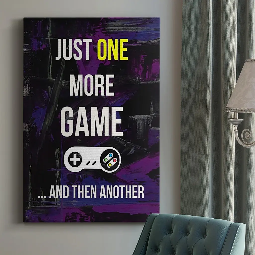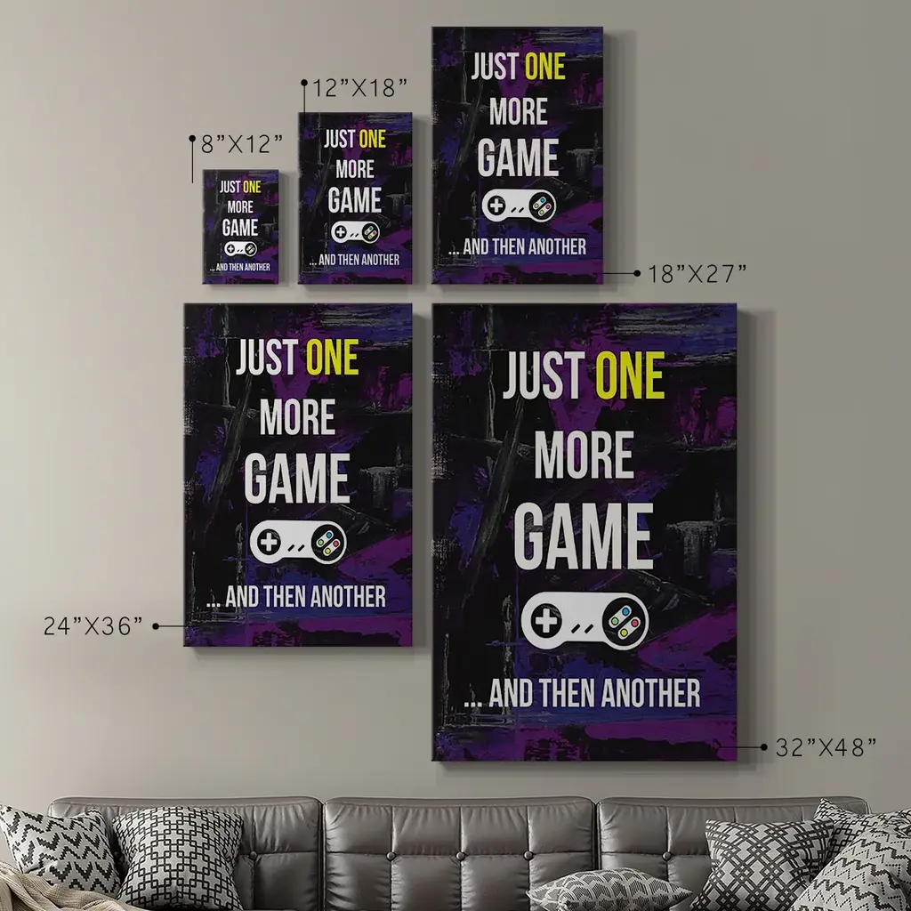Gamer at Play II Premium Gallery Wrapped Canvas - Ready to Hang A premium hand stretched gallery wrapped canvas print created to last. Featuring a beveled a solid wood stretcher bar, each piece comes ready to hand 6 SIZES AVAILABLE 8''X12'' - Overall Size 12''X18'' - Overall Size 18''X27'' - Overall Size 24''x36'' - Overall Size 32''x48'' - Overall Size 40''x60'' - Overall Size Each piece is made to order. Built to Last Each piece comes ready to hang Solid wood stretcher Fade and Water resistant Made domestically