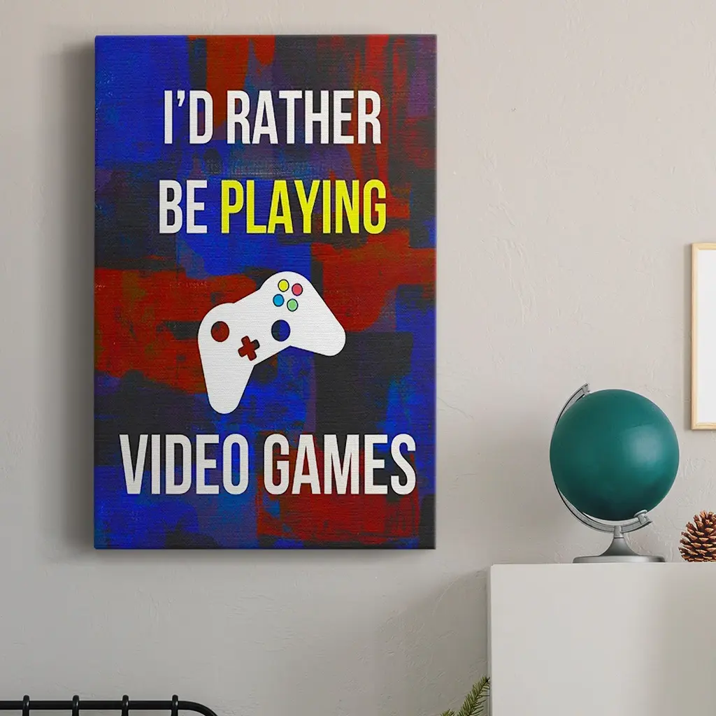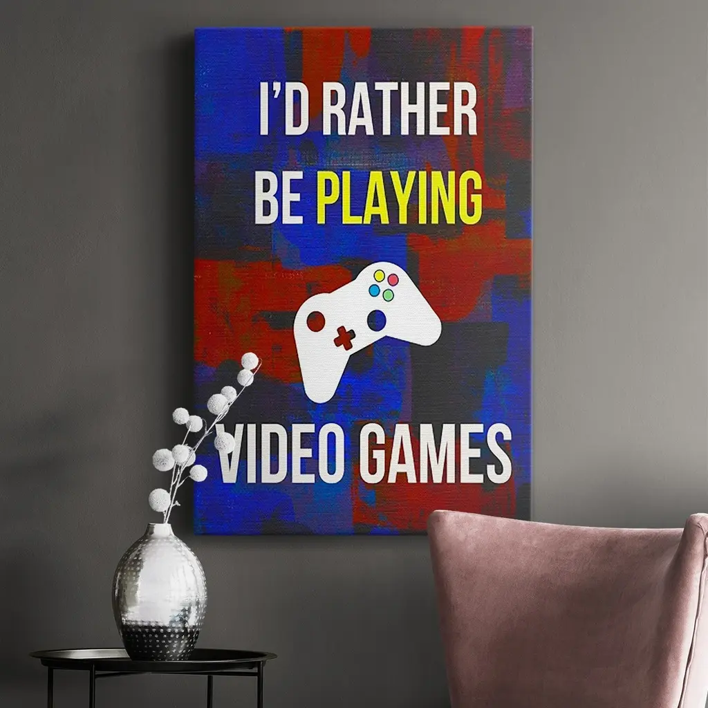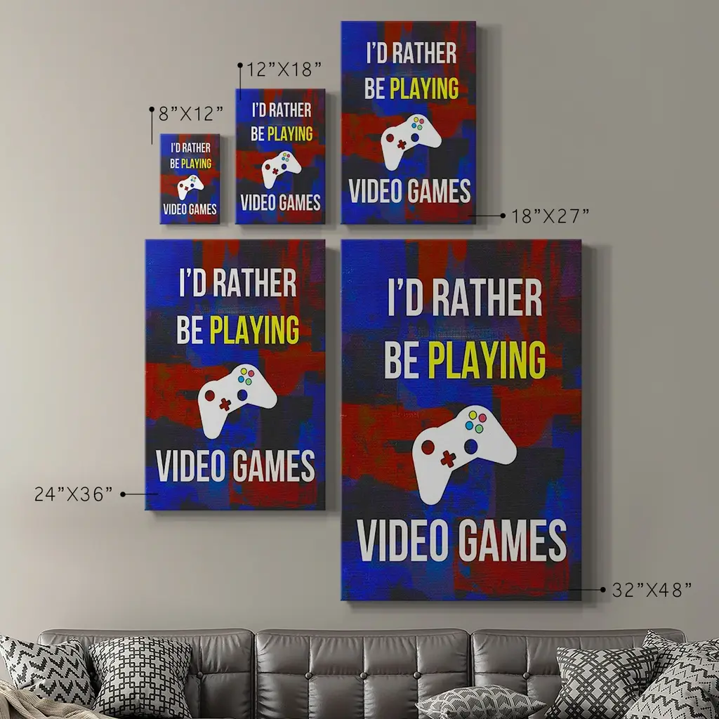 Gamer at Play III Premium Gallery Wrapped Canvas - Ready to Hang A premium hand stretched gallery wrapped canvas print created to last. Featuring a beveled a solid wood stretcher bar, each piece comes ready to hand 6 SIZES AVAILABLE 8''X12'' - Overall Size 12''X18'' - Overall Size 18''X27'' - Overall Size 24''x36'' - Overall Size 32''x48'' - Overall Size 40''x60'' - Overall Size Each piece is made to order. Built to Last Each piece comes ready to hang Solid wood stretcher Fade and Water resistant Made domestically