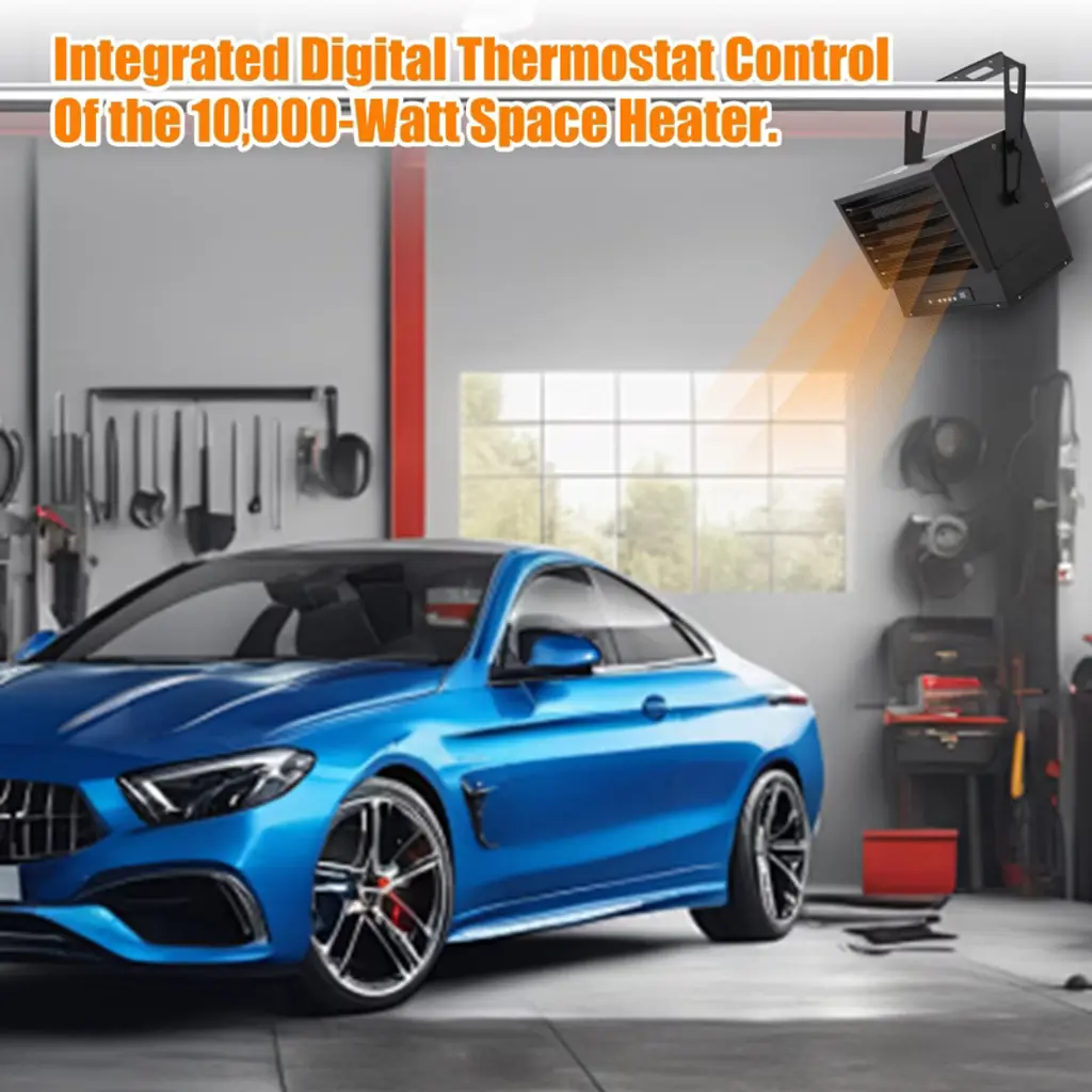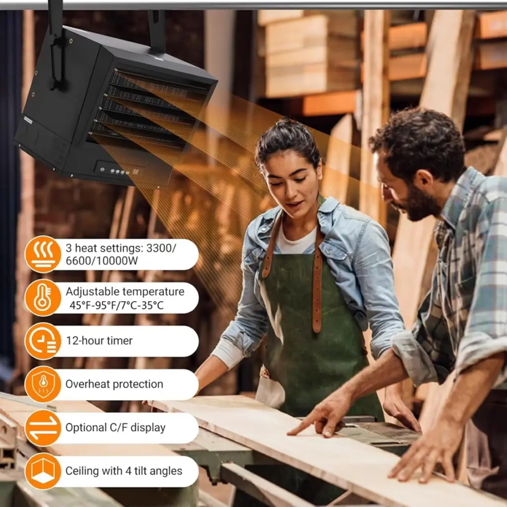 Garage Heater, Electric Garage Heater 10000W 240V Hardwired - Digital Thermostat with Remote Control, 12-Hour Timer, Fan-Forced Shop Heater for Large Workshops?? Efficient Heat & Powerful OutputExperience industrial-grade heating performance with this 10,000W garage heater capable of warming spaces up to 1,500 square feet. Generating maximum BTUs of 34,120, this powerhouse delivers exceptional heating capacity for large workshops, garages, and commercial spaces. The adjustable louvers and variable mounting angles allow precise direction of heat output, ensuring optimal warmth distribution. The included 12-hour programmable timer enables automated operation according to your schedule, while the remote control provides convenient temperature adjustment from anywhere in your workspace.??? Precise Digital Temperature ControlAchieve perfect climate management with the advanced digital thermostat offering adjustable temperature ranges from 45-95¡ãF (7-35¡ãC). Choose from three power settings¡ª3,300W, 6,600W, and 10,000W¡ªto match your specific heating needs during varying weather conditions. The intelligent overheating protection system features a built-in sensor that automatically shuts off the unit if unsafe temperatures are detected, ensuring reliable operation and protection for both the equipment and your property.??? Industrial-Grade Durable ConstructionBuilt to withstand demanding environments, this commercial heater features a heavy-gauge steel body that ensures exceptional durability and long-term reliability. The fully sheathed heating elements provide enhanced safety and protection, while the enclosed motor design safeguards against dust and debris intrusion, making it ideal for use in challenging workshop conditions. The robust construction maintains reliable performance even in poorly insulated areas with significant temperature fluctuations.??? Safety-Enhanced Sturdy BuildEngineered for commercial applications, this heater's heavy-gauge steel construction provides superior durability in challenging environments. The rugged design withstands the demands of poorly insulated spaces while maintaining consistent performance through temperature variations. The enhanced structural integrity ensures long-lasting operation, making this heater a reliable heating solution for commercial and industrial settings where equipment longevity is essential.?? Professional Ceiling Mount InstallationDesigned for straightforward ceiling mounting, this heater includes an adjustable mounting bracket for precise positioning to suit your specific space requirements. The professional installation process ensures optimal performance while the built-in overheating sensor provides automatic safety shutoff protection. The comprehensive safety design and straightforward installation allow seamless integration into your workspace, delivering efficient and effective heating for your commercial or residential garage environment.?? Technical Specifications: Brand: TruAIR Color: Black Product Dimensions: 21.06"D x 20.87"W x 21.46"H Item Weight: 47.62 Pounds Power Source: 240V Hardwired Heating Method: Fan-Forced Air Heat Output: 34,120 BTU Power Settings: 3,300W / 6,600W / 10,000W Coverage Area: Up to 1,500 sq ft Temperature Range: 45-95¡ãF (7-35¡ãC) Timer: 12-Hour Programmable Control: Remote Control Operation Special Features: Digital Thermostat, Overheat Protection Installation: Ceiling Mount (Bracket Included) Construction: Heavy-Gauge Steel Body ? Key Product Features:? Industrial heating power - 10,000W, 34,120 BTU output? Three power settings - 3,300W, 6,600W, 10,000W options? Digital thermostat - precise temperature control (45-95¡ãF)? Remote control operation - convenient adjustment from anywhere? 12-hour programmable timer - automated scheduling? Ceiling mount design - saves floor space, optimal heat distribution? Heavy-gauge steel construction - commercial-grade durability? Overheat protection - automatic safety shutoff? Enclosed motor design - protects against dust and debris? Large coverage area - heats up to 1,500 square feet
