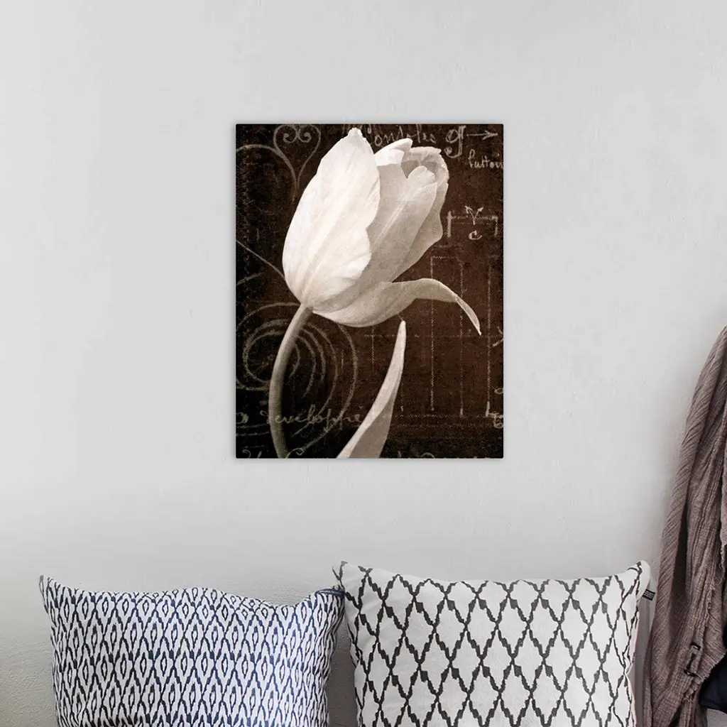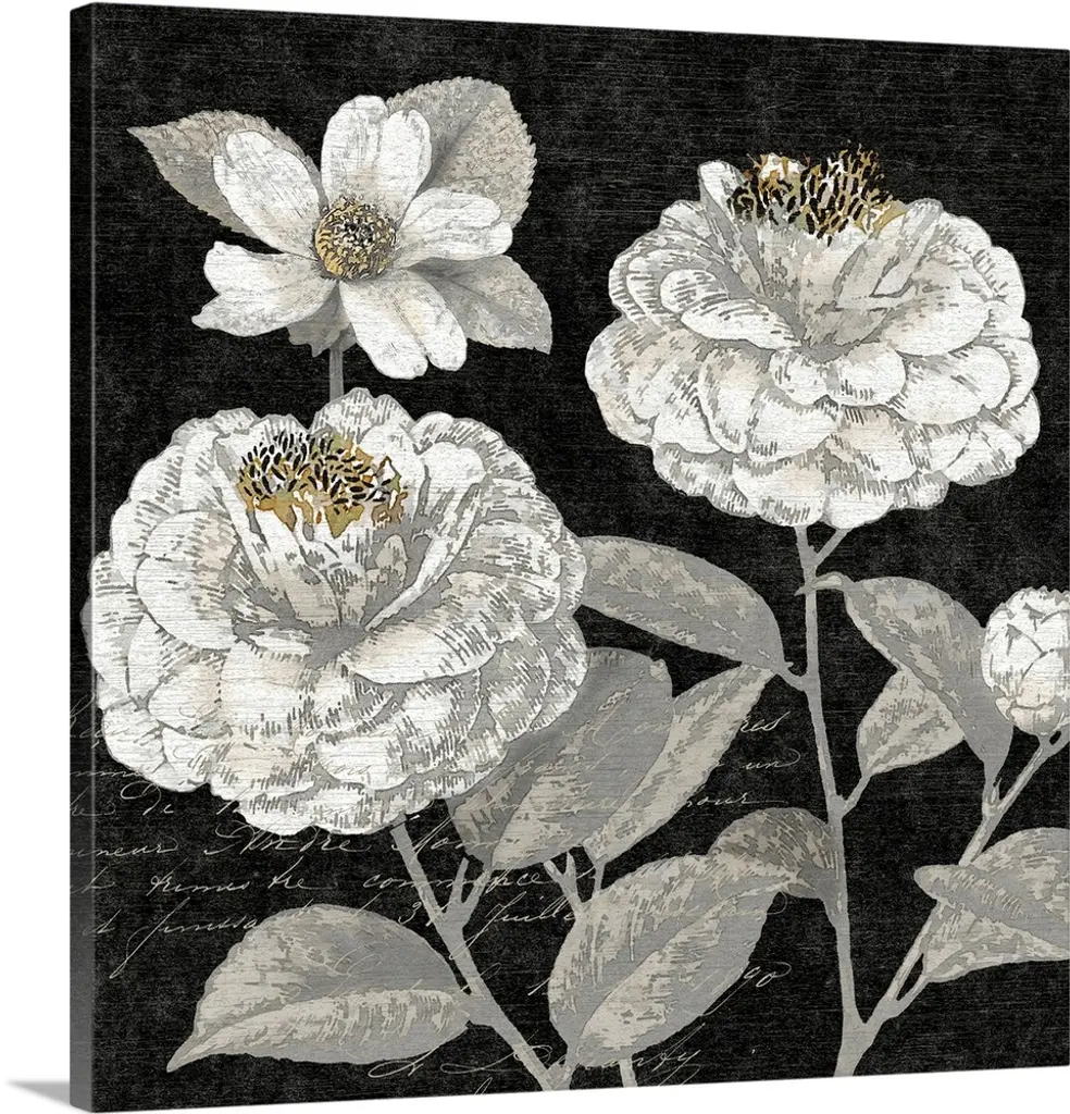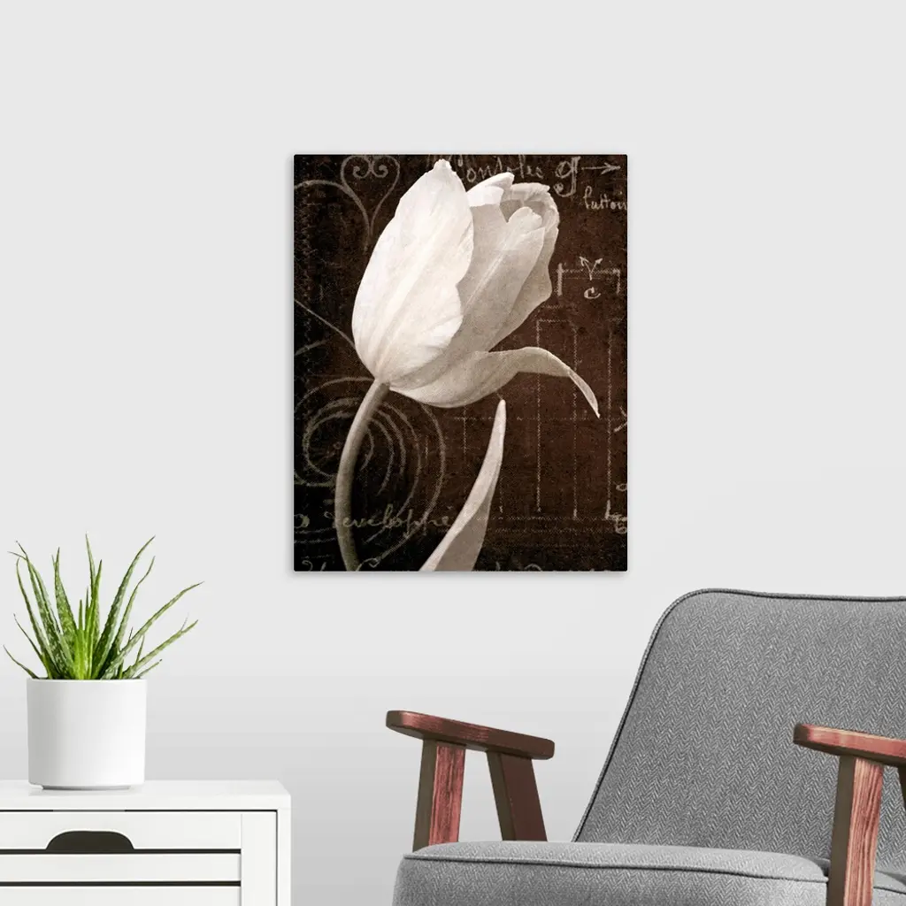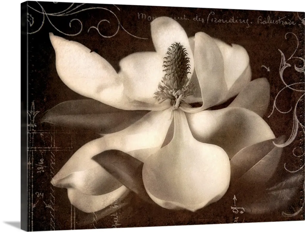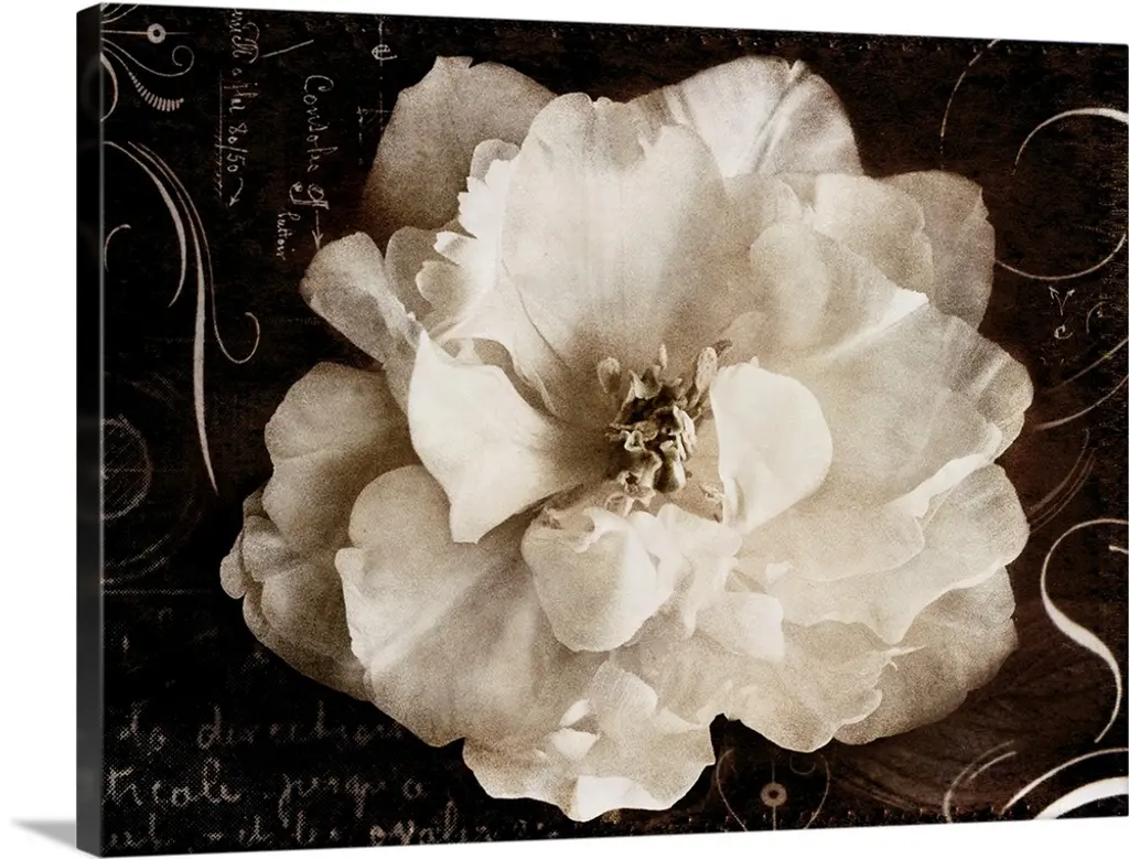Huge floral art focuses on a close-up of a single flower against a backdrop filled with hearts, arrows and swirls, as well as text.