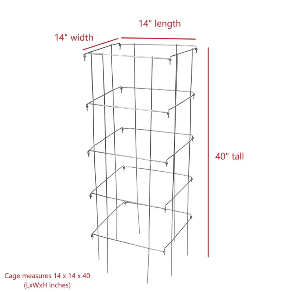 Assembling the poles with buckles is simple, time-saving, and effortless, collapsible for easy storage when not in use. The Garden Elements Cassie’s Collapsible Square Tomato Cage provides stability and support for various tomato varieties and climbing plants. Each set includes three cages, each measuring 14 x 14 x 40 (inches L x W x H) and weighing approximately 3 pounds. Featuring a durable galvanized steel construction, the cage is rust and corrosion-resistant for long-term use. Its innovative design includes 8 sturdy legs for stability and ample side bars to support plants, keeping fruits and vegetables off the ground to prevent rot and animal damage. Assembly is quick, tool-free, and collapsible for convenient storage, making it an ideal solution for gardeners seeking easy-to-use, reliable plant support!