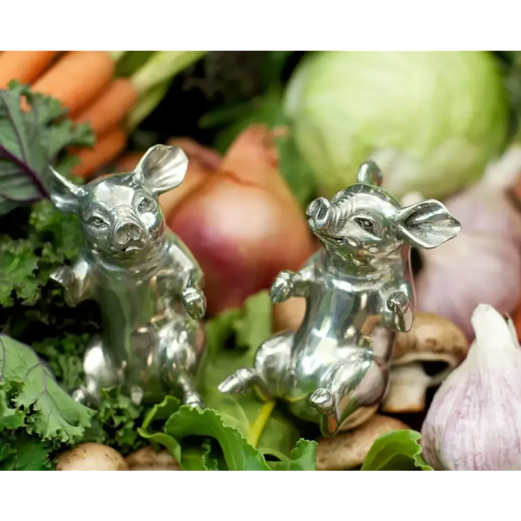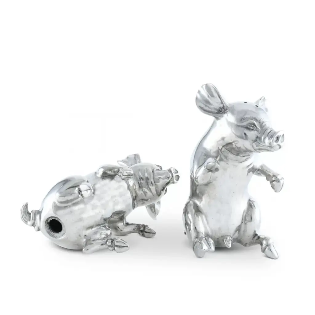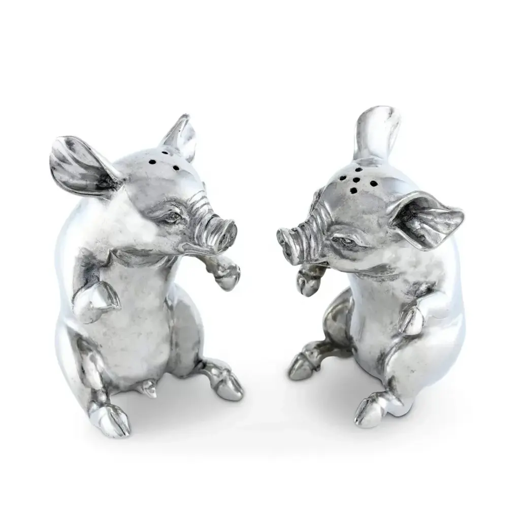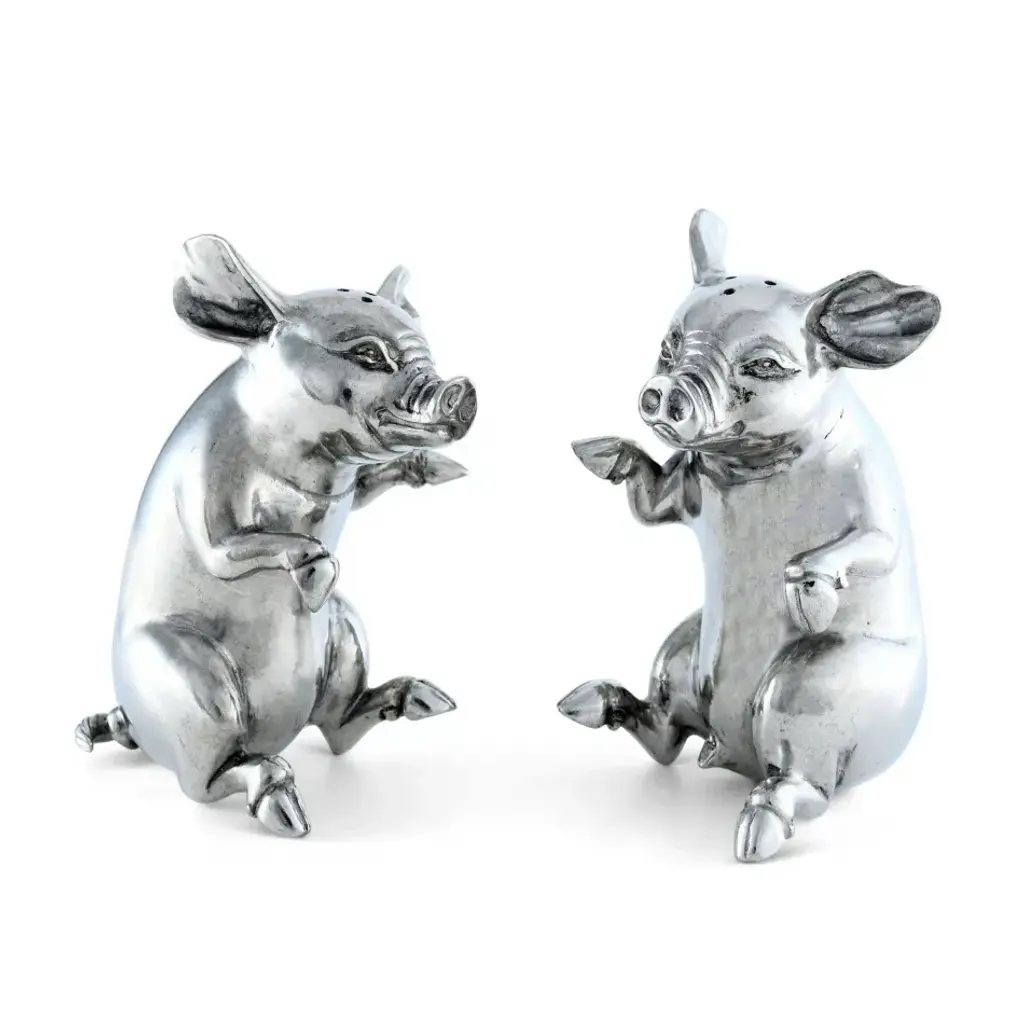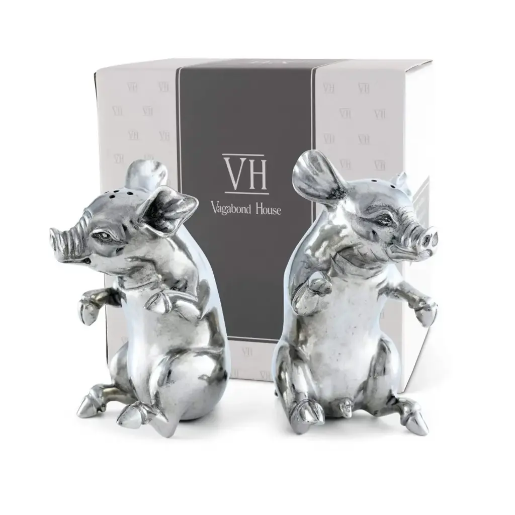 Sitting up and begging for a treat or two, these two little Vagabond House happy pigs are actually a whimsical, charming salt and pepper set. Crafted in luxury-grade pewter, these adorable animals are realistically detailed down to their curly tails. Their round bodies and whimsical expressions only add to the charm of this set. Vagabond House is a family-owned American company specializing in fine pewter tableware, servingware and giftware. Largely inspired by nature, their exclusive products are designed to be unique, functional heirlooms for those who seek to express tradition and style in both family and formal entertaining.