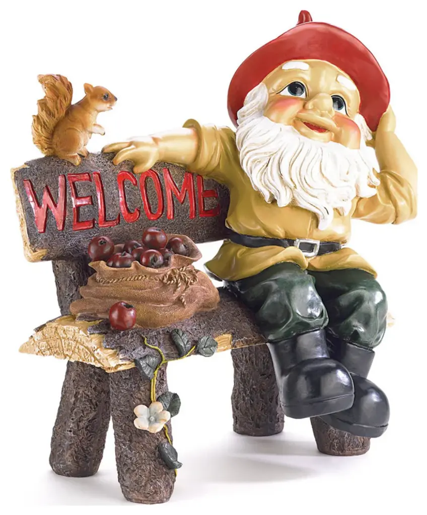 GARDEN GNOME GREETING SIGNAn apple-cheeked forest gnome perches perkily on his hand-hewn bench, grinning a greeting to one and all.GARDEN GNOME GREETING SIGNMaterial, POLYRESINManufacturer -Summerfield TerraceProduct Category, PATIO, LAWN & GARDENItem Length, 13.375Item Width, 9Item Height, 14