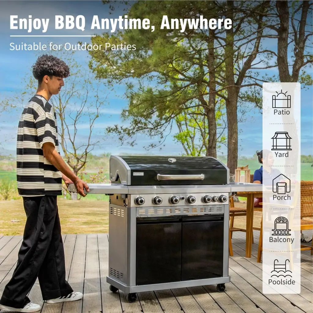 [Captiva Designs]Introducing the Captiva Designs Propane Gas Griddle Grill Combo and 6-Burner BBQ Grill, perfect for outdoor cooking enthusiasts. Both models feature durable porcelain-enameled cast iron grates that ensure even heat distribution and resist rust and chipping. With a generous cooking area—696 SQIN for the griddle combo and 740 SQIN for the BBQ grill—these grills are ideal for family gatherings and outdoor events. Equipped with 54,000 BTU high-output burners, enjoy consistent cooking results whether grilling steaks or sautéing vegetables. Easy-to-clean designs include tilt grease trays for hassle-free maintenance. Plus, benefit from dedicated customer service before and after your purchase, ensuring your investment is protected. Elevate your grilling experience with Captiva Designs! 6 Burners Dimensions: Product: 20.7"D x 62.2"W x 44.5"H Cooking Space (sq. in.): 740 Square Inches Primary Burner BTU's: 52000 Number of Burners: 6 grill and griddle Dimensions: Product: 66.4"D x 21"W x 42.2"H Product Weight (lb.) 115 lb Primary Cooking Space (sq. in.): 570 sq in Secondary Cooking Space (sq. in.): 126 sq in Primary Burner BTU's: 54000 Number of Burners: 5 Packages Includes: Gas Grill x 1 Instruction Manuals (come with each box) Assembly Time: About 1 hour