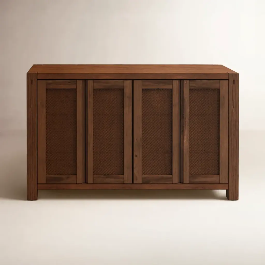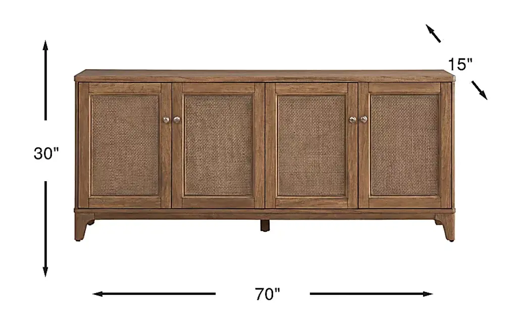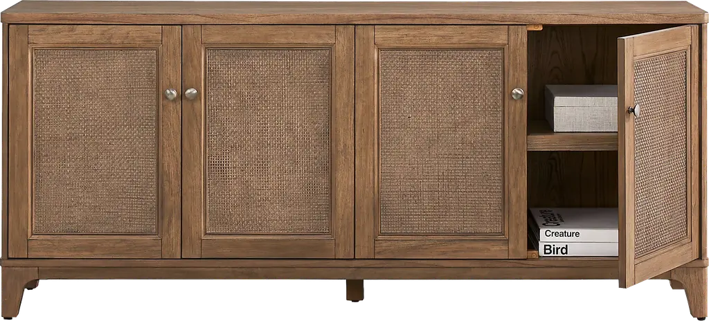 Timeless form with organic textures, warm tones and woven details in the Garden Grove collection brings the enduring charm of a warm cup of tea and heartwarming memories. Transitional in style, this console showcases an earthy brown finish and wicker inlayed panel doors, creating a rich and delightful accent. Two sets of cabinet doors feature adjustable shelving for customizable organization, while silver knobs complete the look with understated elegance.