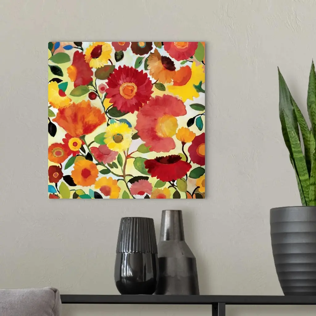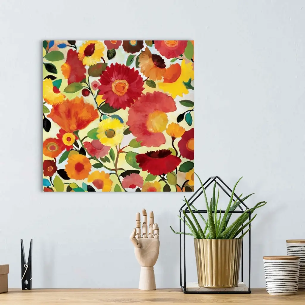 A series of flowers and leaves in warm colors and a soft style against a pale cream background.