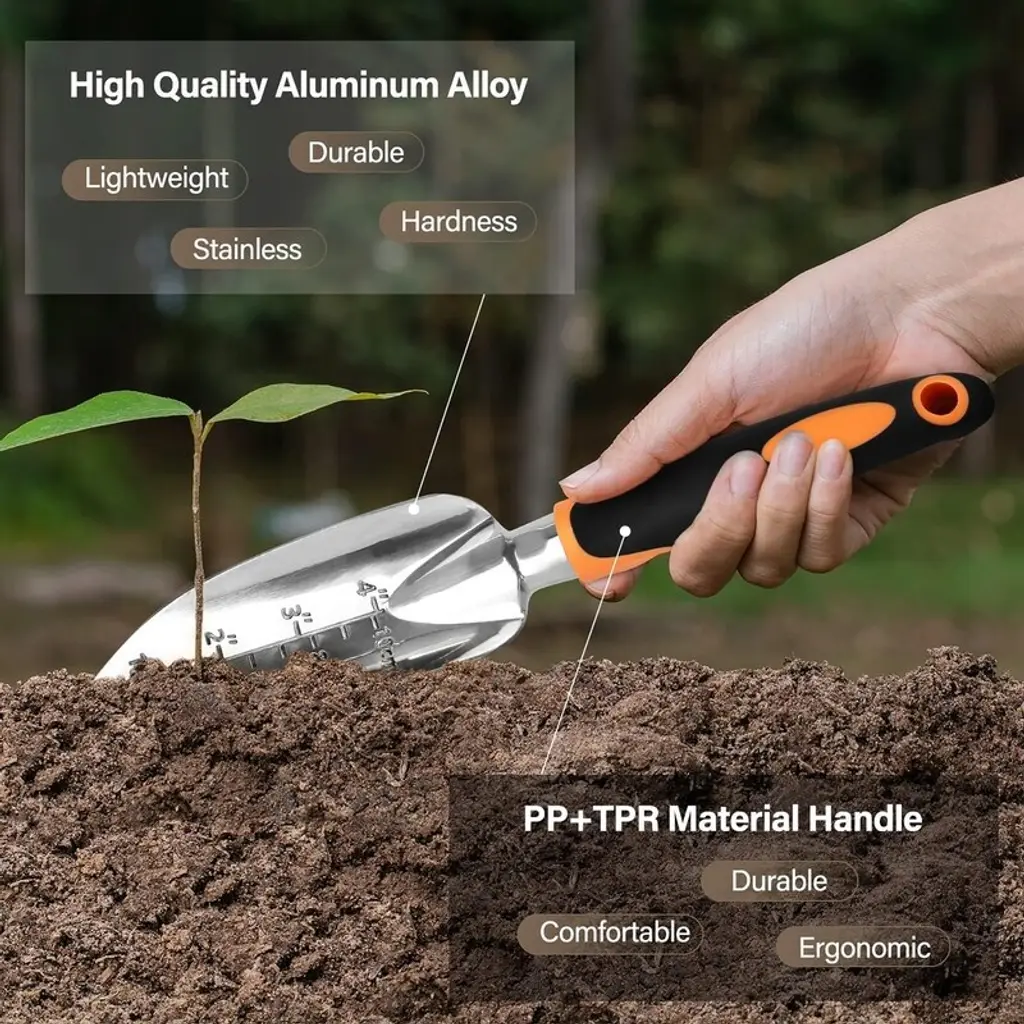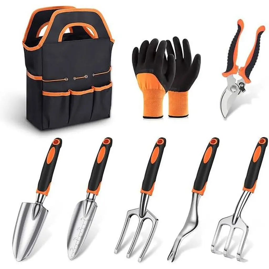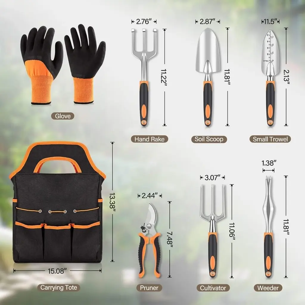 Value Set: Including a pair of gloves, soil scoop, small trowel, cultivator, hand rake, pruner, weeder and an tote bag to keep all the tools packed away. This set includes all the tools you will need. Meet All Your Needs: These tools will help you with digging, weeding, raking, loosening, aeration, transplanting and pruning for all your indoor and outdoor gardening needs. The pruning shears are sharp enough to cut thicker branches. High Quality Tools: These tools are made of high quality aluminum alloy, which is light weight and durable. Compared to stainless steel, the aluminum alloy have better hardness and rust resistance. The handle is ergonomically designed, non-slip and suitable for long time use. Tote Bag: The tote bag allows you to easily put all the tools in and carry them easily to where you want to go. The storage bag is made of Oxford cloth, very durable, resistant to dirt and not easily damaged. Gift Idea: This gardening set is a great choice for a gift. For someone who loves gardening, such a high quality set of gardening tools is undoubtedly the best gift. Suitable as a Christmas gift, Valentine's Day gift and Birthday gift for women and men.
