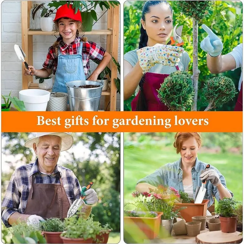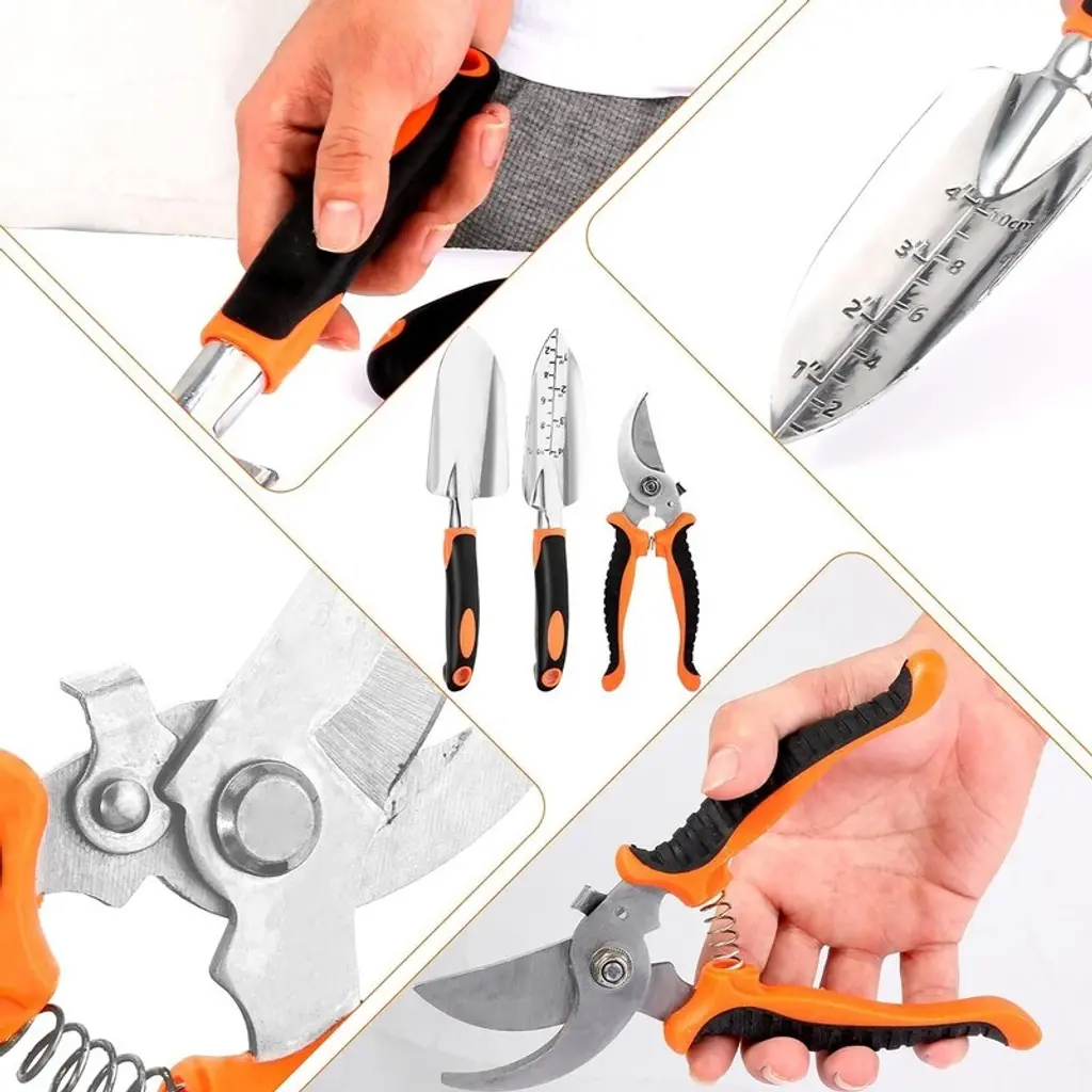 DURABLE AND GOOD QUALITY:trowel garden tool are very sturdy and good quality. Pruning shear is made of heavy duty stainless steel. Hand trowel and planting shovel are made of aluminium alloy. EASY STORAGE AND HANG:They are lightweight and come with a moistureproof velvet bag for quick and easy storage.You can also hang the small garden shovel and hand Trowel on the hook. MAKE PRUNING WORK EASIER:pruning shear is easy to cut branches and make trimming the leaves quick. Handy little lever for locking them when not in use.It's good for different cutting needs. MEET KINDS OF GARDEN NEEDS:It's good for taking care of the indoor plants and perfect for different garden needs, such as digging, loosening the soil, transplanting, weeding,cutting branches. GOOD CHOICE FOR GARDEN GIFT:tools set will be a special present for gardening lovers. It is the ideal gift for families,friends,colleagues, suitable for holiday, birthday, anniversary.