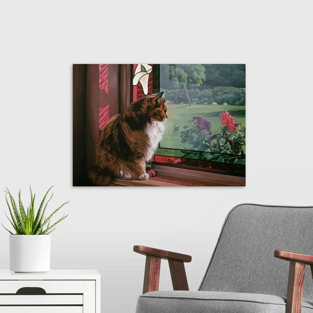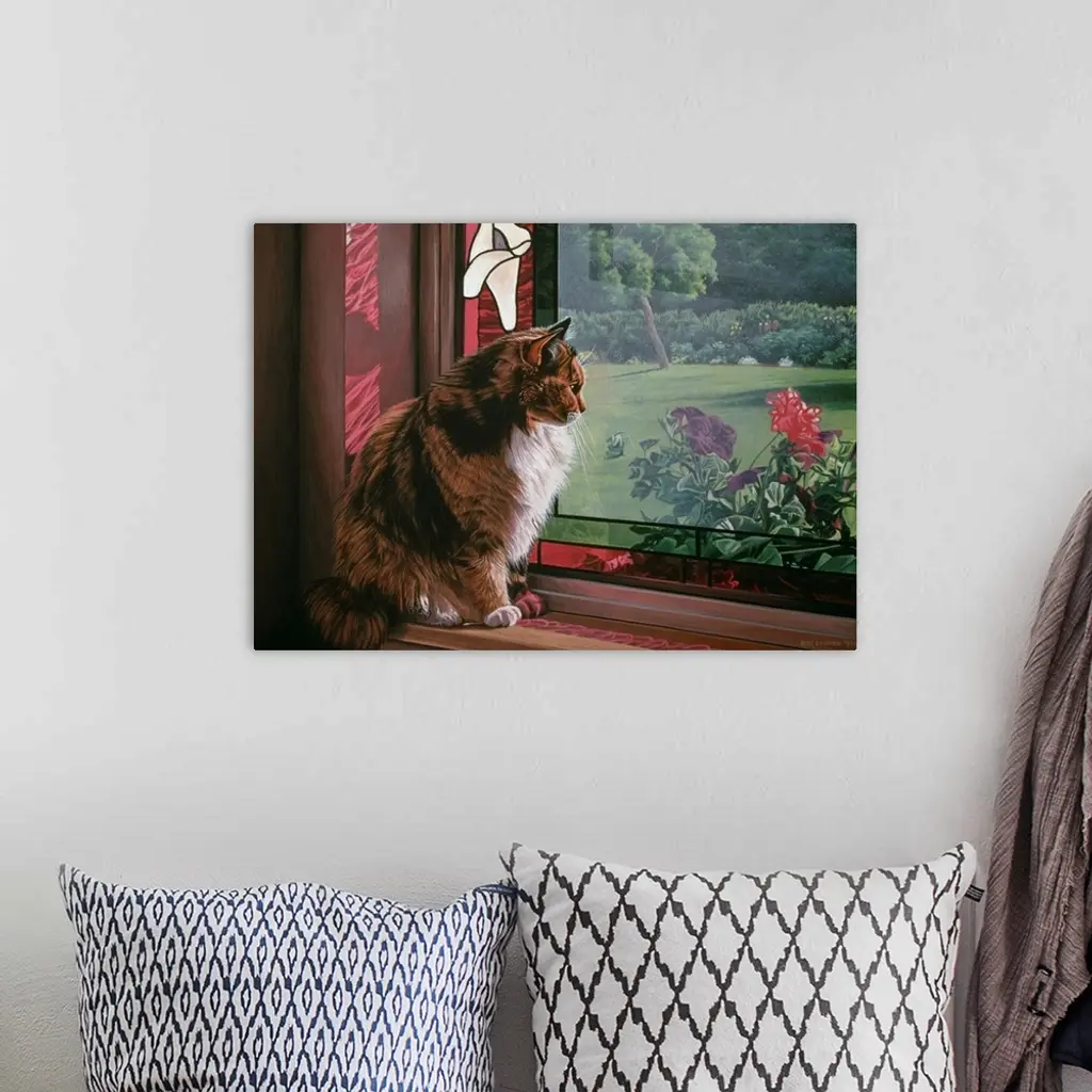 A cat sitting on a window sill looking out over the garden.