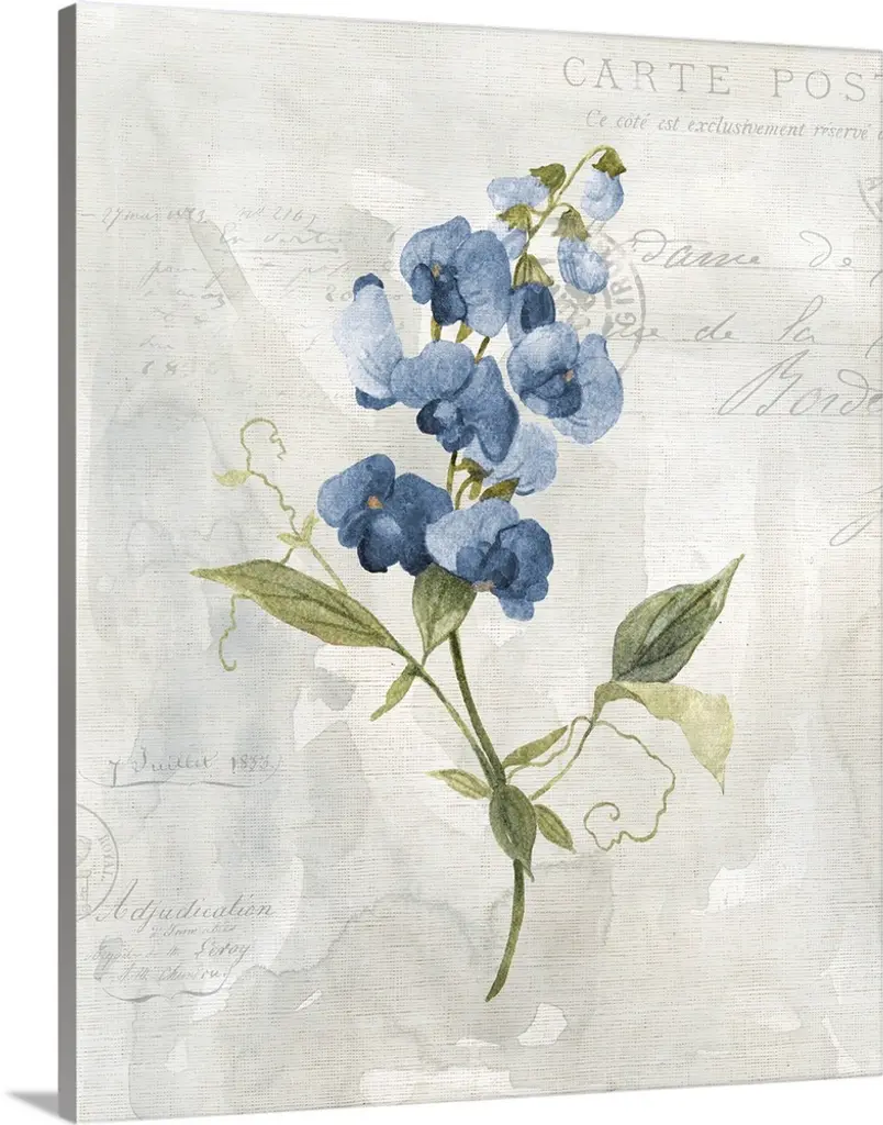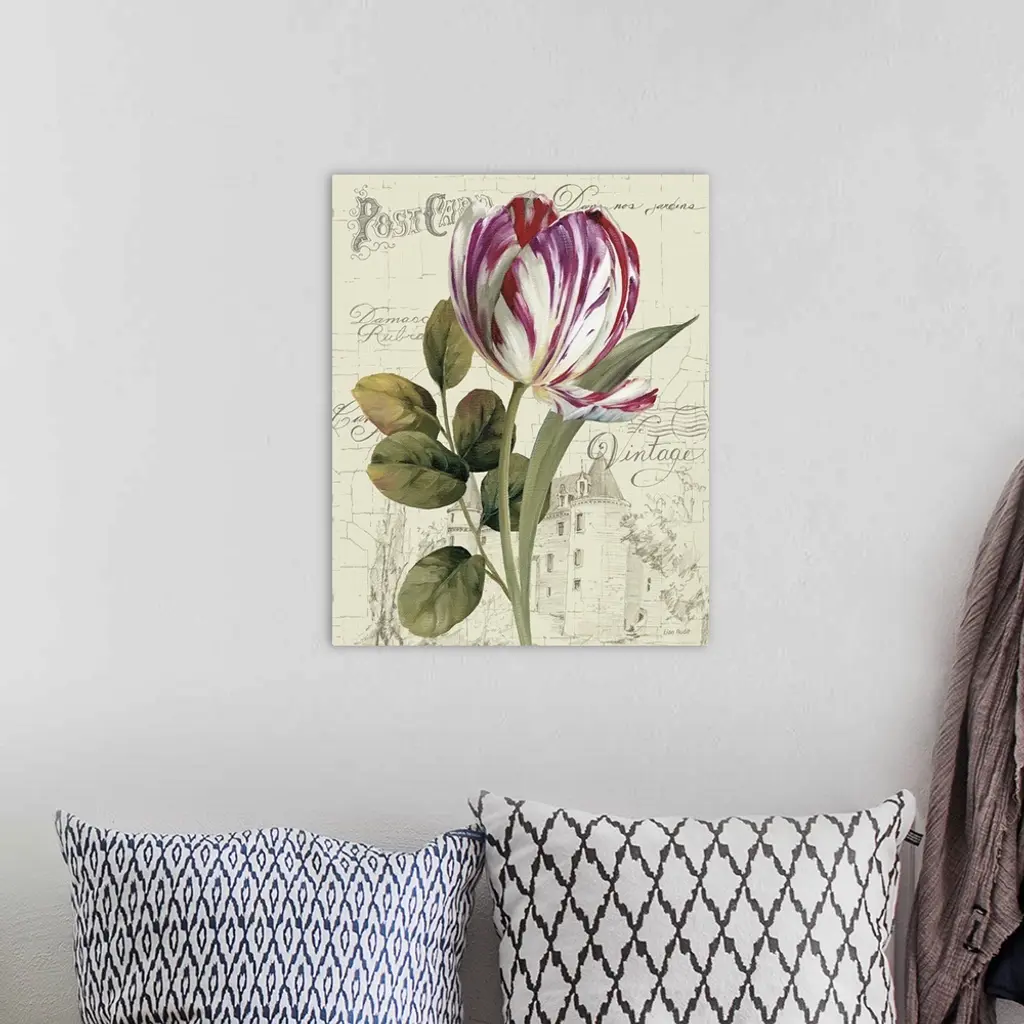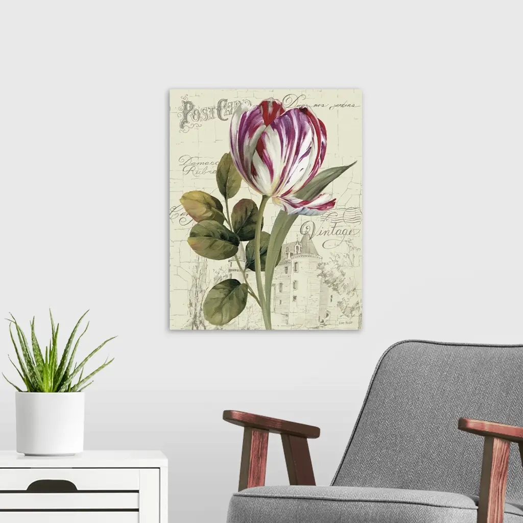 A tulip is largely painted against an antique post card with a large stone house in the background.