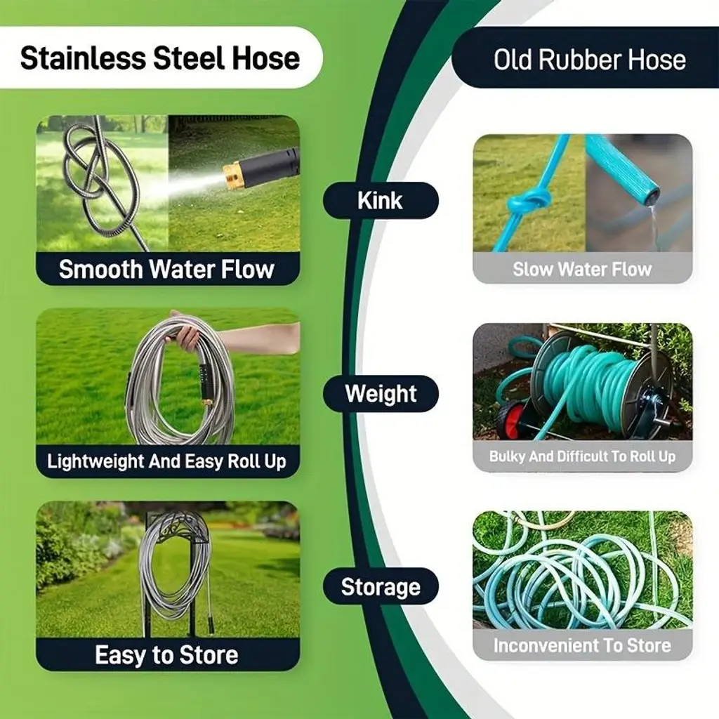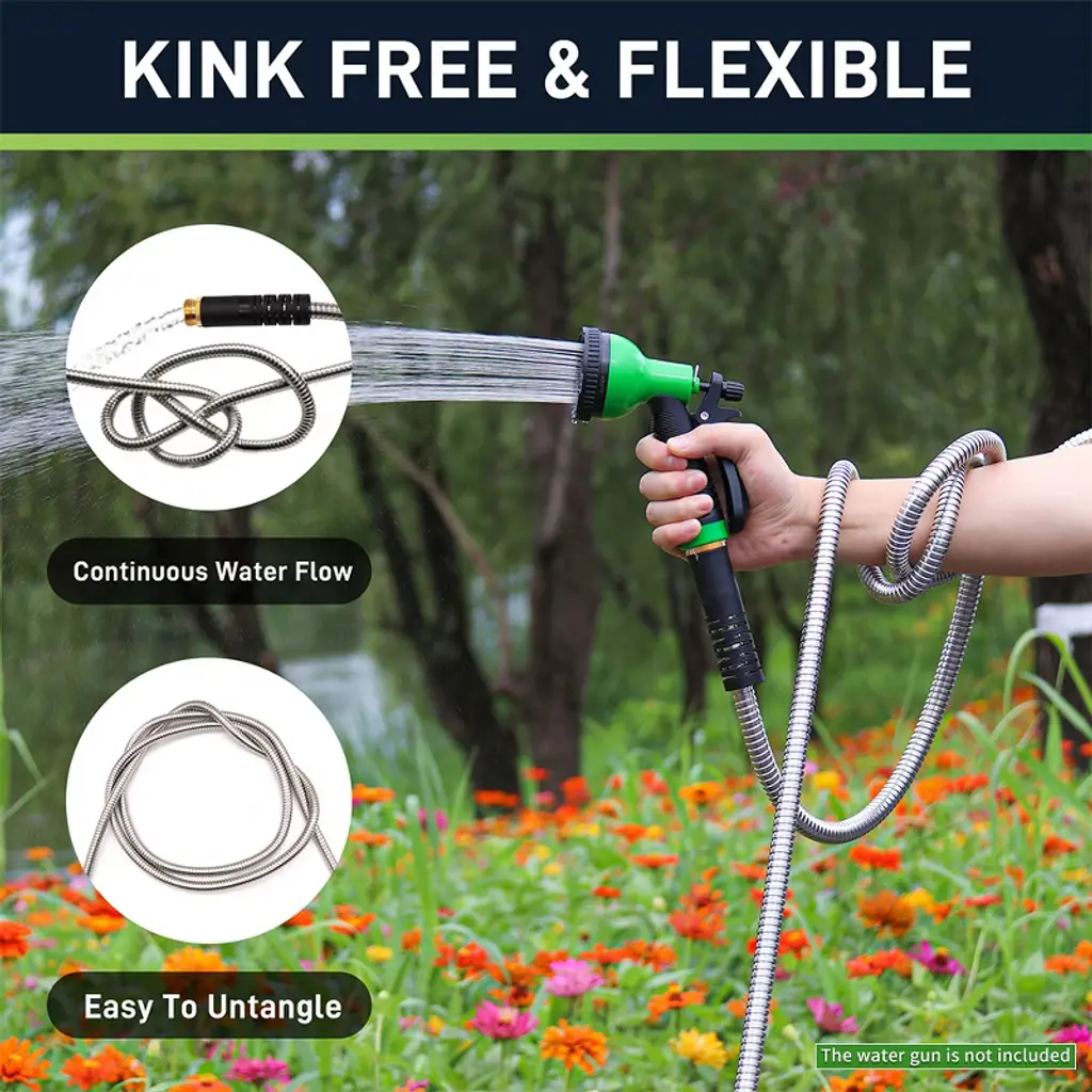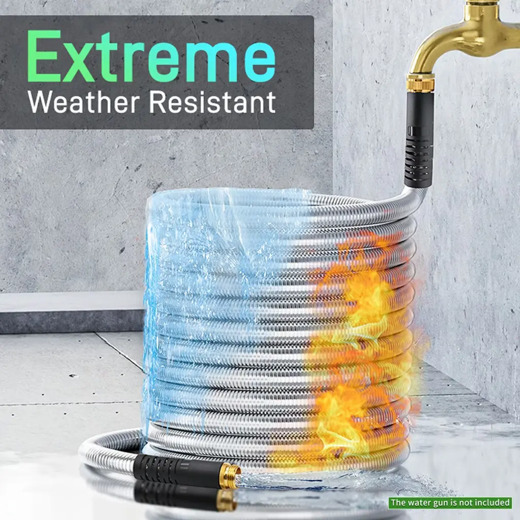 Say goodbye to kinks, tangles, and cracks with this Stainless Steel Garden Hose, designed to handle the toughest outdoor tasks with ease. Crafted from high-quality 304 stainless steel, this heavy-duty hose is built to last through every season—resisting rust, corrosion, and even animal bites. It stays cool in direct sunlight and maintains flexibility even in freezing temperatures. Unlike traditional rubber hoses, it’s ultra-lightweight and won’t kink or twist, ensuring a consistent water flow at all times. The upgraded connectors and precision-engineered O-ring seals provide a leak-proof experience, while the flexible design makes it easy to maneuver and store. Perfect for watering your garden, washing cars, cleaning pools, or bathing pets—this virtually indestructible hose is backed by a 100% warranty for complete peace of mind.
