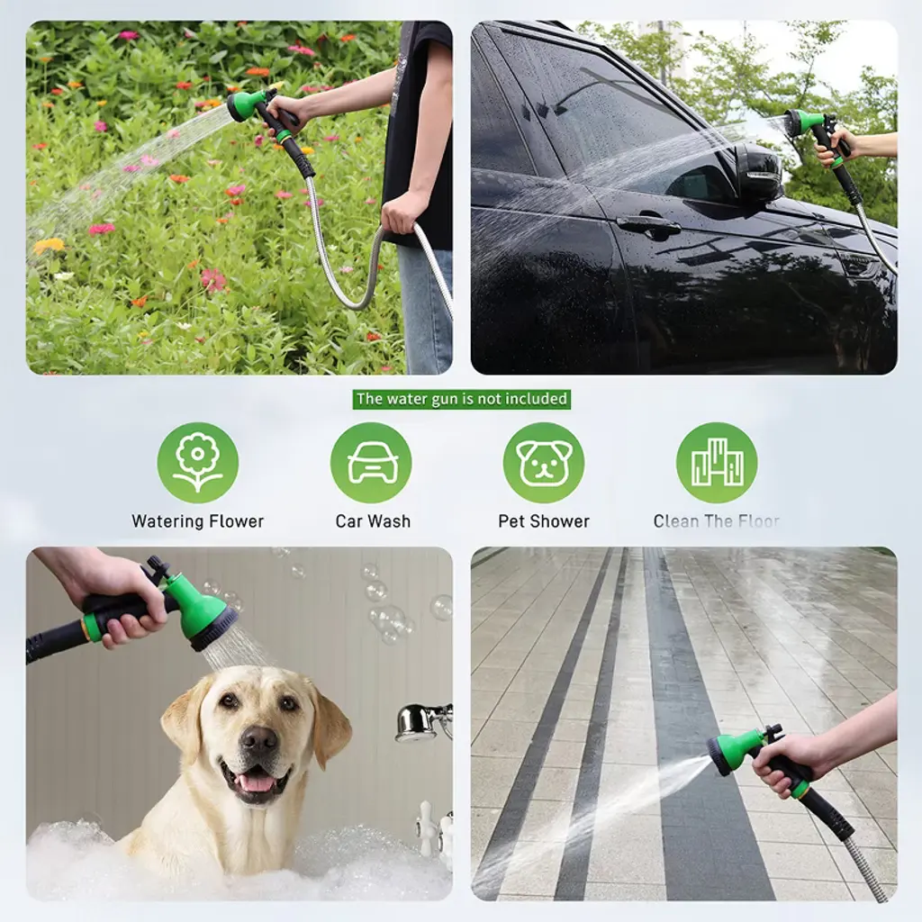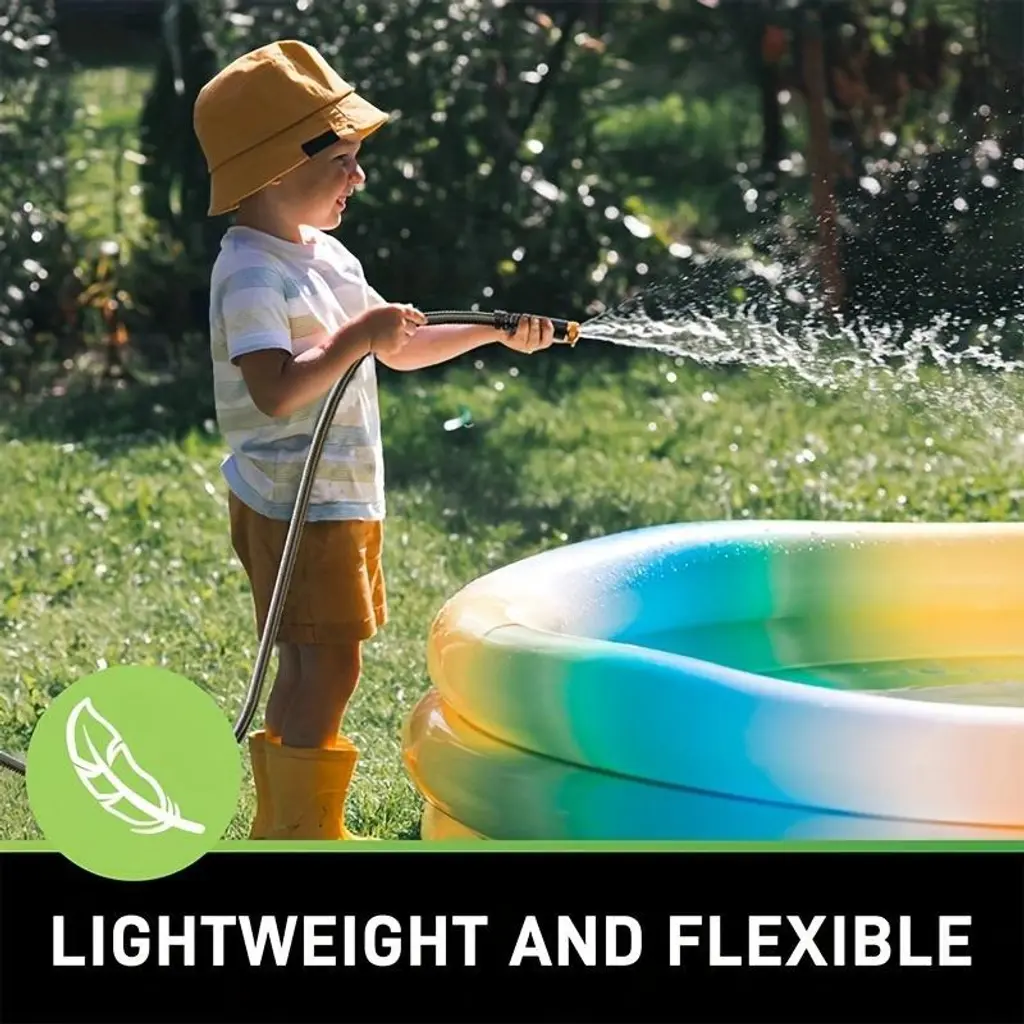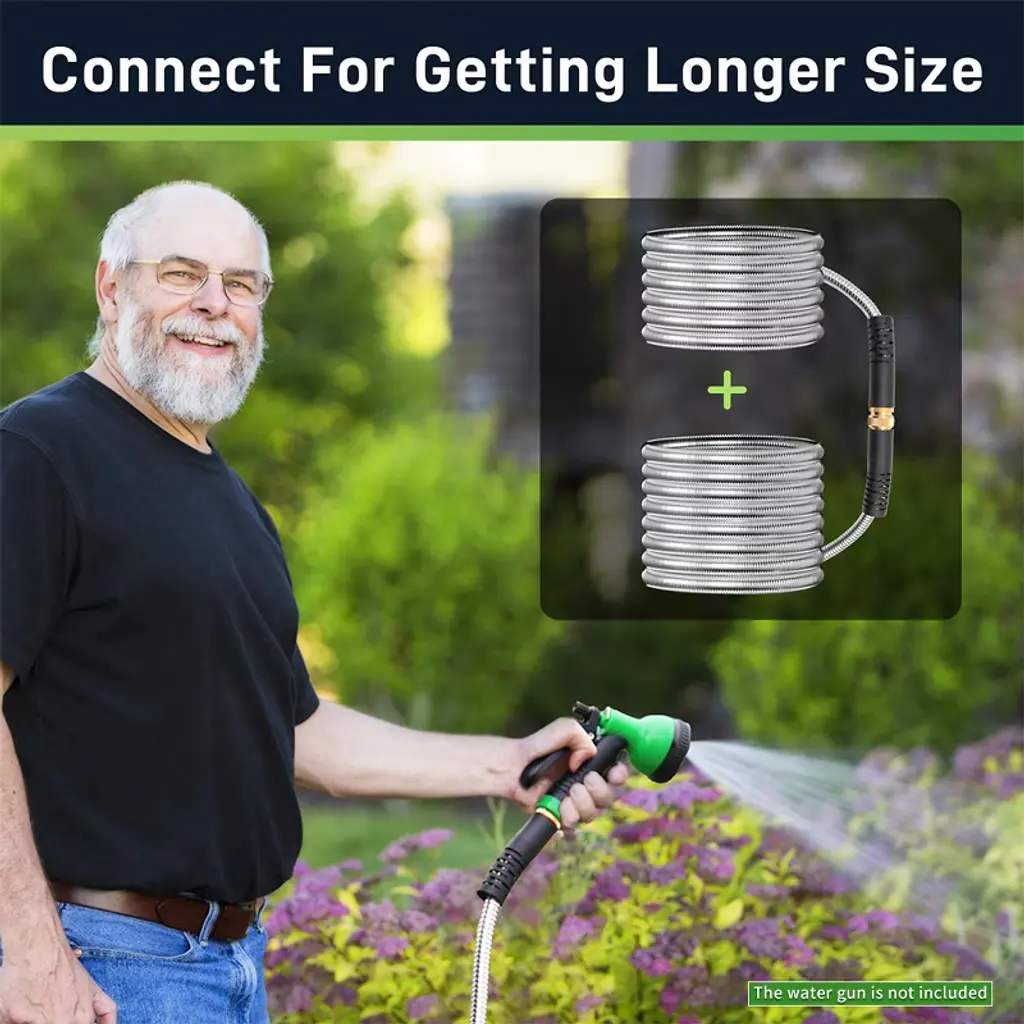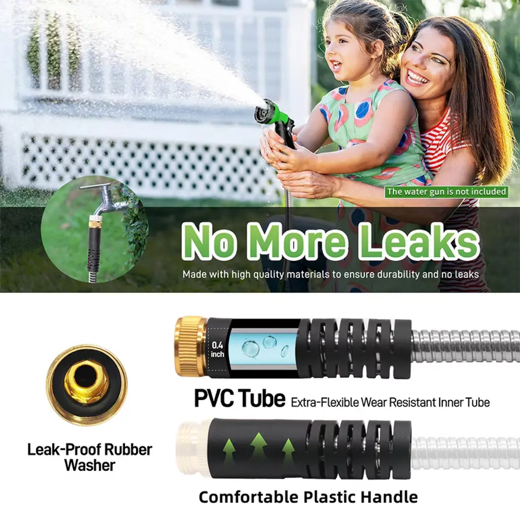 Say goodbye to kinks, tangles, and cracks with this Stainless Steel Garden Hose, designed to handle the toughest outdoor tasks with ease. Crafted from high-quality 304 stainless steel, this heavy-duty hose is built to last through every season—resisting rust, corrosion, and even animal bites. It stays cool in direct sunlight and maintains flexibility even in freezing temperatures. Unlike traditional rubber hoses, it’s ultra-lightweight and won’t kink or twist, ensuring a consistent water flow at all times. The upgraded connectors and precision-engineered O-ring seals provide a leak-proof experience, while the flexible design makes it easy to maneuver and store. Perfect for watering your garden, washing cars, cleaning pools, or bathing pets—this virtually indestructible hose is backed by a 100% warranty for complete peace of mind.