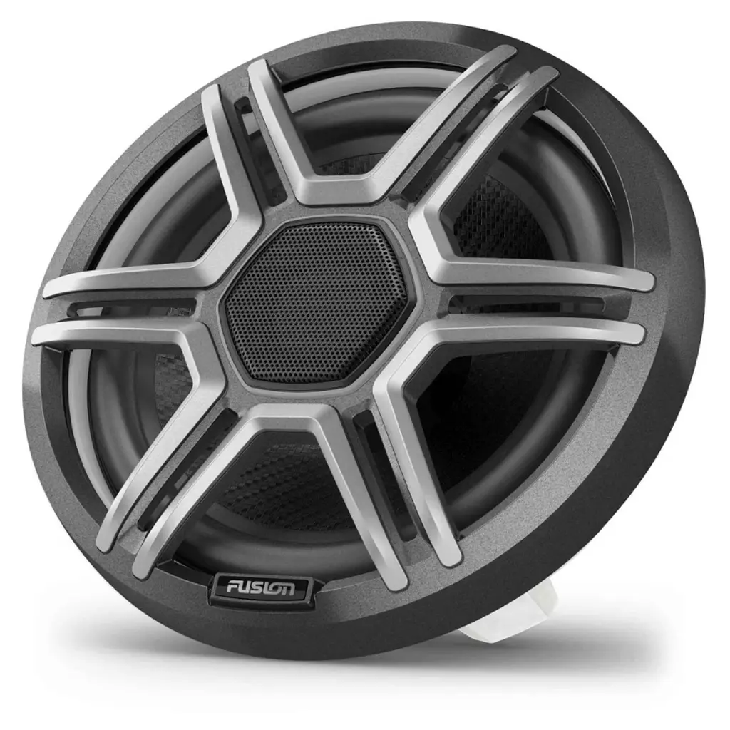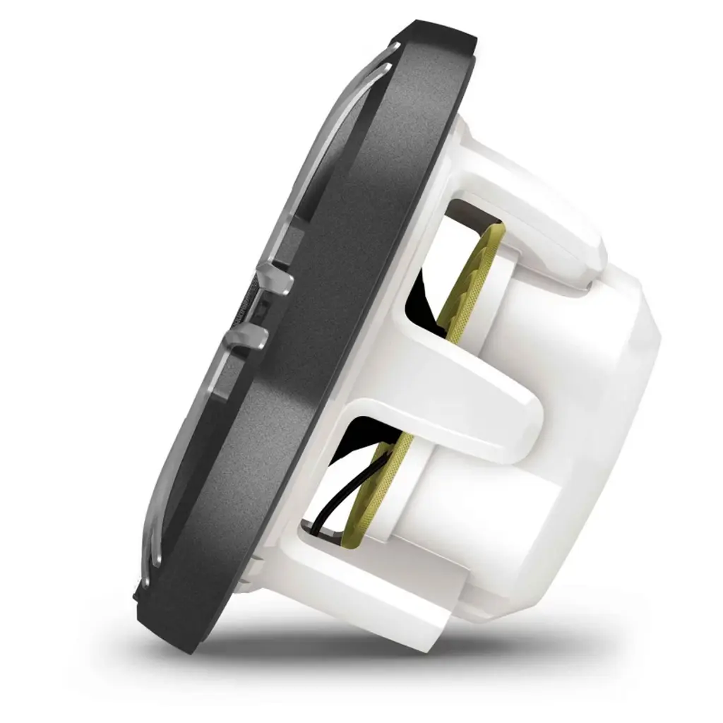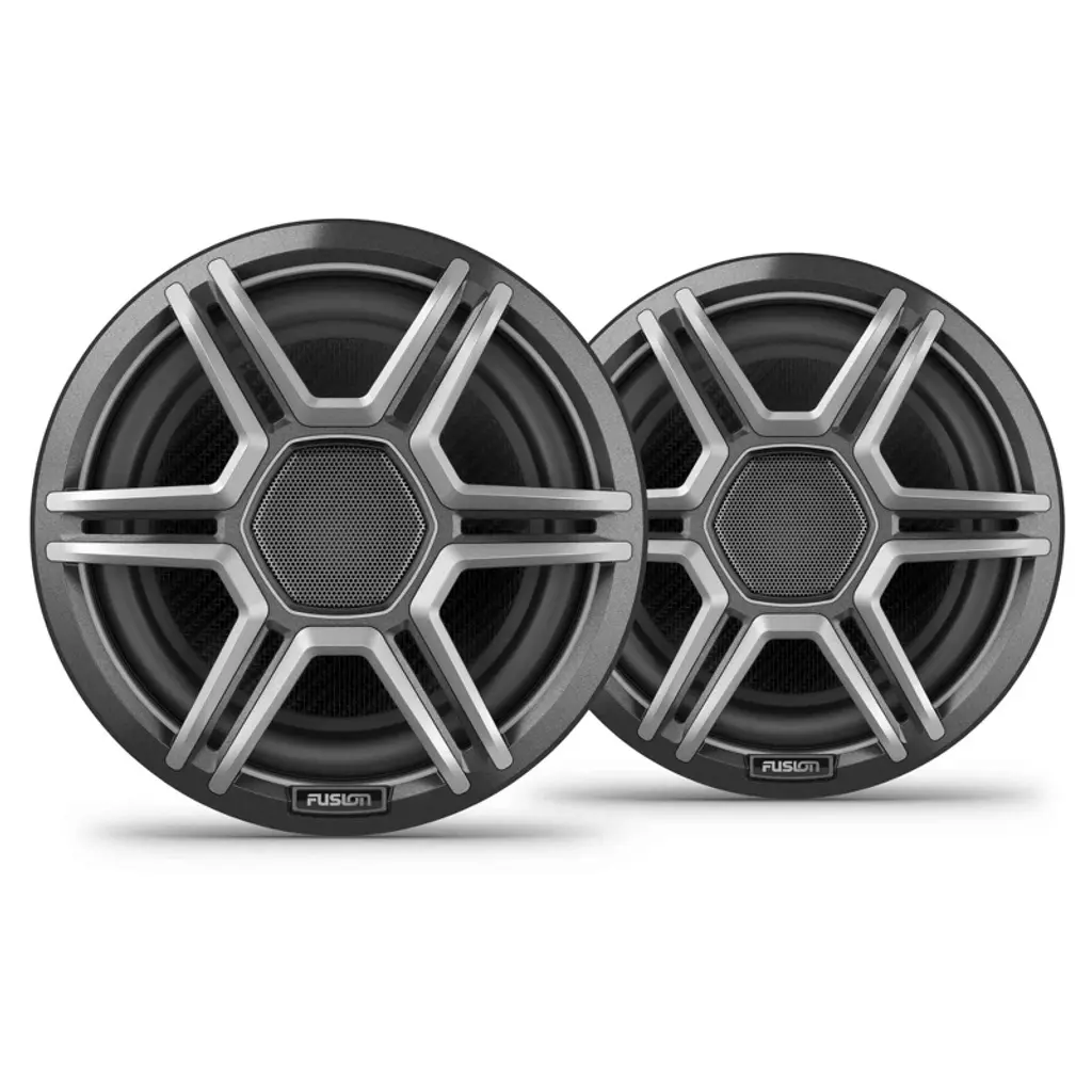 Fusion Apollo™ Speakers - 7.7" LED Marine Speakers with Sports Gray Grilles Fusion Apollo coaxial marine speakers deliver immersive, high-fidelity audio on the water and are engineered to withstand harsh marine conditions. • PREMIUM SOUND - Enjoy immersive audio at higher volumes, thanks to updated motor designs which reduce distortion for a premium sound experience. • LED LIGHTS - Showcase your boat with dual-hue LED lighting rings that provide a unique look through the distinct hexagonal tweeters. Choose from a broad range of colors to match the mood or music. • INTERCHANGEABLE GRILLES - Complete your speakers with the included sports white or sports gray interchangeable grilles. For more protection, purchase the shielded grille (also available in gray or white). • Color - Sports gray • Physical dimensions (Diameter x Depth) - 7.72" x 4.46" (196 x 113.2 mm) • Water and dust rating - IP66/IP67 • Configuration - Coaxial • Peak power - 400 W • RMS power - 100 W • Sensitivity (1 watt @ 1 meter) - 91 dB • Frequency response - 60 Hz - 22 kHz • Nominal impedence - 4 ohms • Recommended amplifier power (RMS) - 30 - 200 W/channel • LED lighting - yes (CRGBW; 5 colors) • LED supply voltage - 10.8 - 16 VDC • LED load current @14.4 VDC - 0.14 A per color, per speaker • LED load current @14.4 VDC when using Garmin Spectra™¹ - 0.31 A maximum per speaker • Operating temperature range - 32° to 122° F (0° to 50° C) • Voice coil diameter - 1.4" • Cone material - CURV® Cone Technology with rubber surround • Tweeter type - 1" Silk Dome • Compass-safe distance - 9.84 ft (300 cm) • LED connection - 5.9" (150 mm) water-resistant 6-way connector (6-pin, CRGBW and ground) • Warranty - 3 years Mounting Dimensions (Cutout) • Mounting diameter clearance - 6.14" (156 mm) • Mounting depth clearance - 3.39" (86 mm)
