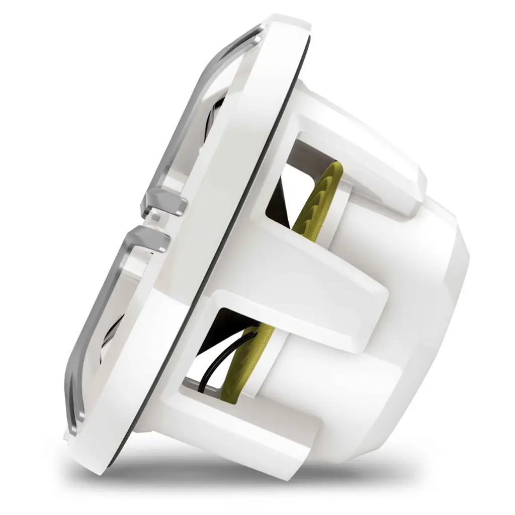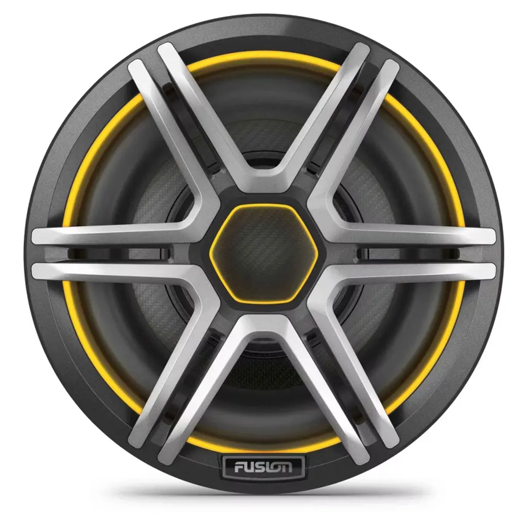 Fusion Apollo™ Subwoofer, 10" LED Marine Subwoofer with Sports Gray Grille Fusion Apollo subwoofers deliver immersive, high-fidelity bass on the water and are engineered to withstand harsh marine conditions. • PREMIUM SOUND - Enjoy immersive audio at higher volumes, thanks to updated motor designs which reduce distortion for a premium sound experience. • LED LIGHTS - Showcase your boat with dual-hue LED lighting rings that provide a unique look through the distinct hexagonal tweeters. Choose from a broad range of colors to match the mood or music. • INTERCHANGEABLE GRILLES - Complete your subwoofers with the included sports white or sports gray interchangeable grilles. Purchase the shielded grille for more protection; also available in gray or white. • Color - Sports gray • Physical dimensions (Diameter x Depth) - 10.83" x 6.92" (275 x 175.8 mm) • Water and dust rating - IP66/IP67 • Configuration - Subwoofer • Peak power - 600 W • RMS power - 300 W • Sensitivity (1 watt @ 1 meter) - 86 dB • Frequency response - 30 Hz - 2 kHz • Nominal impedence - 4 ohms • Recommended amplifier power (RMS) - 50 - 300 W • LED lighting - yes (CRGBW; 5 colors) • LED supply voltage - 10.8 - 16 VDC • LED load current @14.4 VDC - 0.19 A per color • LED load current @14.4 VDC when using Garmin Spectra™¹ - 0.40 A maximum • Operating temperature range - 32° to 122° F (0° to 50° C) • Voice coil diameter - 2" • Cone material - Polypropylene Cone with rubber surround • Compass-safe distance - 13.45 ft (410 cm) • Speaker connection - 5.9" (150 mm) water-resistant 2-way connector (2-pin, audio positive and negative) or Male spade connectors (0.25" (6.3 mm) positive and 0.25" (6.3 mm) negative) • LED connection - 5.9" (150 mm) water-resistant 6-way connector (6-pin, CRGBW and ground) • Warranty - 3 years Mounting Dimensions (Cutout) • Mounting diameter clearance - 8.78" (223 mm) • Mounting depth clearance - 5.31" (135 mm)