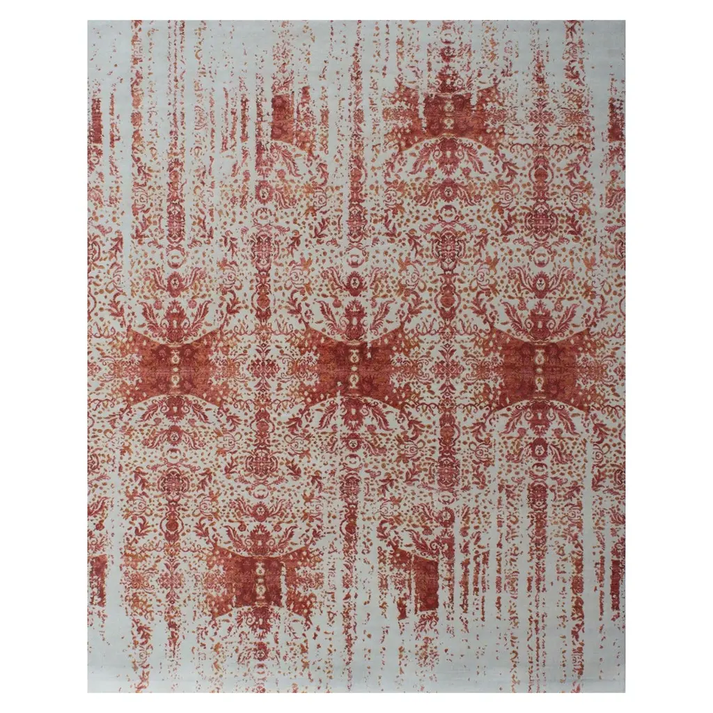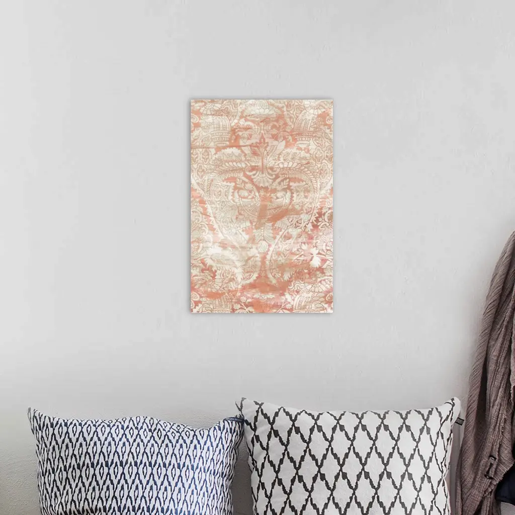 Vertical creative design of a white and peach floral design with a distressed appearance.