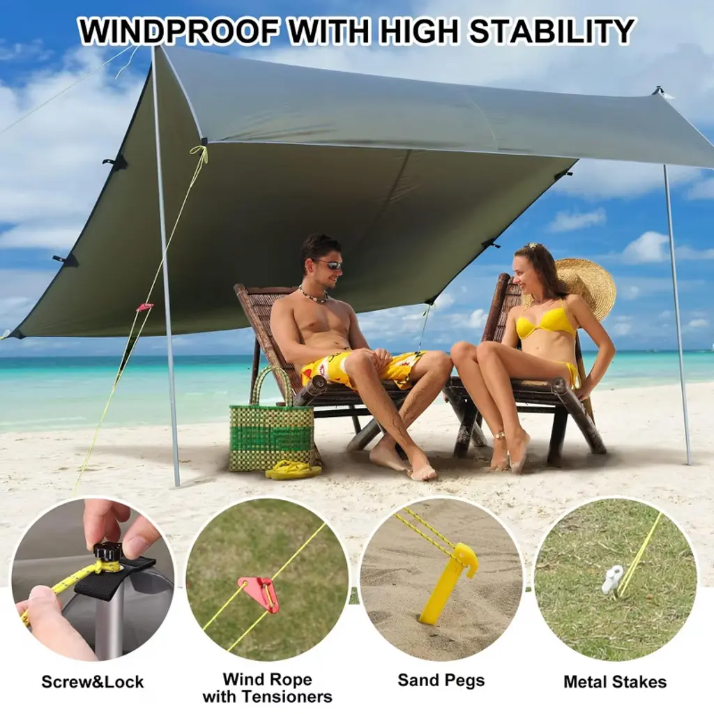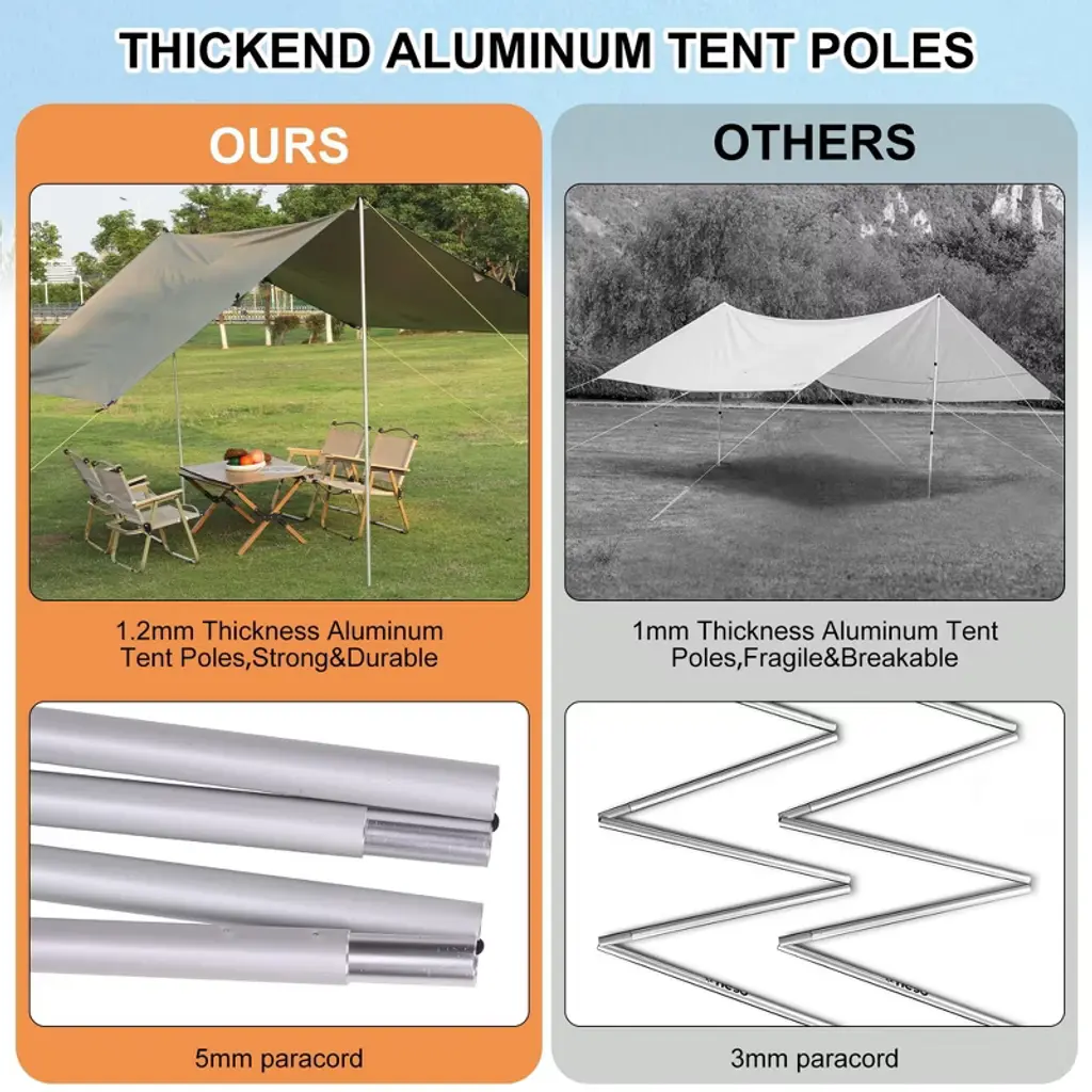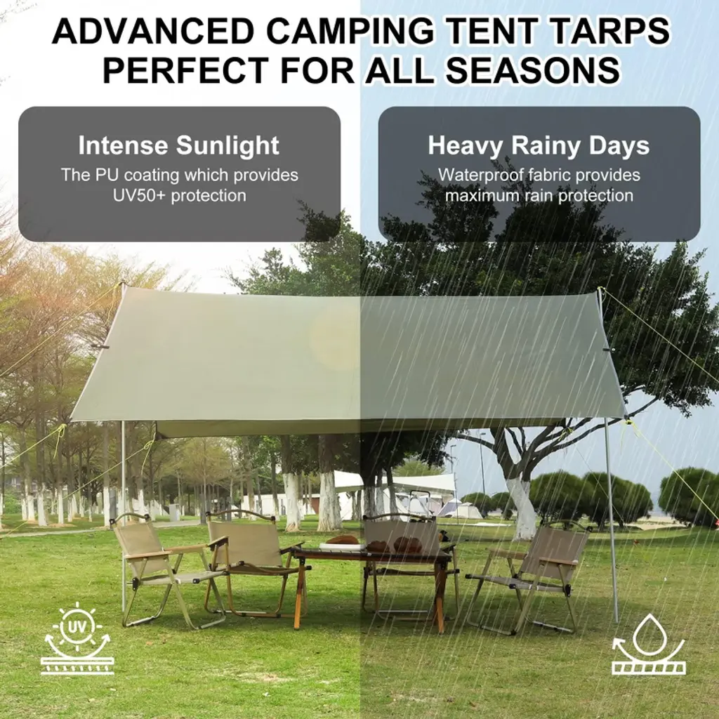 Garvee 10X9FT Camping Tarp, Hammock Rain Fly Camping Tarp Waterproof with 2 Aluminum Poles, Lightweight Backpack Tent tarp for Traveling, Green Garvee 13X9FT Camping Tarp, Hammock Rain Fly Camping Tarp Waterproof with 2 Aluminum Poles, Lightweight Backpack Tent tarp for Traveling, Green Made from ripstop 210T polyester fabric with PU waterproof coating and UPF50+ protection, this camping tarp can keep you and your belongings protected from heavy rain and strong sunlight, so you can enjoy your outdoor adventures to the fullest.