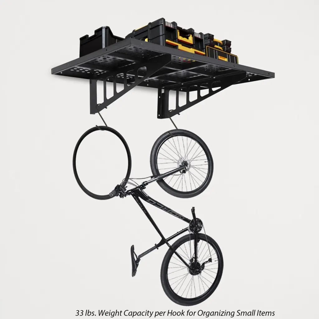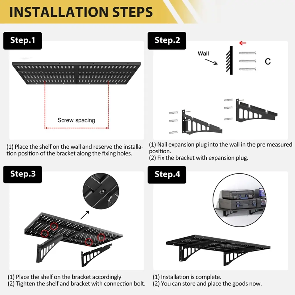Our Garage Wall Shelving The buckle design with Velcro prevents the brackets from falling or bending. Meanwhile, our storage shelf has added 2 brackets to prevent the middle iron mesh area from collapsing. Providing you with a stronger and more stable wall shelf. The shelving can safely hold a total load of 600 pounds. Manufactured from high-quality materials, this garage storage rack has a sturdy and durable structure that can safely store a variety of items. The removable storage hooks can be moved to any position, meeting your storage needs. Weight capacity: 33 lbs/hook