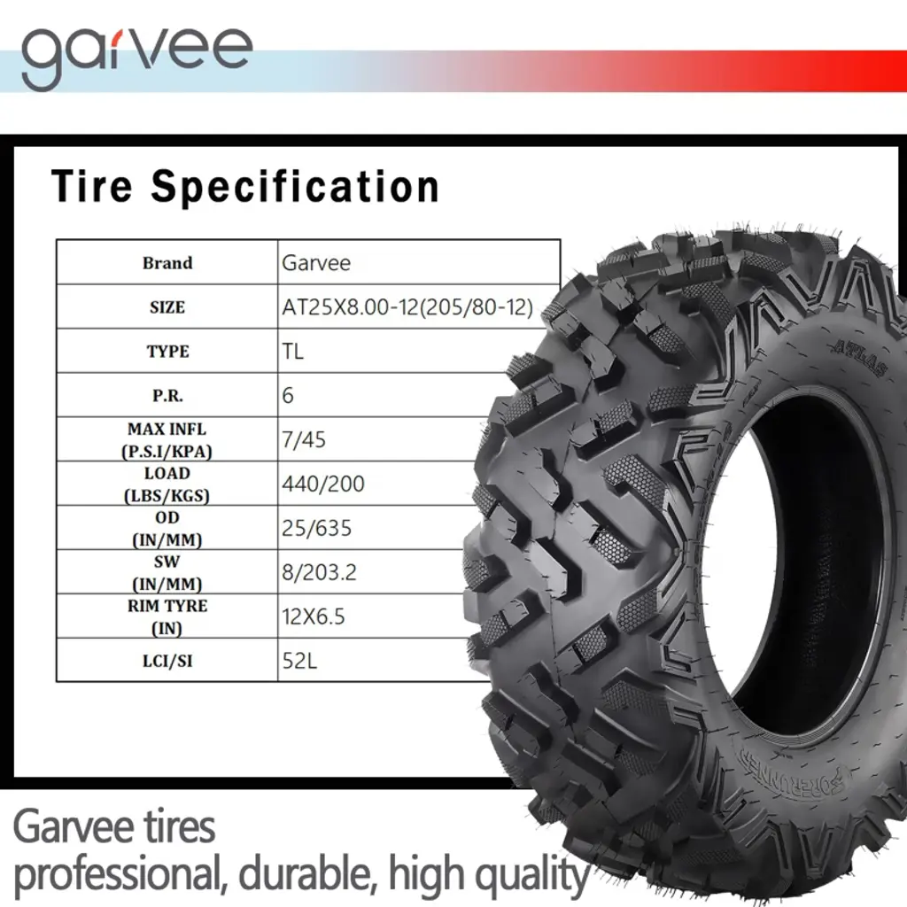 Garvee 25x8-12 6Pr Atv Tires, 25x8x12 All Terrain Atv Utv Off-road Tires(set Of 2, Tubeless)