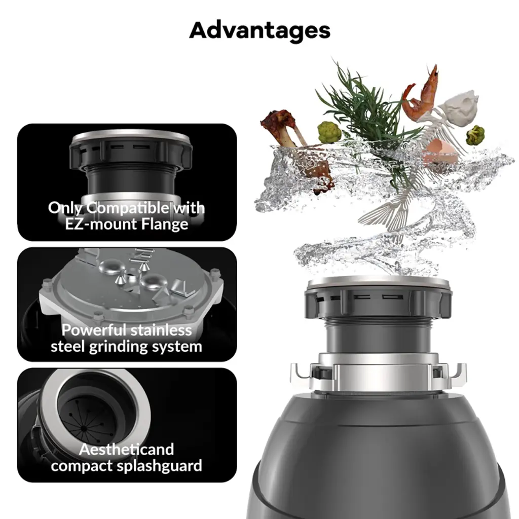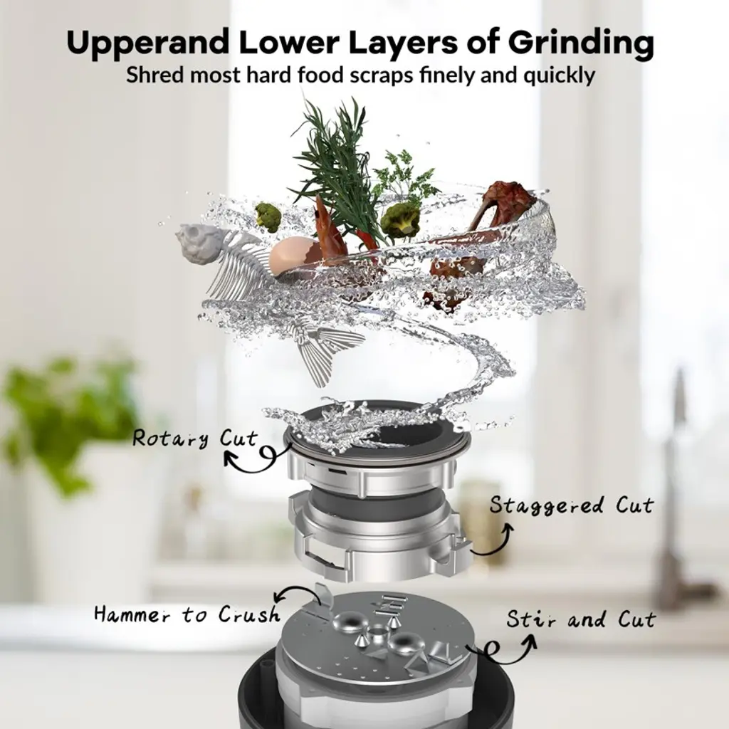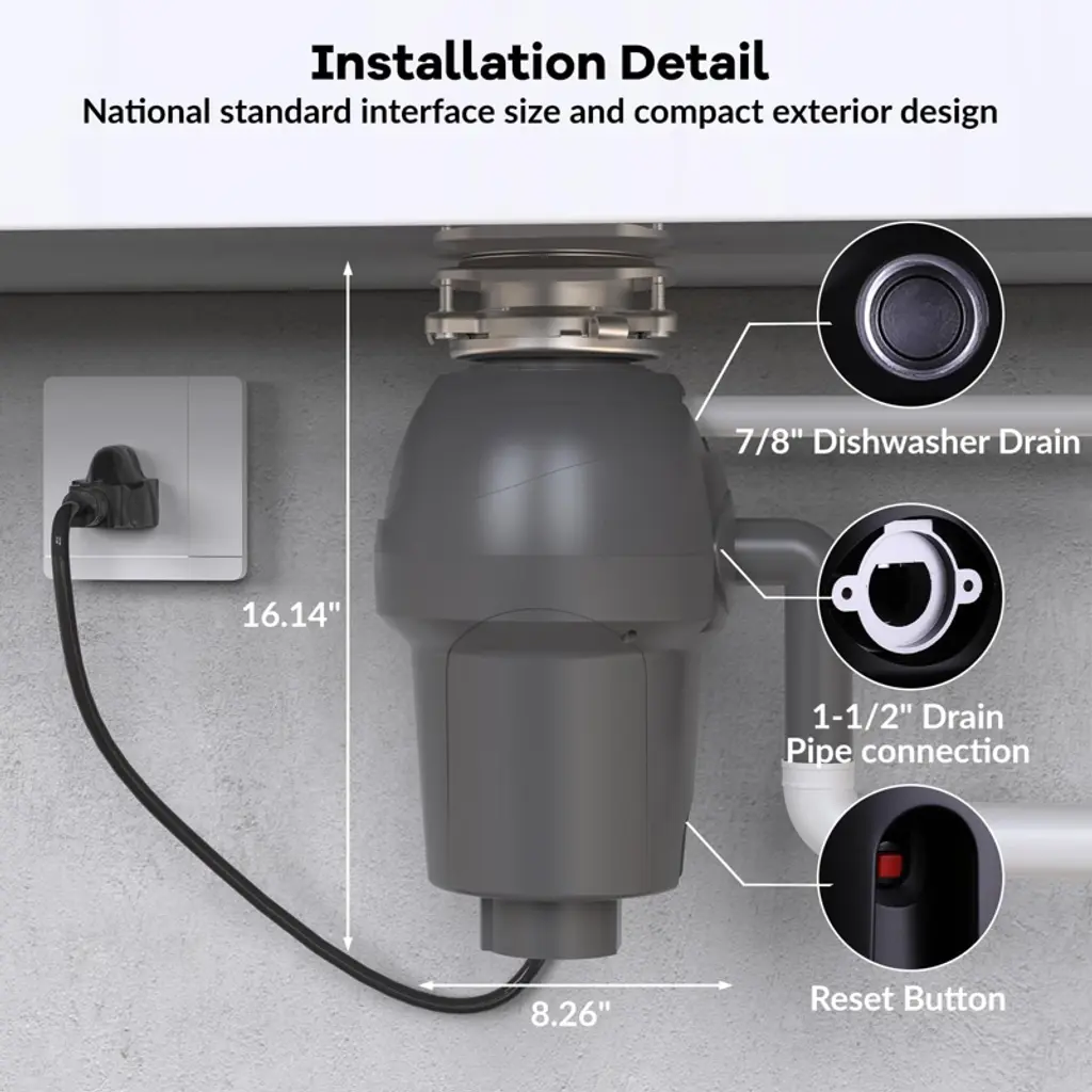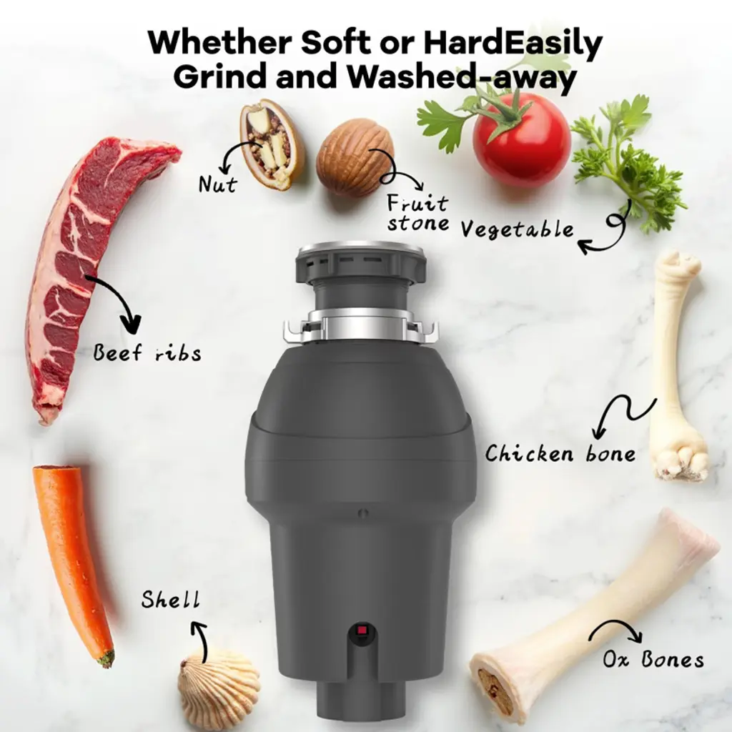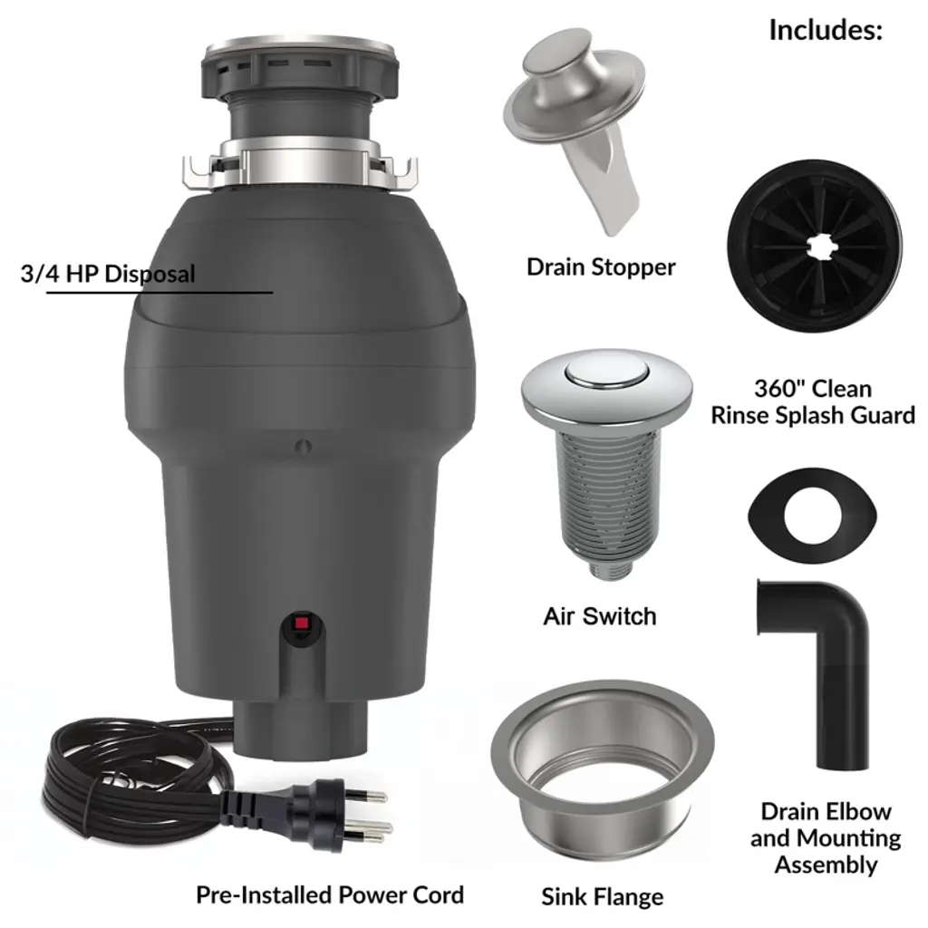 Say goodbye to hassle and hello to seamless waste disposal!Transform your kitchen experience with Garvee's continuous feed garbage disposal—where convenience meets efficiency. Effortlessly dispose of food scraps while enjoying a clean, odor-free kitchen with every meal.Highlights at a Glance:- Powerful and quiet permanent magnet motor with 3500 RPM for fine and quiet grinding.- Upper and lower grinding layers to shred hard food scraps quickly and finely.- Air switch kit for easy sink-top operation.- Continuous grinding with stainless steel components as long as power is supplied.- Exclusive 360° clean rinse eliminates odors by rinsing away food scraps around the sink.- Compact and lightweight design for easier installation and maximized space under the sink.Specification:Material: Stainless Steel + ABSSize: 7-3/4" x 13-7/16"Motor Power Options: 1 HP, 1/2 HP, 3/4 HPMotor Speed: 3500 RPMDishwasher Drain: 7/8" Drain Pipe connection: 1-1/2"Certification: ETLPacking List:1 x Garbage Disposal1 x Splash Guard1 x Drain Stopper1 x 90-Degree Elbow1 x Accessory Bag (Including Mounting Screws & Flange Seal)1 x Air Switch Kit1 x Installation ManualNote: If you have a septic system, avoid putting the following through the garbage disposal: stringy foods, egg shells, pasta, rice, potato peels, pits, oils, fats & coffee grounds.When using the continuous feed food waste disposer, always run water while adding food scraps to ensure effective grinding and prevent clogs.