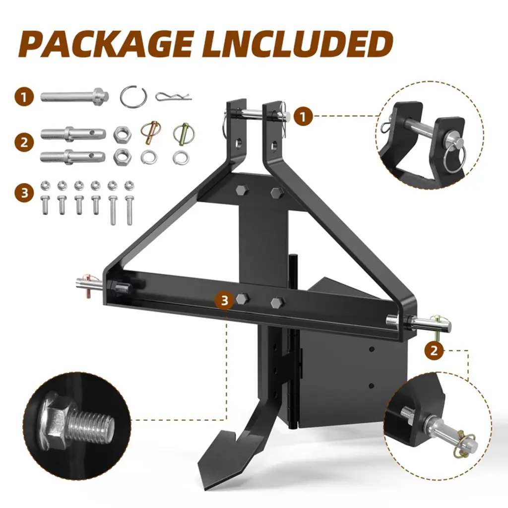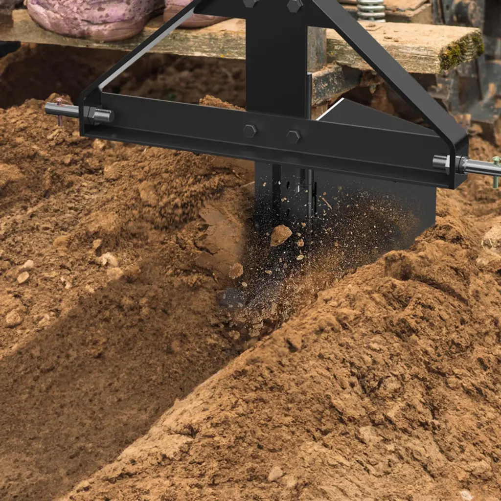 The middle buster is made of heavy-duty, high-quality carbon steel, ideal for trenching. Suitable for any season and a wide range of soils.The soil furrower is finished with a black powder coat and spray paint process to resist rust and reduce scratches. This means you can use it in any weather and never have to worry about your crop planting time being delayed.Compatible with Cat.-1 quick hitch, you can install our product on your tractor in minutes, for your safety, professional installation is recommended.