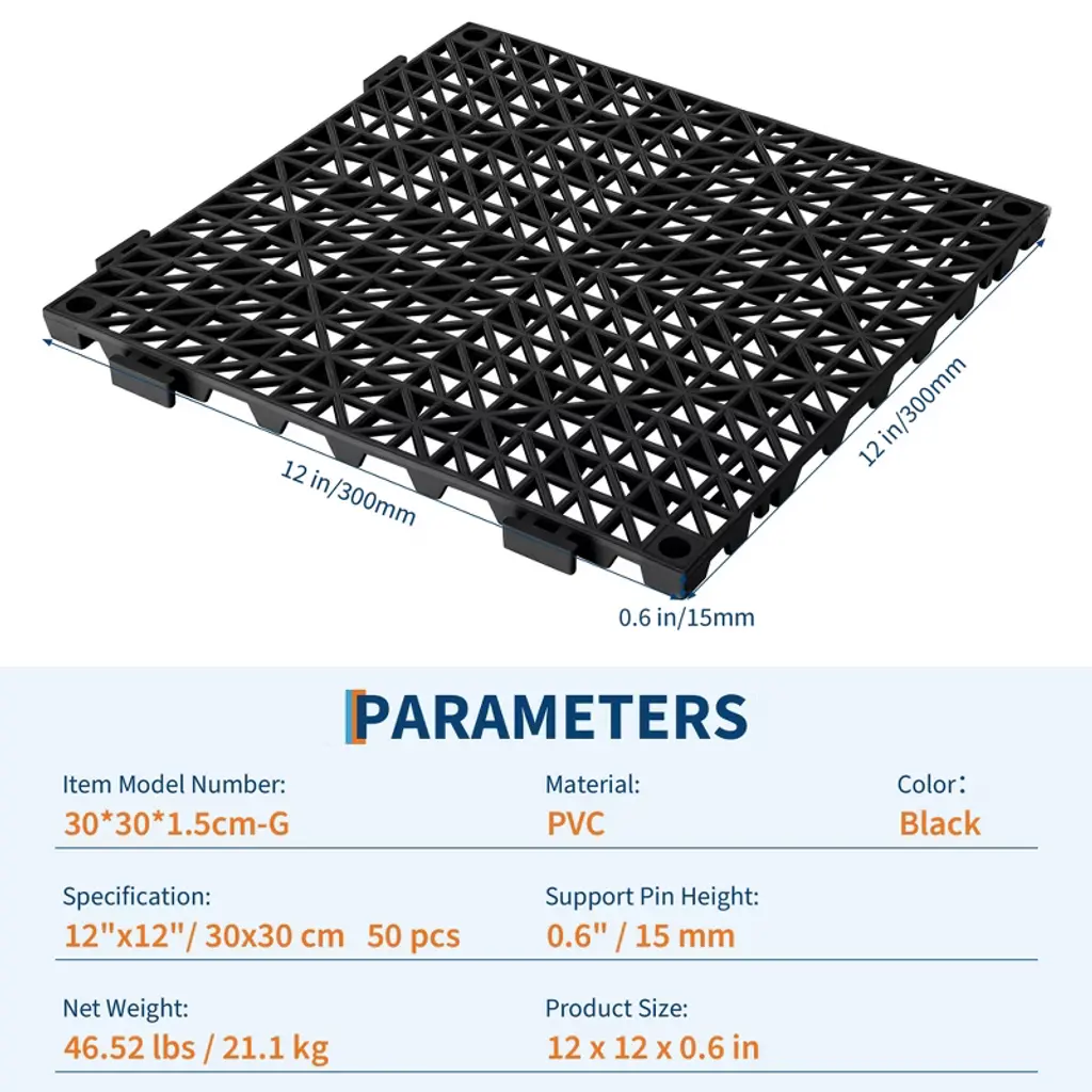 DescriptionName:Interlocking Drainage TilesColor:Black, GreySize:12 x 12 inches (per tile)Material:High-Quality PVCCapacity:50 pieces per set Features:Efficient drainage design with 0.55-inch support pinsSlip-resistant and waterproof surfaceEasy interlocking installation, no tools requiredDurable and easy to clean Package Includes:50 × Interlocking Drainage Tiles