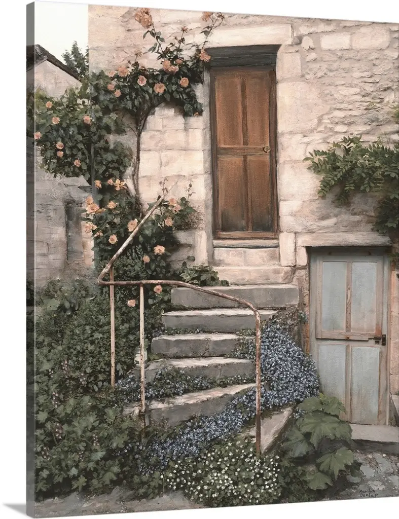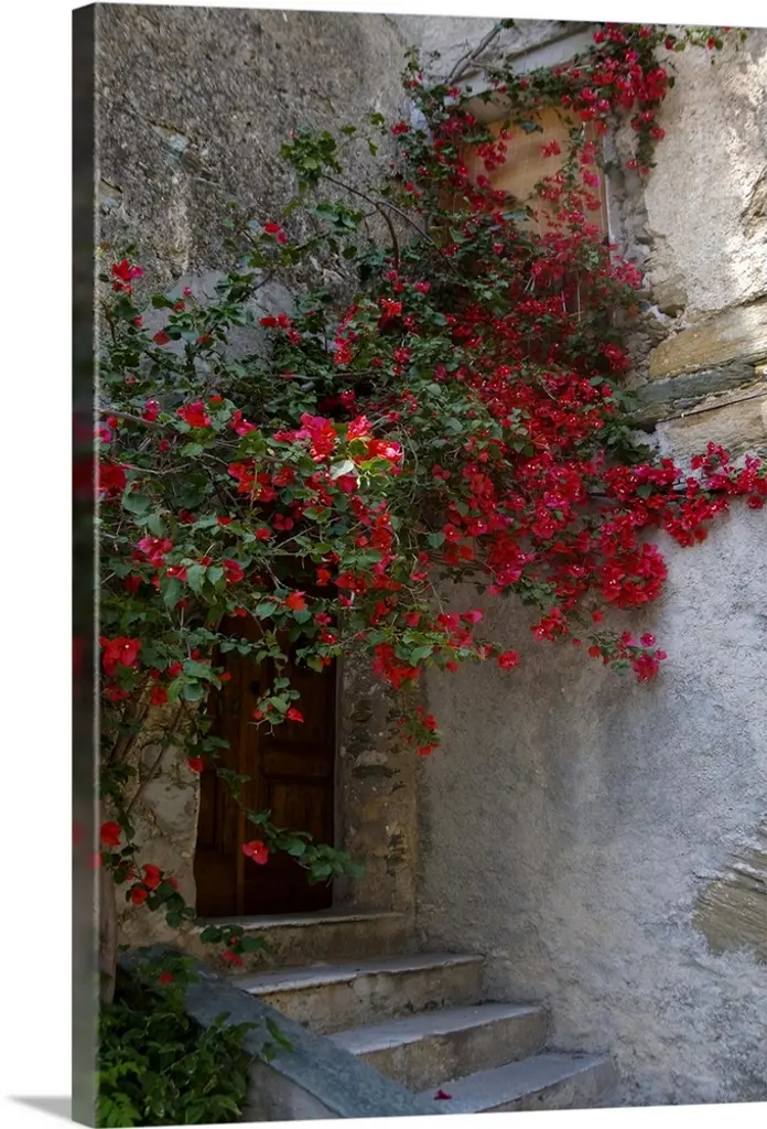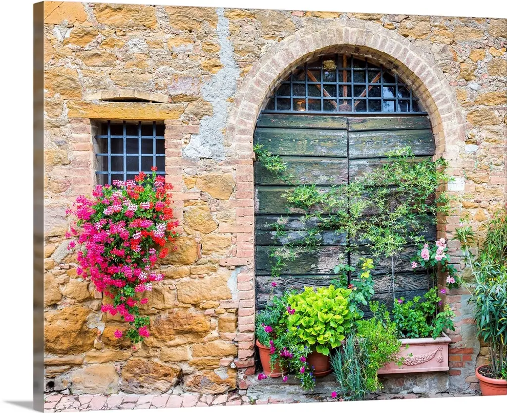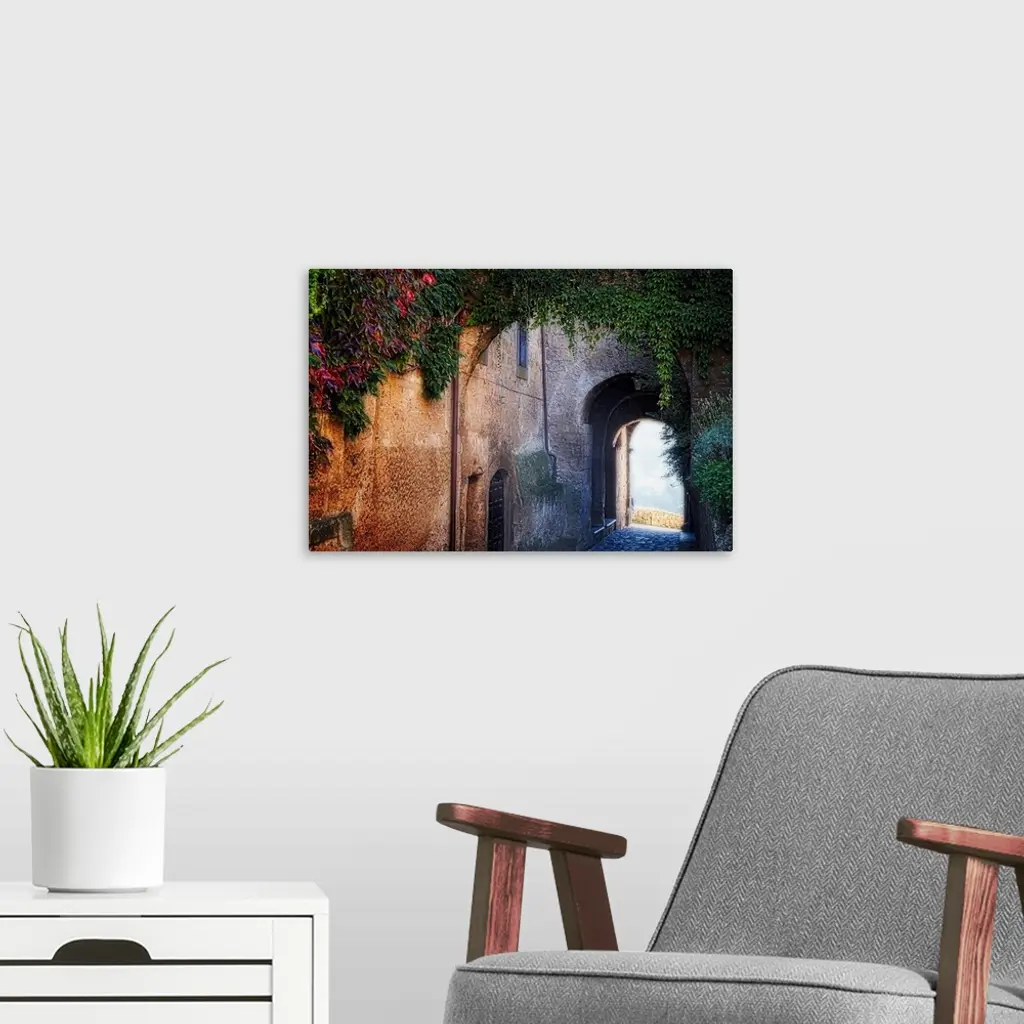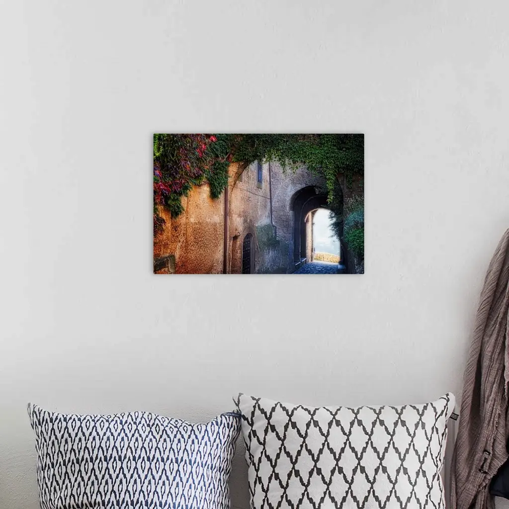Leafy vines hanging over a stone archway in an old alleyway in Viterbo, Italy.