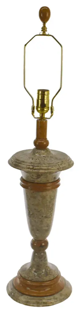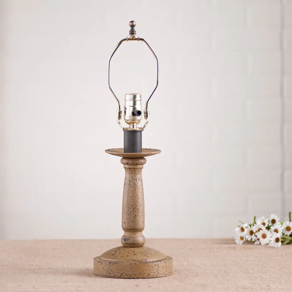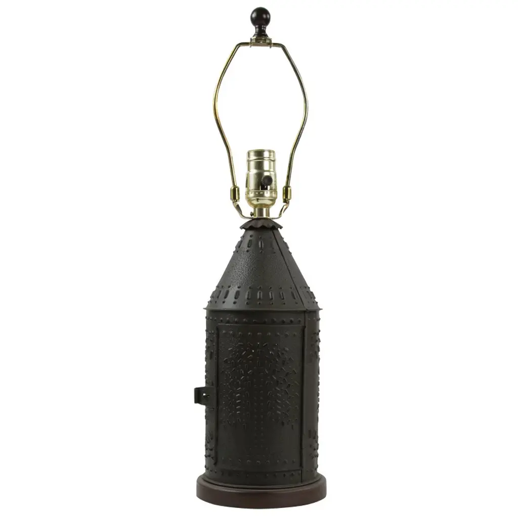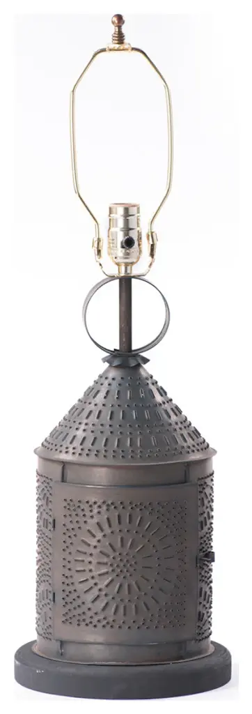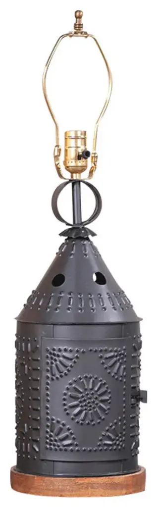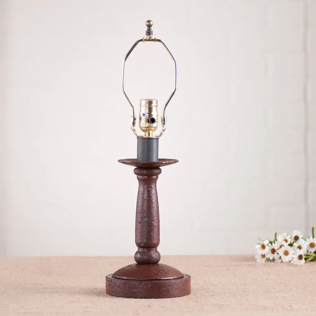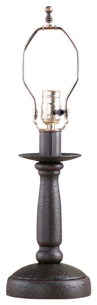 Measures 19.5-Inch high and 6-Inch diameterHas a 7-foot cord and line switch; Plugs into wall outlet; Standard socket, 1 x 150 watts maximum watts. UL listed for dry locationsHeavily distressed black over red painted finish; Shade not includedMade In USAA medium sized lamp base that will work well in your office, family room, or entryway. A neat looking lamp base with heavily textured painted finish. The shade is sold separately.One single E26/Medium (Standard) socket, 150 watts maximum. Hartford Black over Red body color. Handcrafted in Pennsylvania. This lamp base is UL-CUL approved and has a 5 year guarantee.