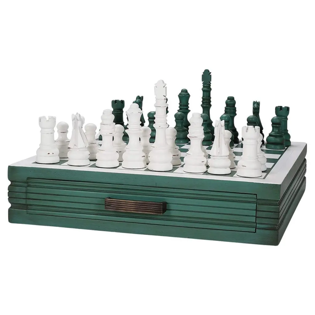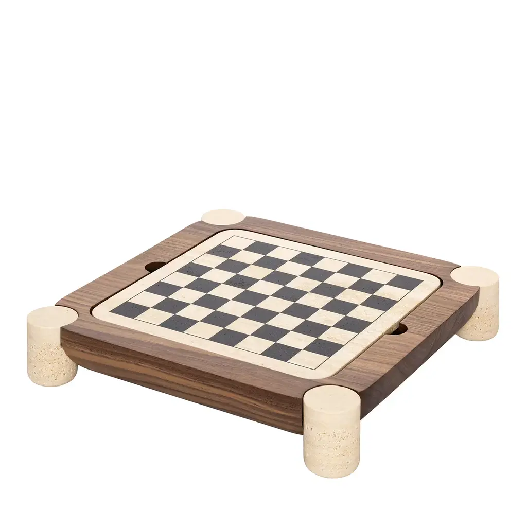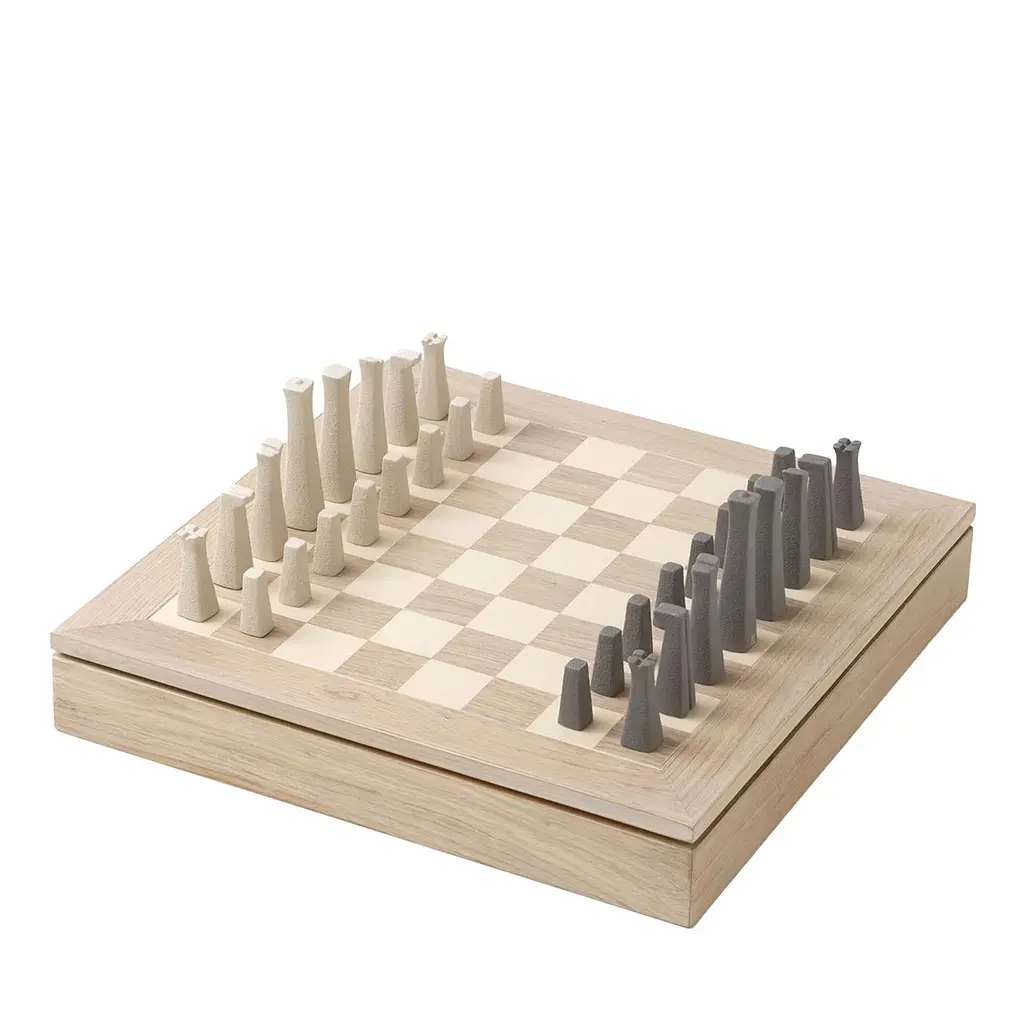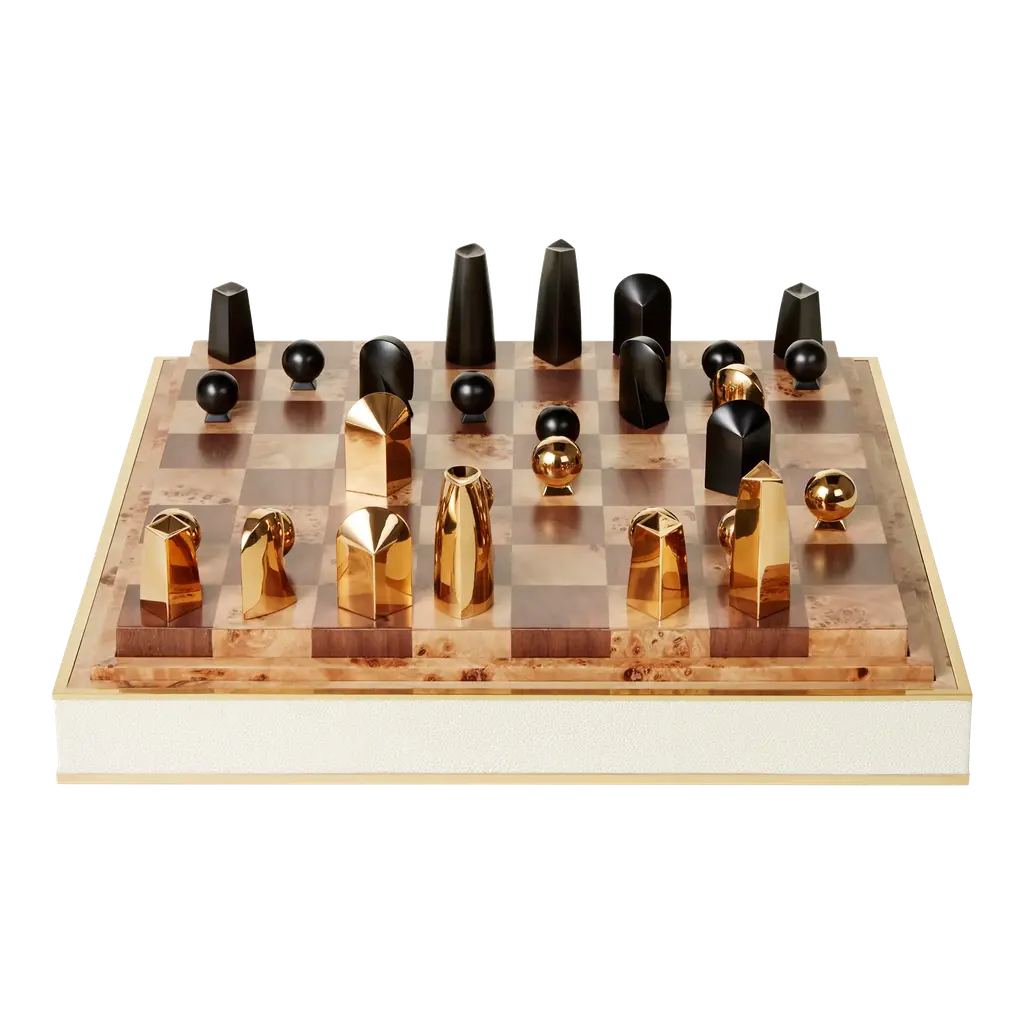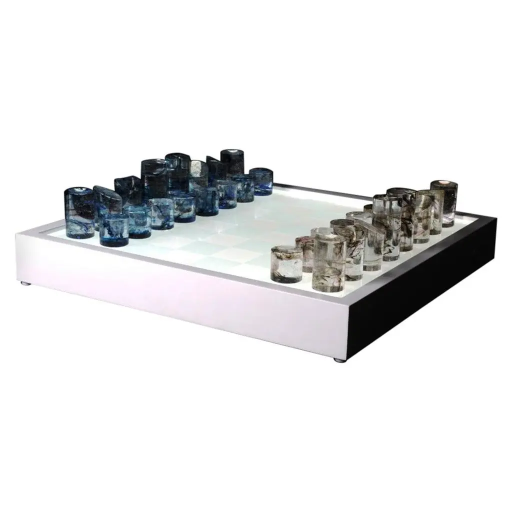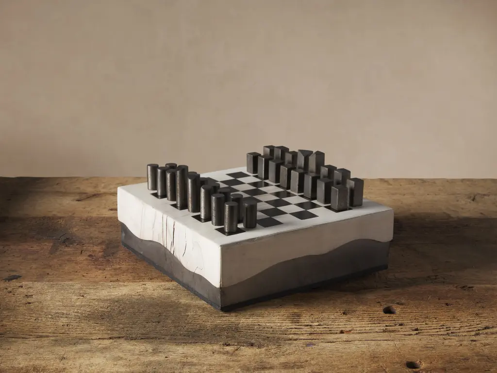 Striking chess set features honed Carrara marble and midnight black marble pieces on a Marquina black marble and Carrara marble board. CB2 exclusive.