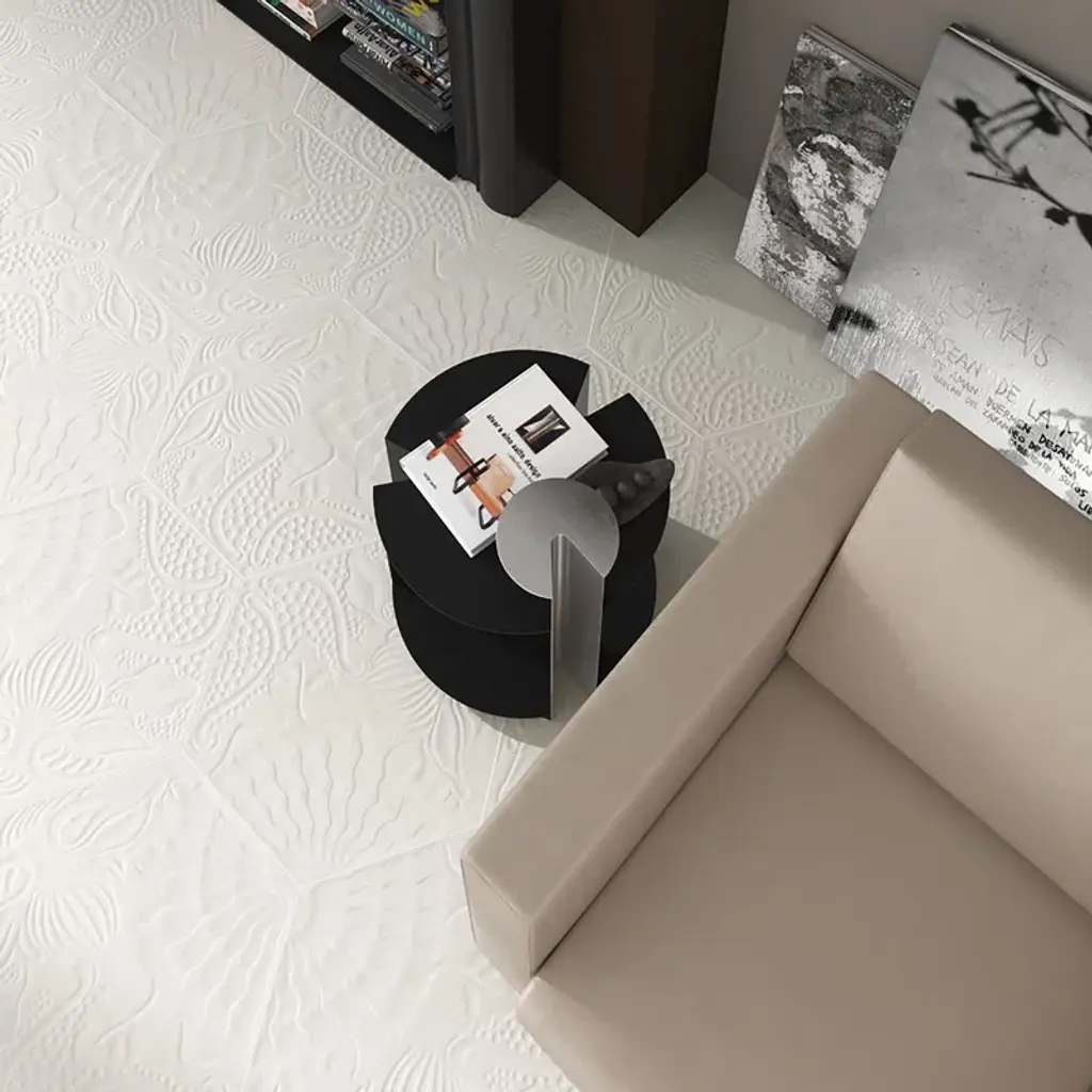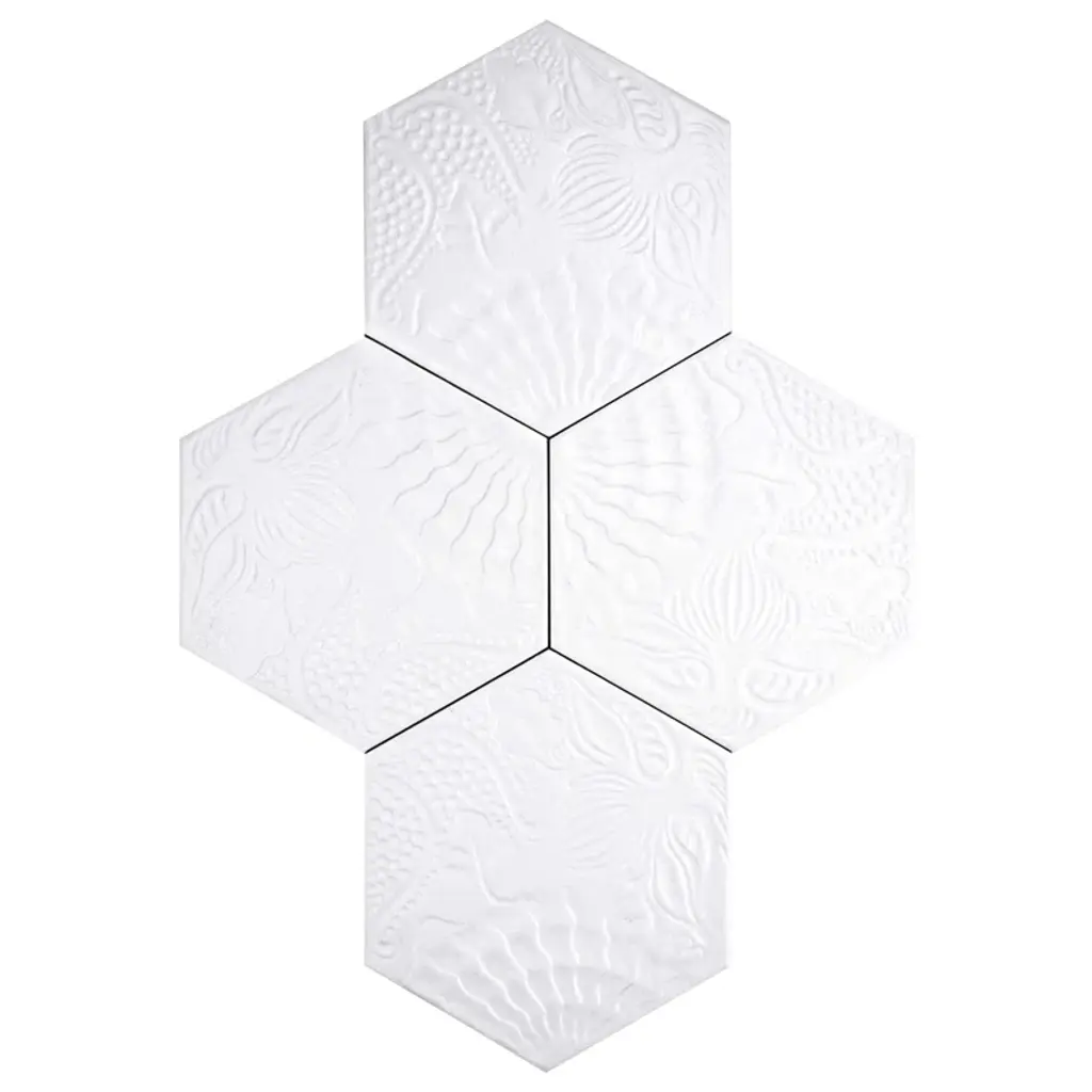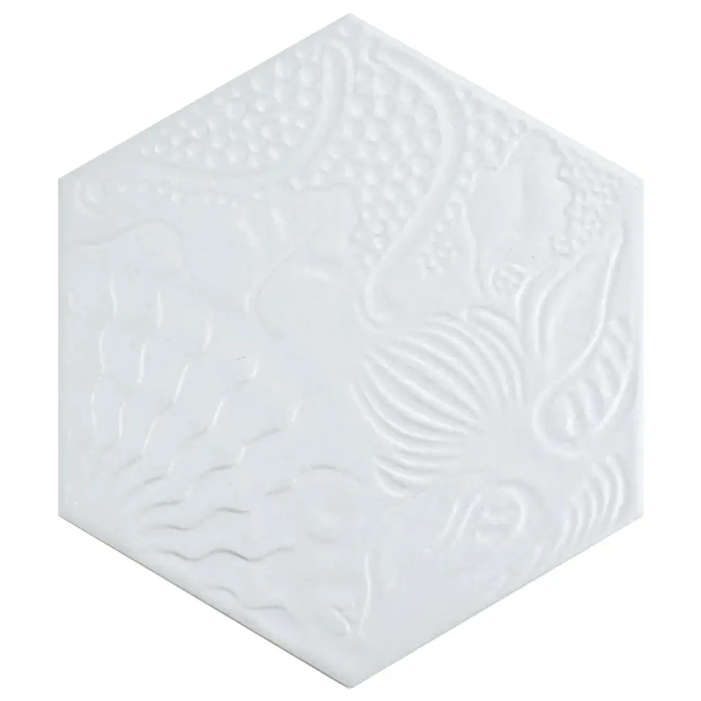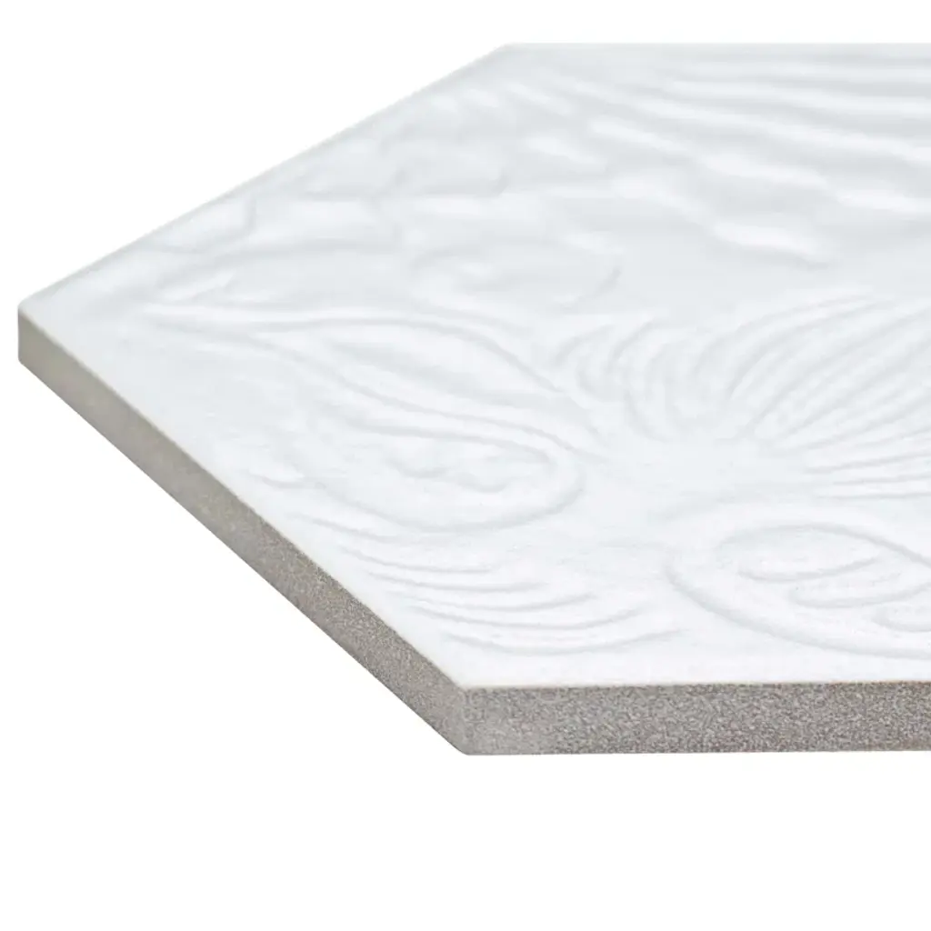 The hex porcelain floor and wall tile in white offer beautifully tranquil embossed designs that complement a variety of design styles. Inspired by nature, these dimensional designs complete three different patterns. The lace white glaze has a medium sheen which offers uniform color throughout. Use this porcelain tile in most residential interior or exterior settings.