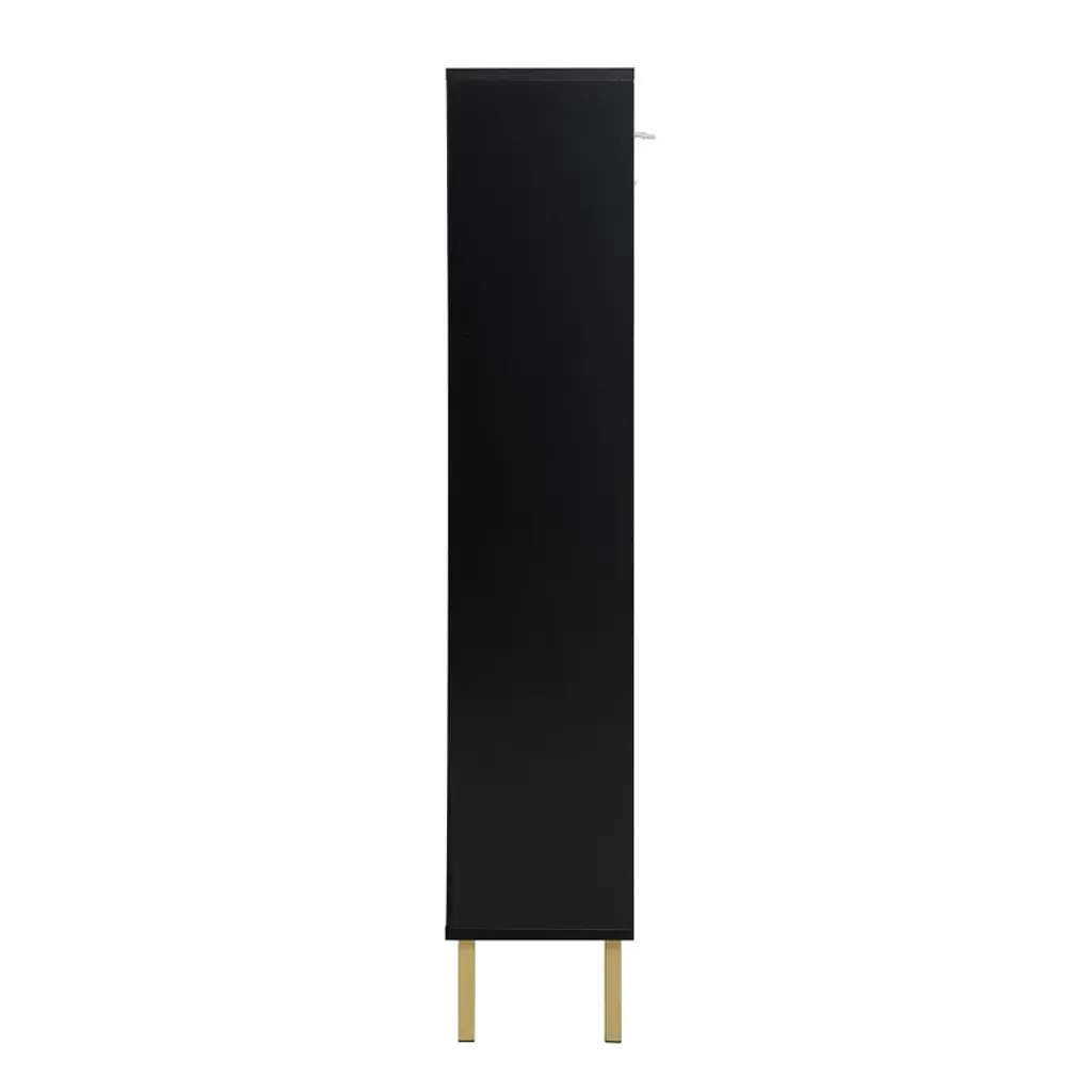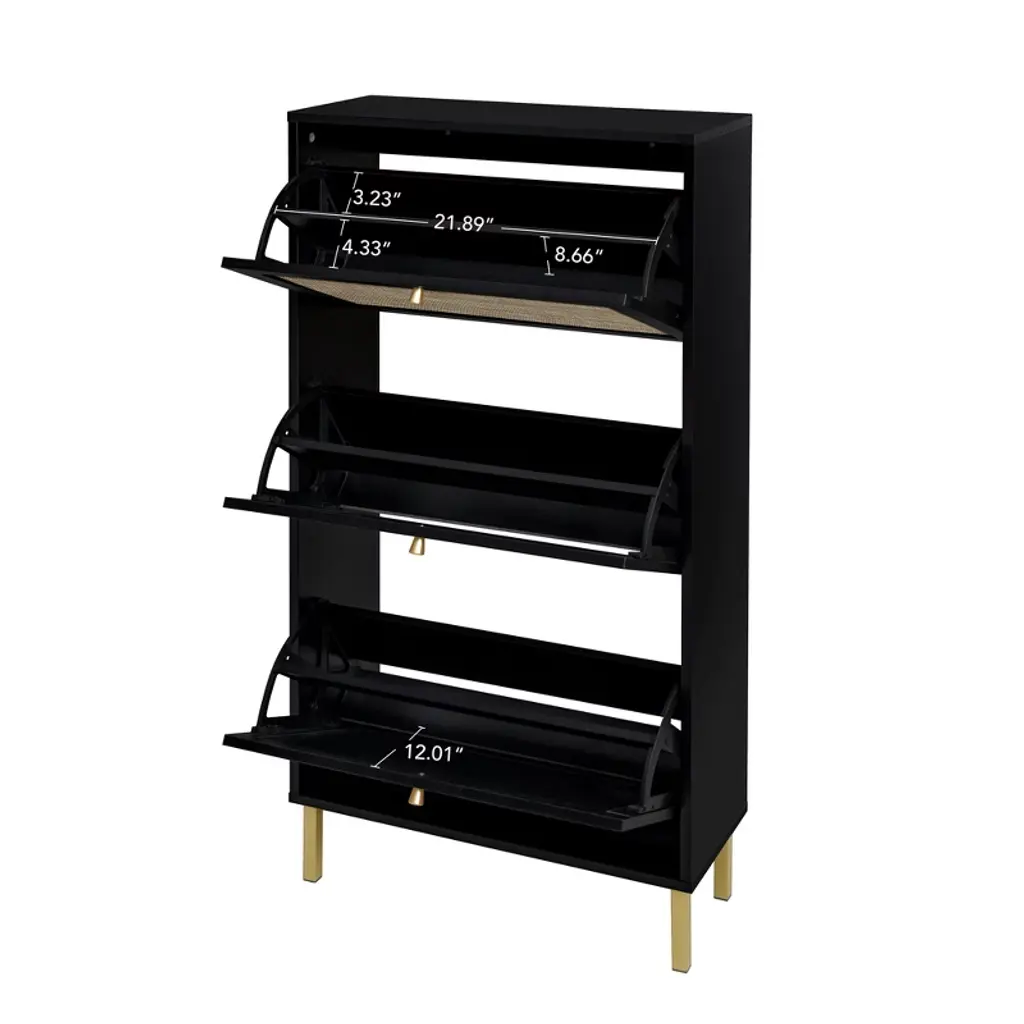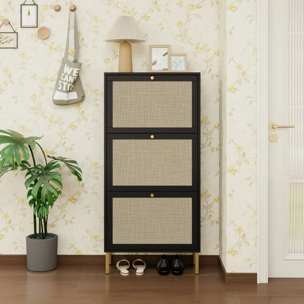 This modern shoe storage cabinet combines practicality and style with engineered rattan construction, gold handles, and a matte-textured metal base. Each layer offers two compartments for flexible shoe organization, helping keep your space tidy. The base can be wall-mounted with two feet or stand independently with four feet, while included foot pads protect floors. Moisture-proof and sun-resistant engineered rattan ensures long-lasting use with a smooth finish. Ideal for entryways, living rooms, studies, or porches, this cabinet is easy to assemble by one person. Material: Particle Board Door Material: Faux Rattan Base Material: Metal Frame Finish: Black Assembly Required Dimensions: 9.25 inches deep x 23.62 inches wide x 48.98 inches high